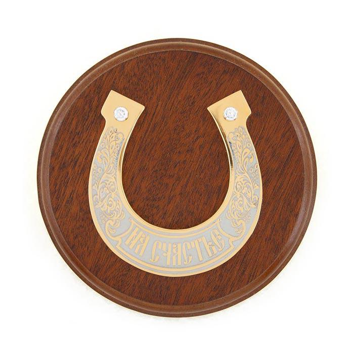 Панно на тарелке "подкова на счастье". Вес 700 г Размер диаметр 12 см, толщина 1,5 см Материал дерево, латунь, никель, покрытие золотом (999,9)  развернуть описание ▼