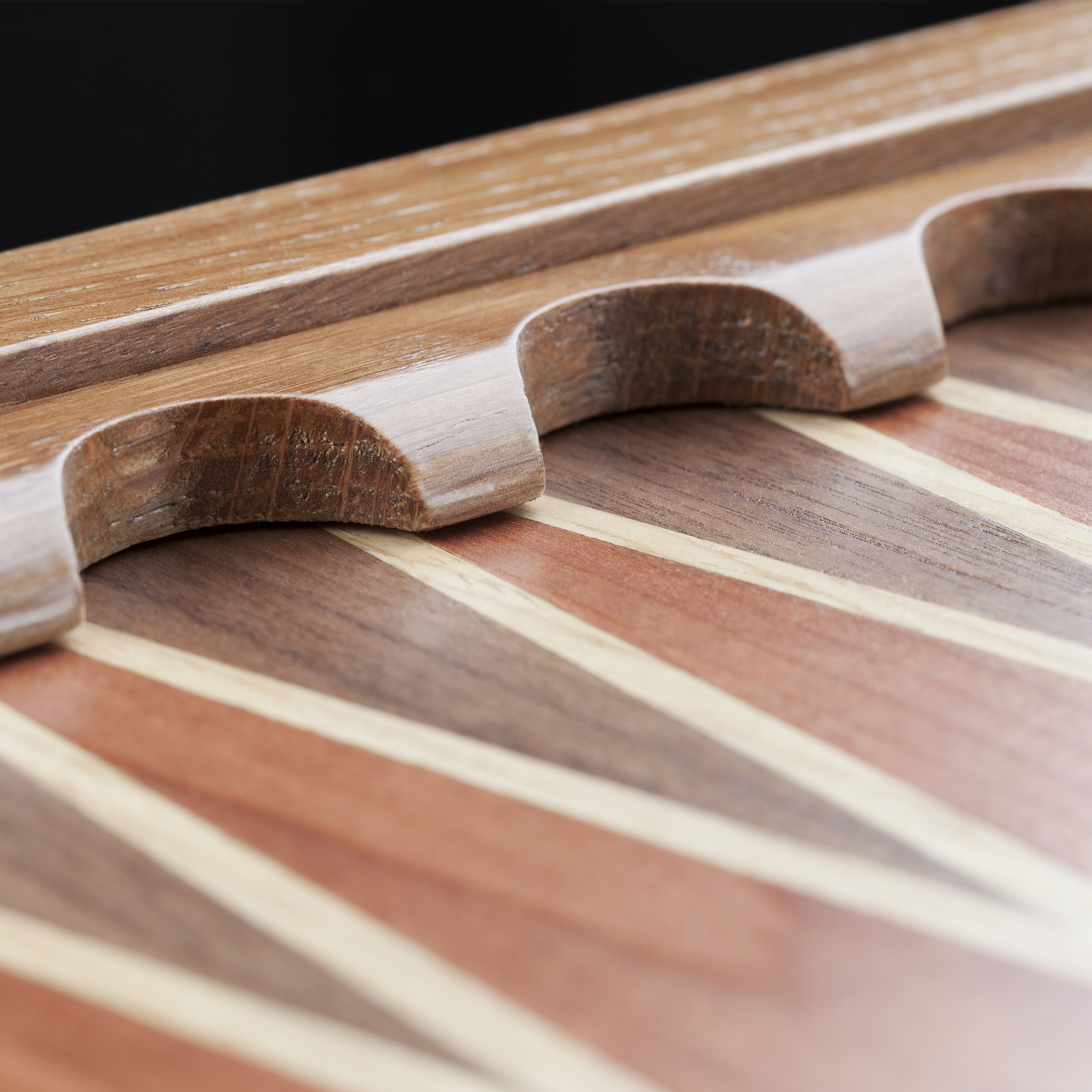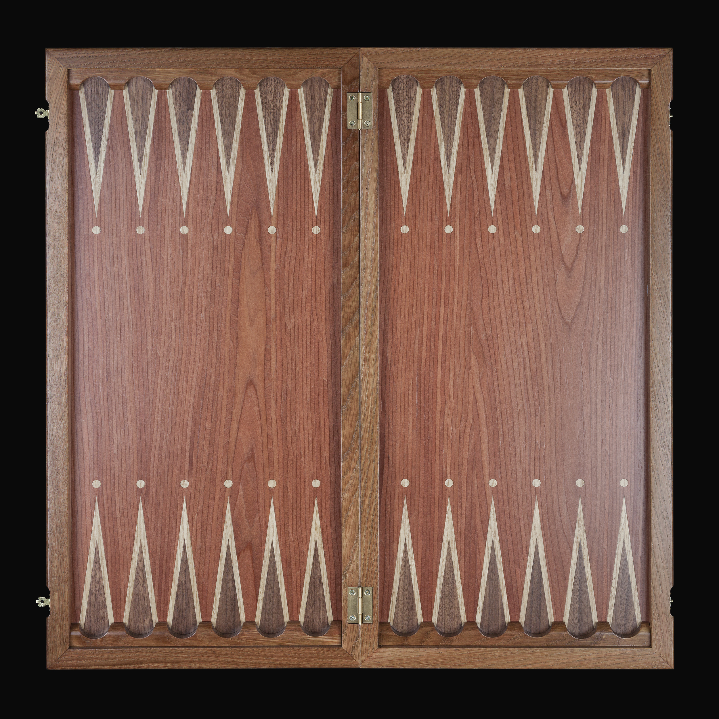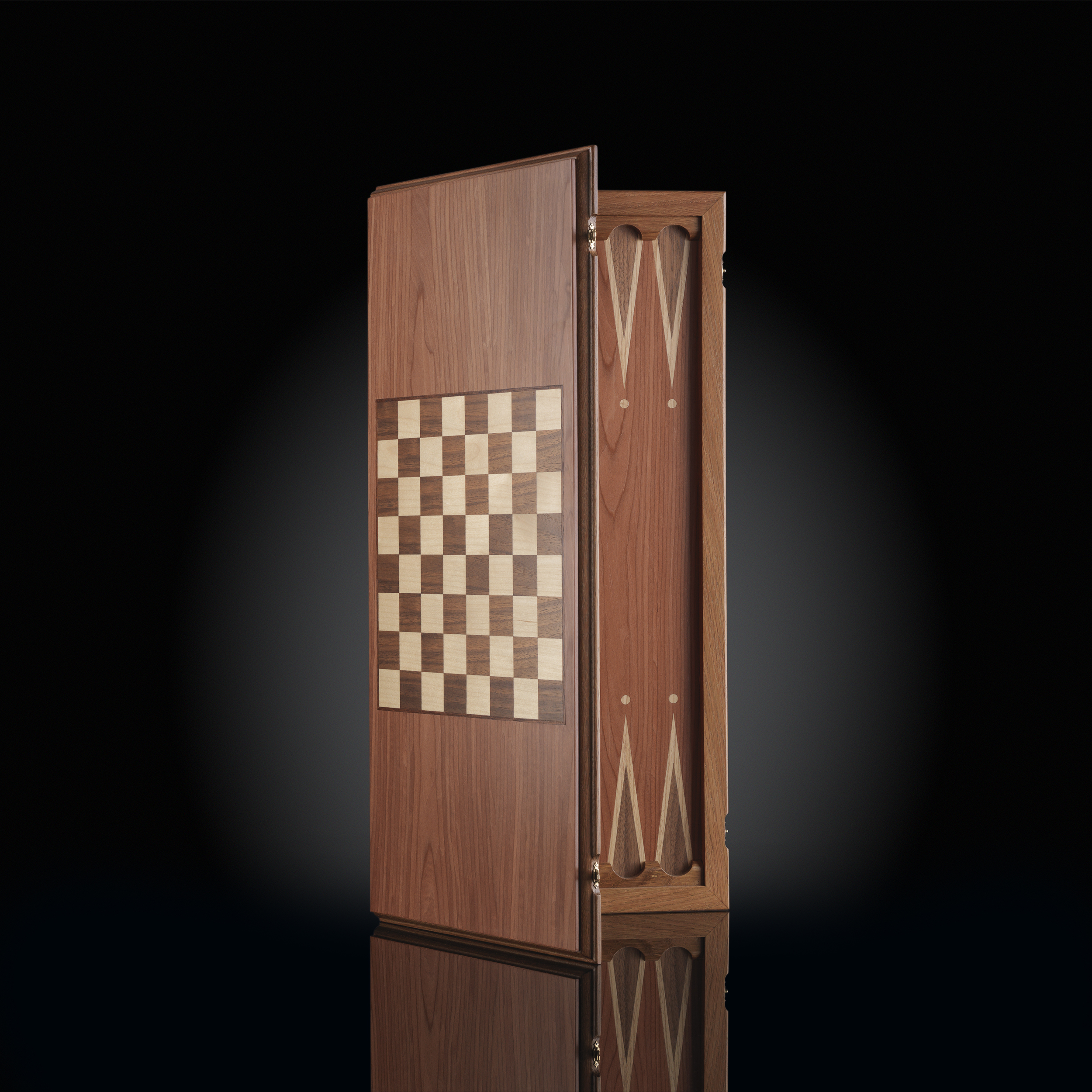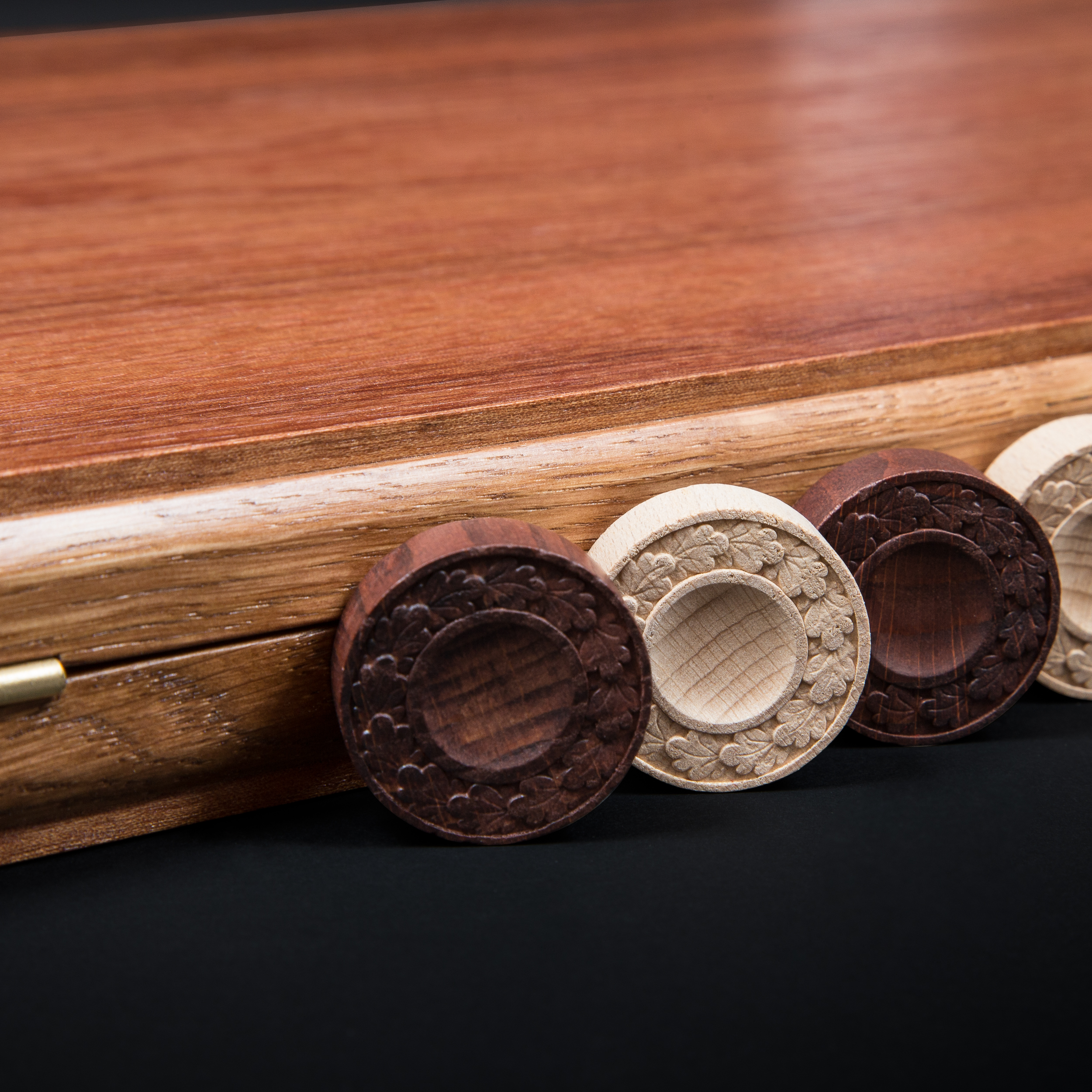 Нарды-шашки (два в одном) темный корпус kadun. корпус полевой дуб, шелковисто-матовый лак, рисунок в технике маркетри( мозаика ) лицевая сторона – полевой дуб, красное дерево поле внутри - полевой дуб, красное дерево, бук шашки светлые - бук, темные - бук тонированный, подклеены тканью. кубики - пластик Размеры в сложенном виде длина 60см ширина 30см в раскрытом виде длина 60см ширина 60см шашки ручной работы диаметром 30мм, 30шт кубики грань 12мм 2шт