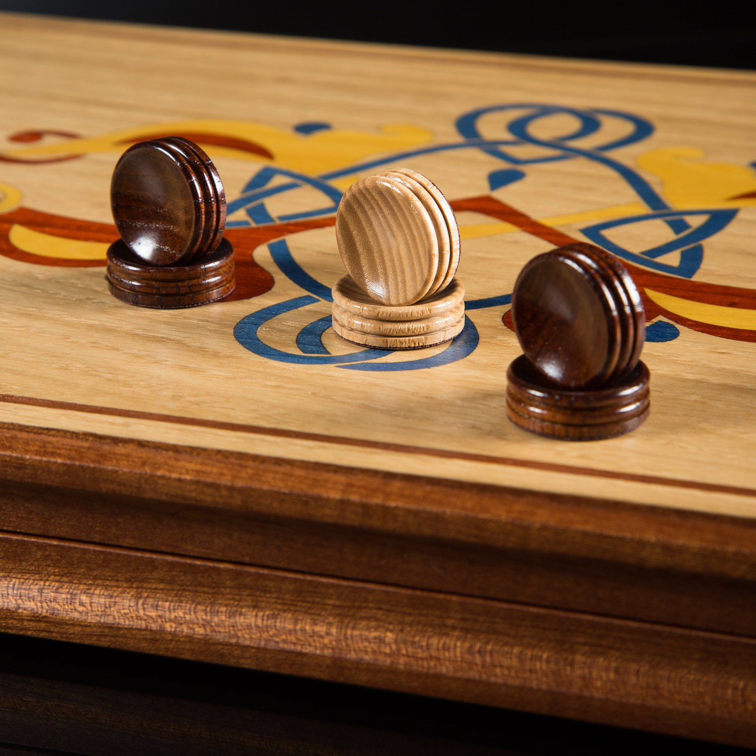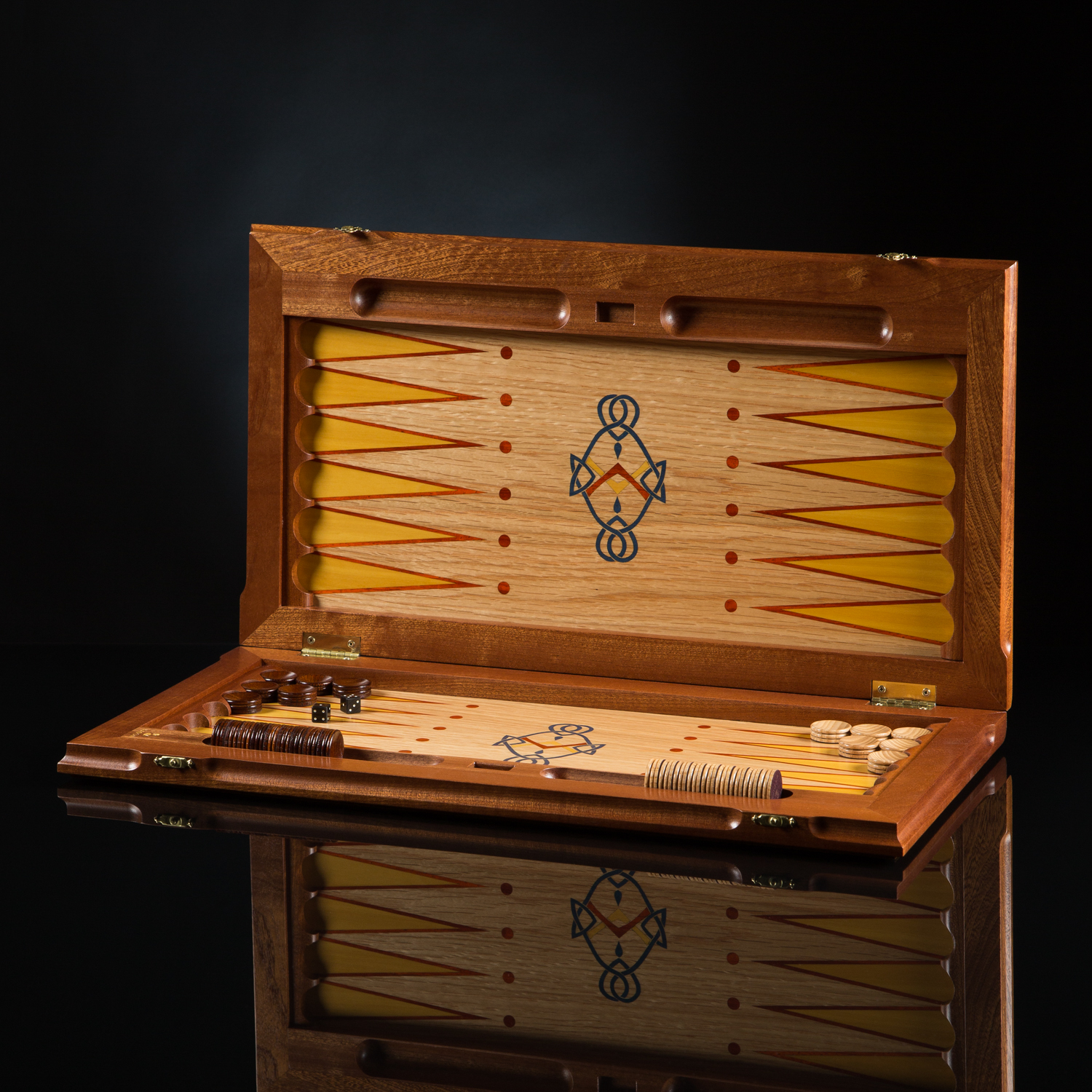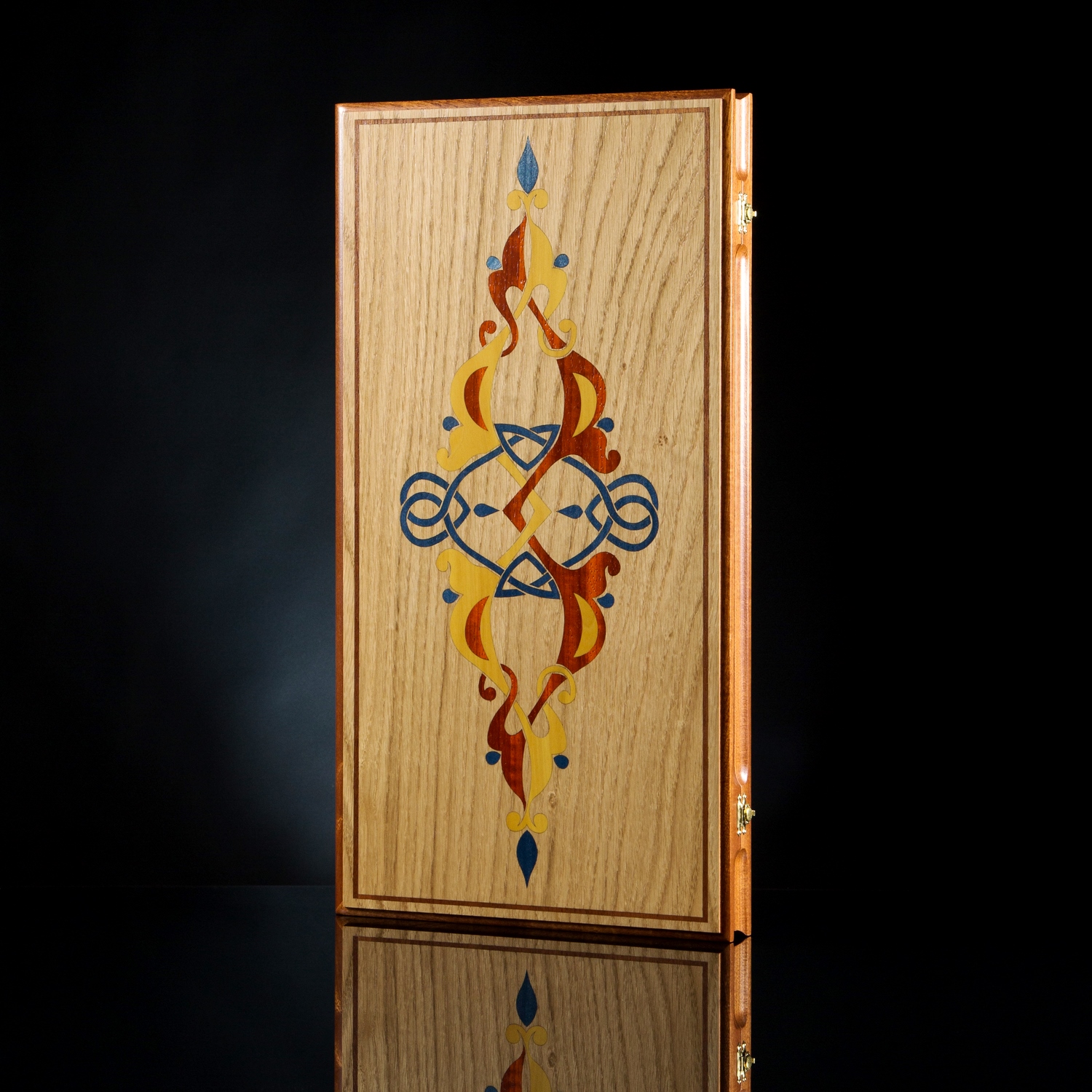 Нарды "армения" (поле из ясеня) kadun. Конструкция доски с баром для шашек корпус - сапеле, рисунок в технике маркетри( мозаика ) лицевая сторона – ясень, ироко, амарант, тюльпановое дерево,падук отделка - шелковисто-матовый лак поле внутри - ясень,тюльпановое дерево, падук шашки светлые - ясень, темные - ясень тонировка, подклеены сувенирным замшем. кубики - пластик Размеры в сложенном виде длина 51см ширина 27см шашки ручной работы диаметром 26мм 30шт кубики грань 11мм 2шт Комплектация Нарды, шашки, кубики, подарочная упаковка из натурального льна ручной работы.