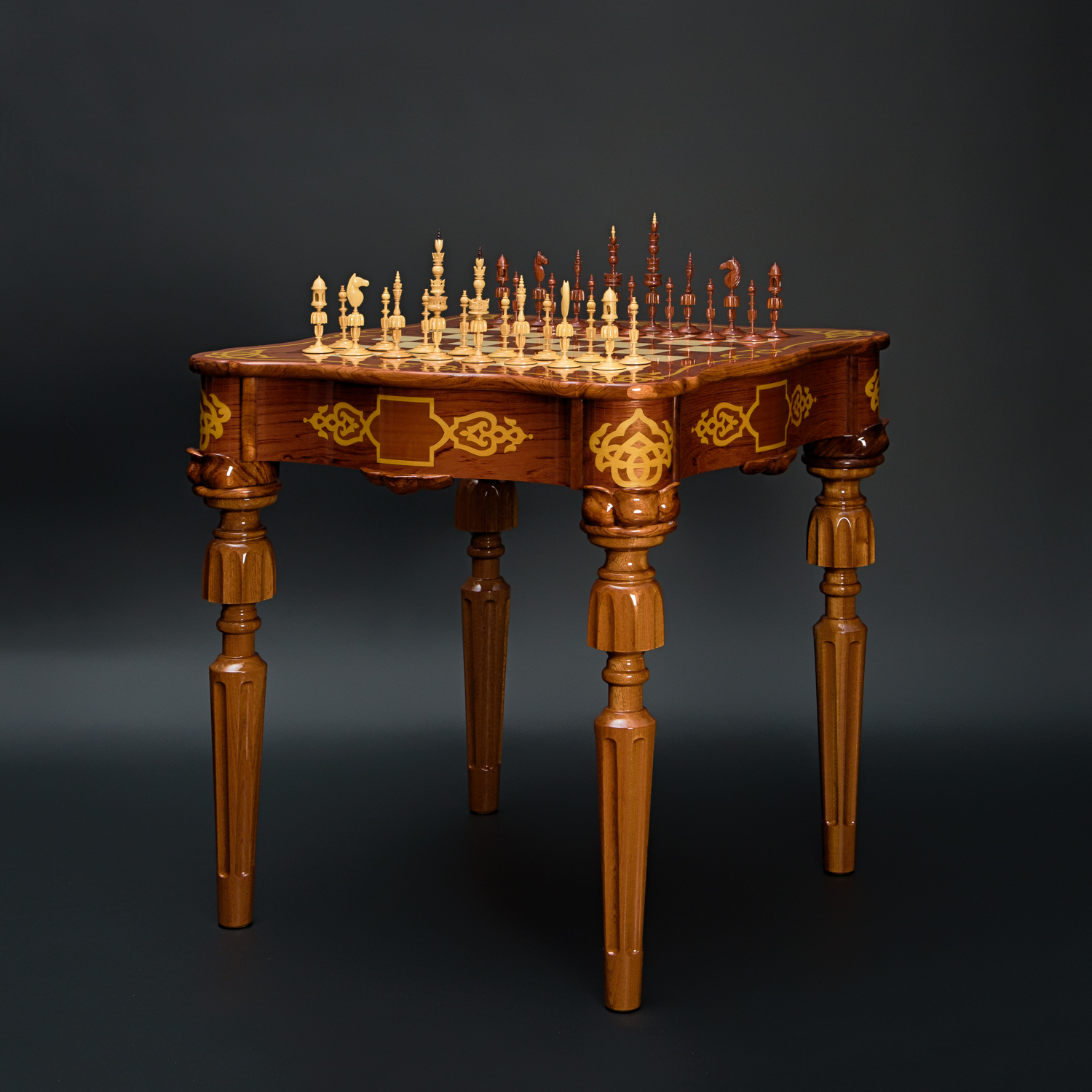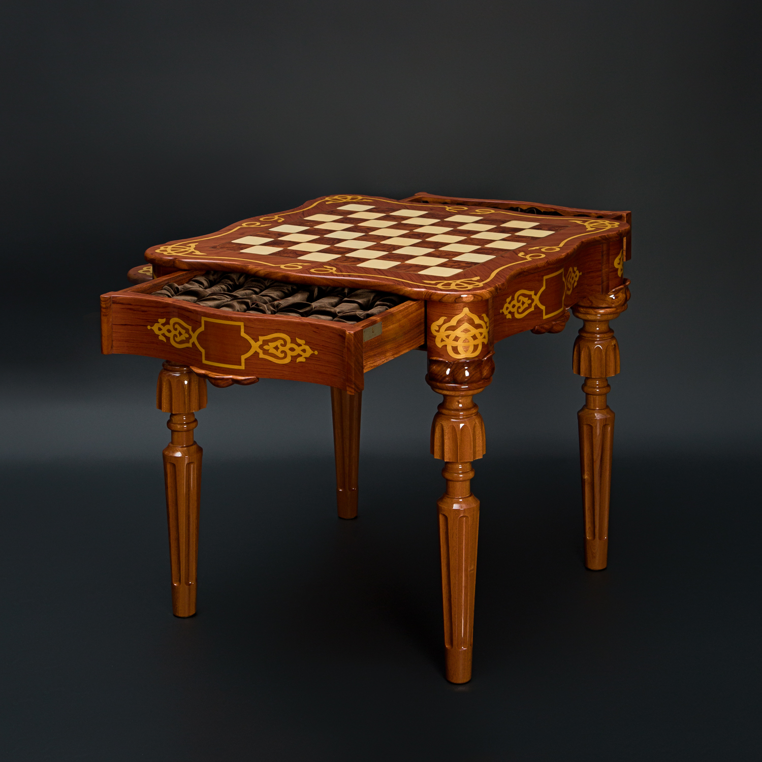Шахматный стол в стиле барокко с фигурами селенус аристократ каdun. Стол эксклюзивного дизайна от KADUN. Предназначен для игры в шахматы, комплект фигур расположен внутри в мягком ложементе. Размер столешницы 65см на 65см. Материалы - бубинга, карельская береза, падук, орех, корень ореха, корень вишни, венге. Шахматный комплект фигур Селенус Аристократ фигуры светлые – колхидский самшит, глянцевый лак фигуры темные - бубинга, глянцевый лак все с утяжелением, основания подклеены замшем. король – высота 13см диаметр подставки 4см пешка – высота 6,5см диаметр подставки 3,5см доска – клетка 5,5см