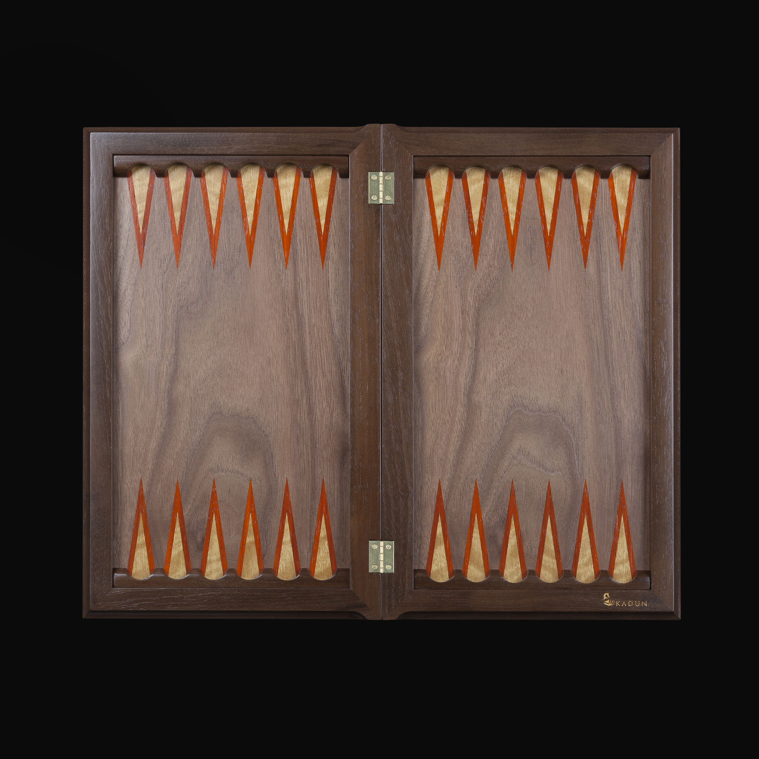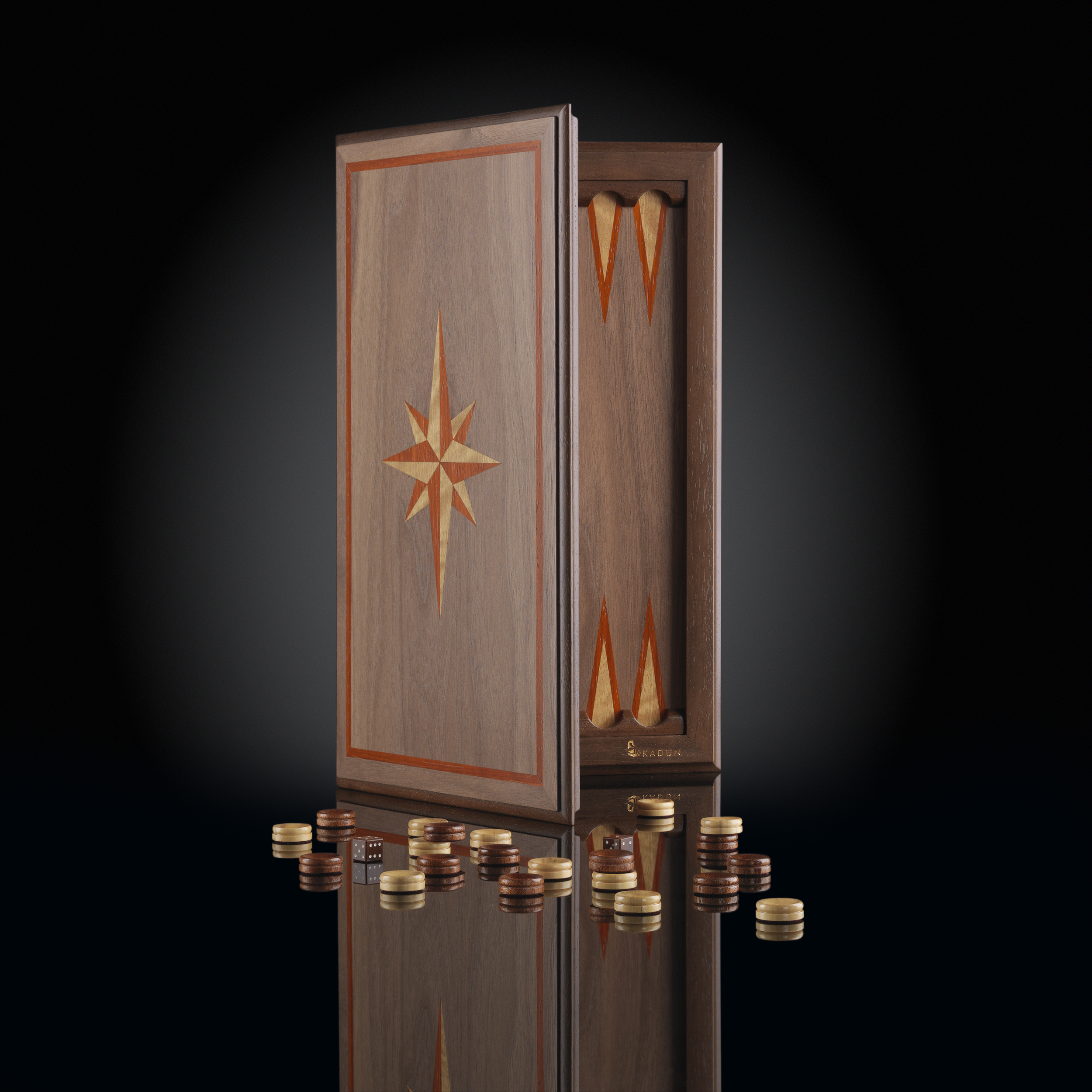 Нарды "книга элит" из ореха kadun. корпус - орех, шелковисто-матовый лак, рисунок в технике маркетри( мозаика ) замки – потайные магниты лицевая сторона – орех, падук, лимонное дерево игровое поле внутри - орех, падук, лимонное дерево шашки светлые - колхидский самшит, темные - красное дерево, подклеены замшем. кубики - обсидиан Размеры в сложенном виде длина 34см ширина 21см в раскрытом виде длина 34см ширина 42см шашки ручной работы диаметром 18мм 30шт кубики грань 10мм 2шт
