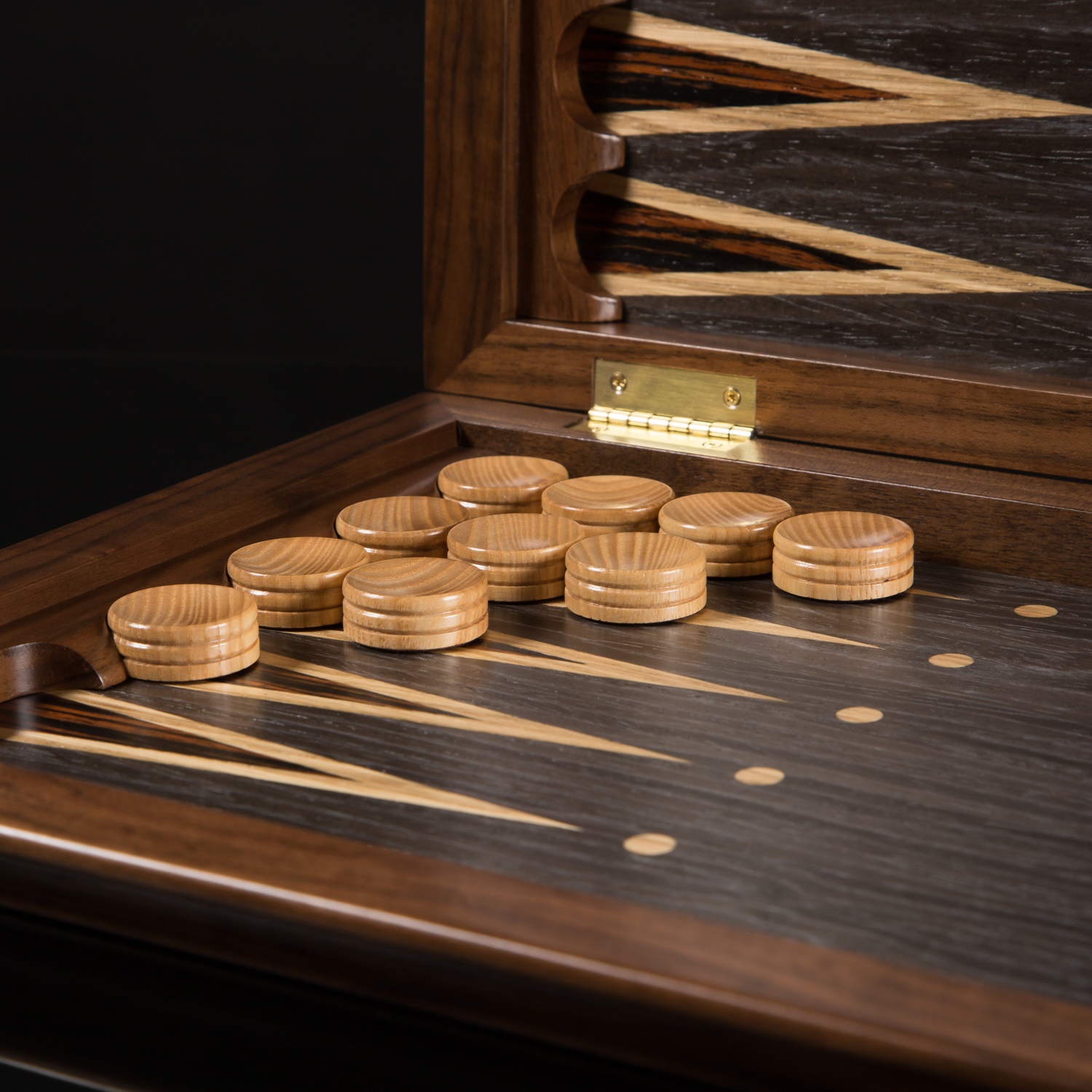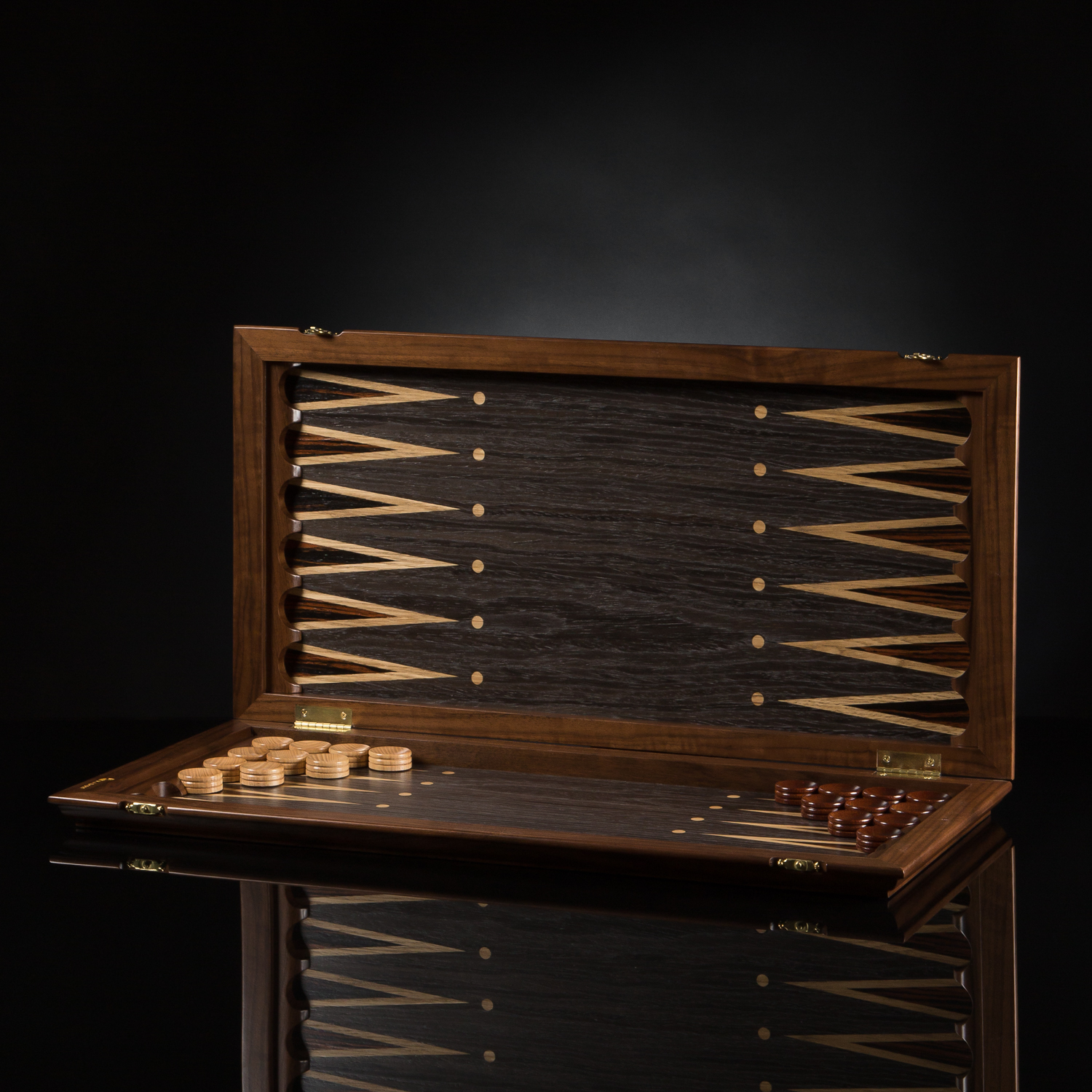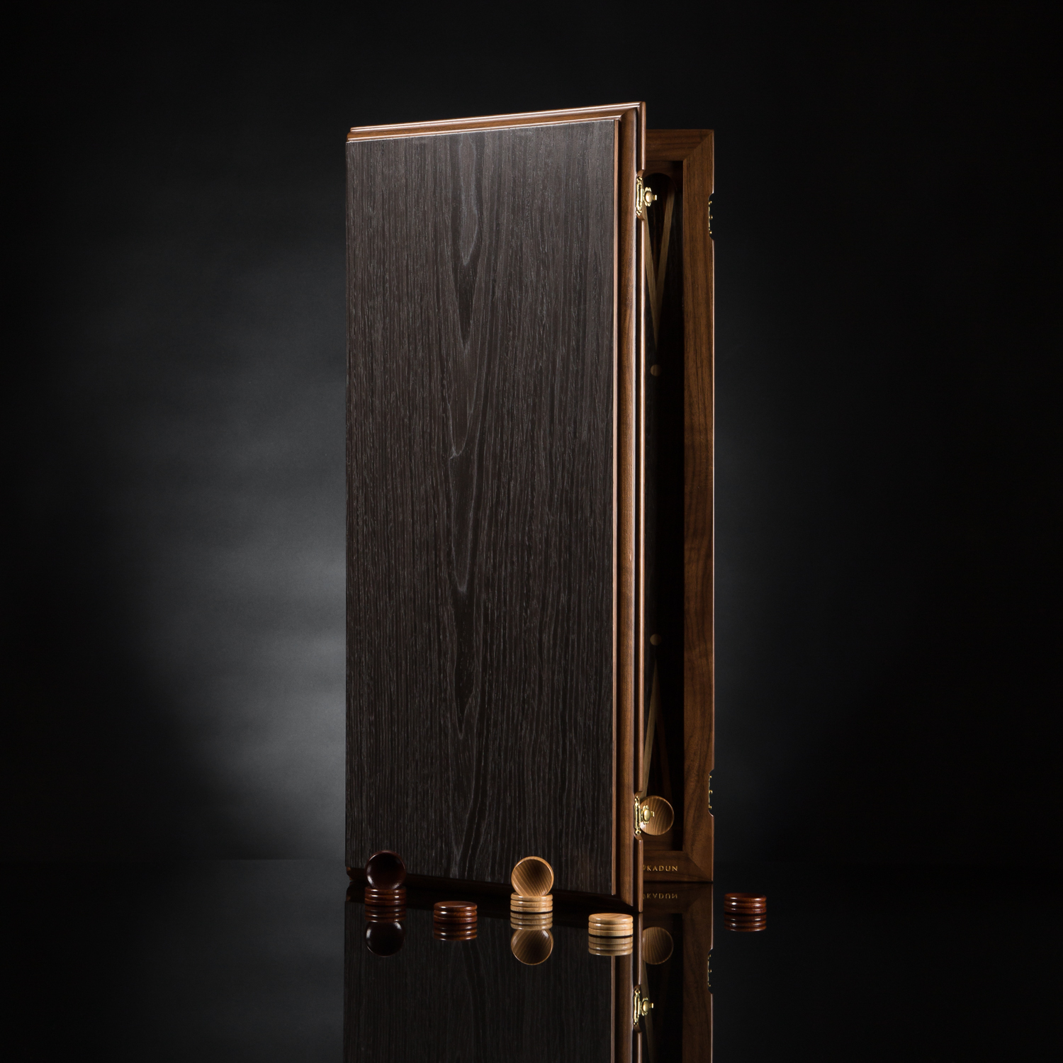 Нарды черный принц kadun. ручная работа, корпус перуанский орех, шелковисто-матовый лак, рисунок в технике маркетри (мозаика) лицевая сторона – черный абрикос игровое поле внутри - черный абрикос , ясень, макассар шашки светлые - ясень, темные - ясень тонированный , подклеены замшей. кубики - арамит Размеры в сложенном виде длина 52,5 см ширина 25 см в раскрытом виде длина 55 см ширина 50 см шашки ручной работы диаметром 27мм 30шт кубики грань 11мм 2шт