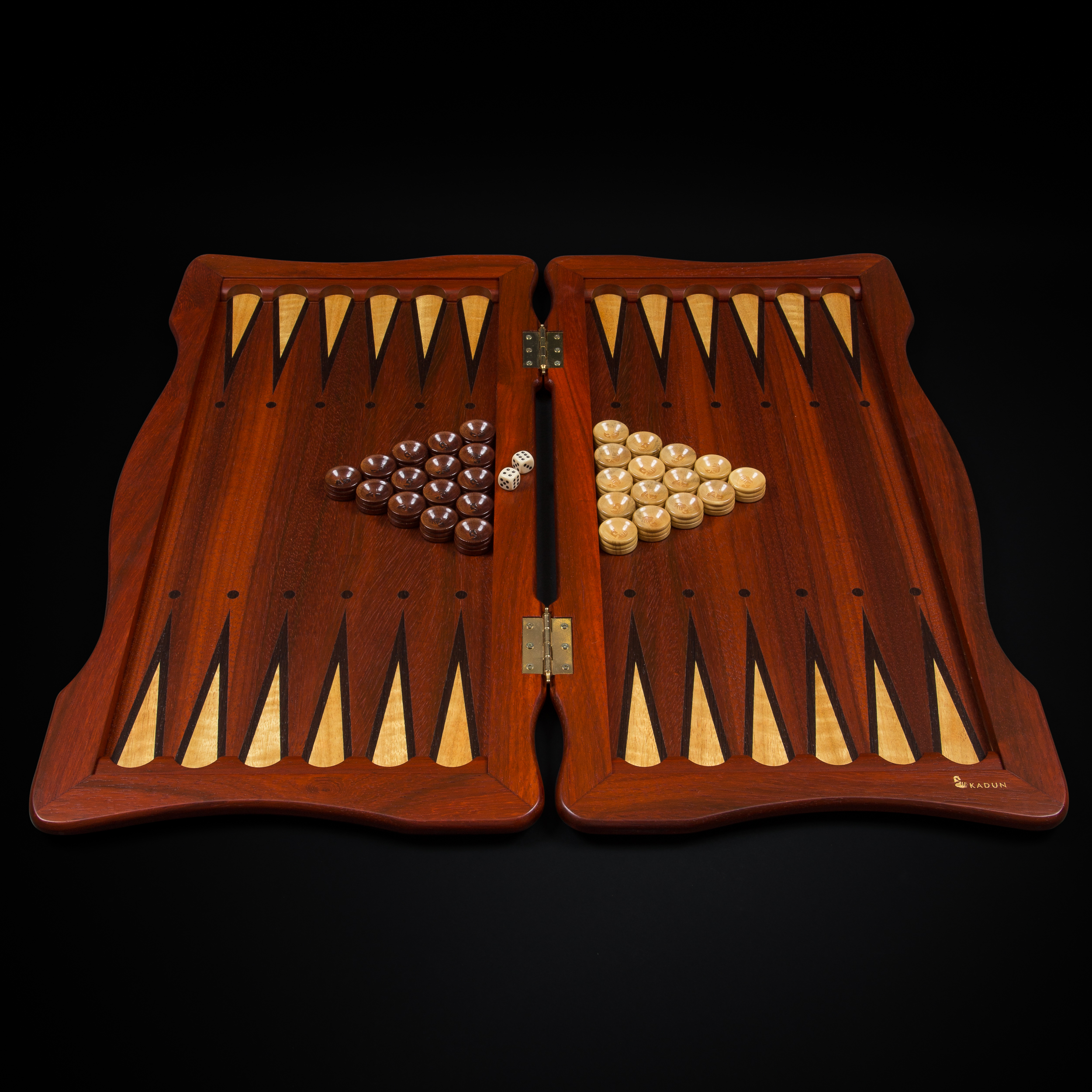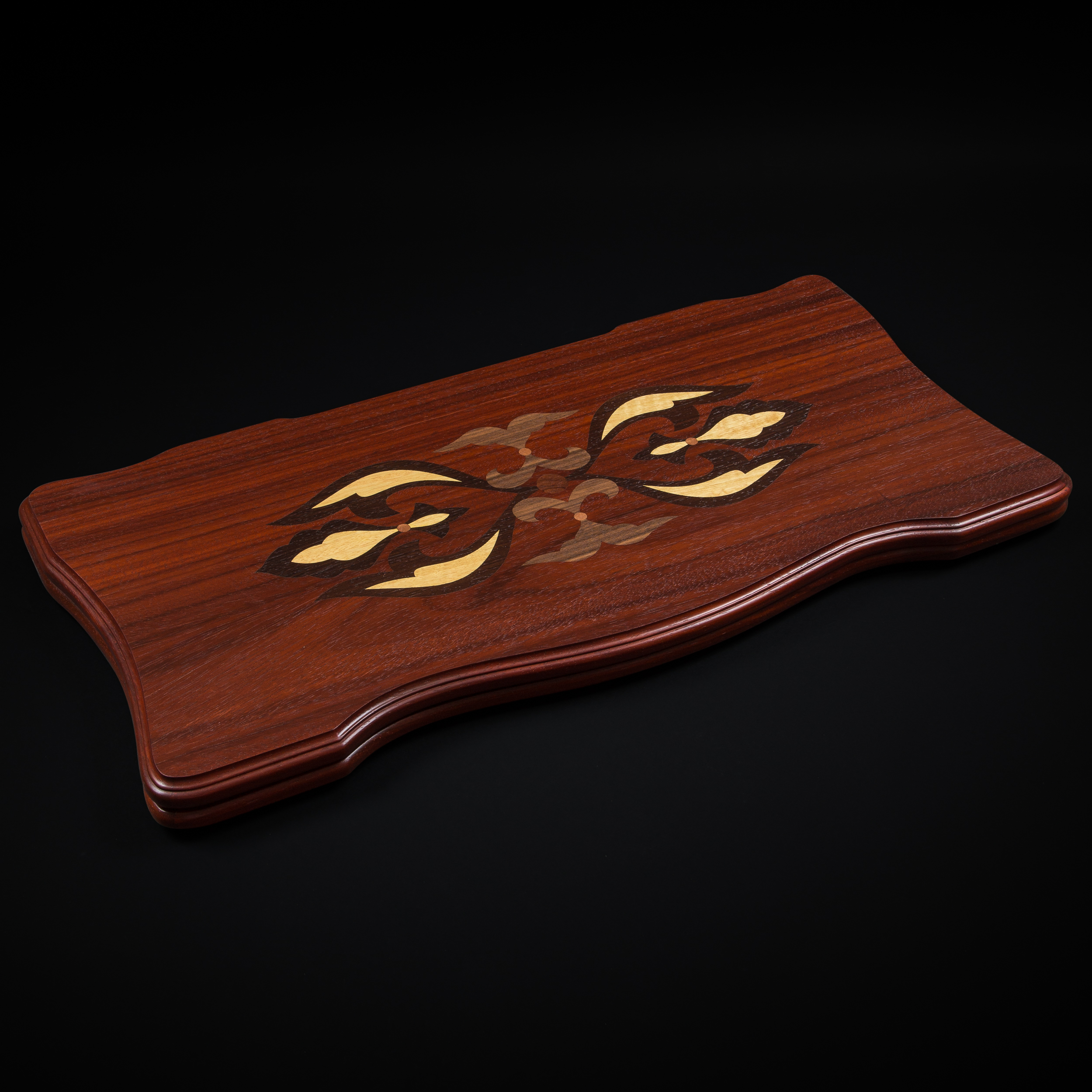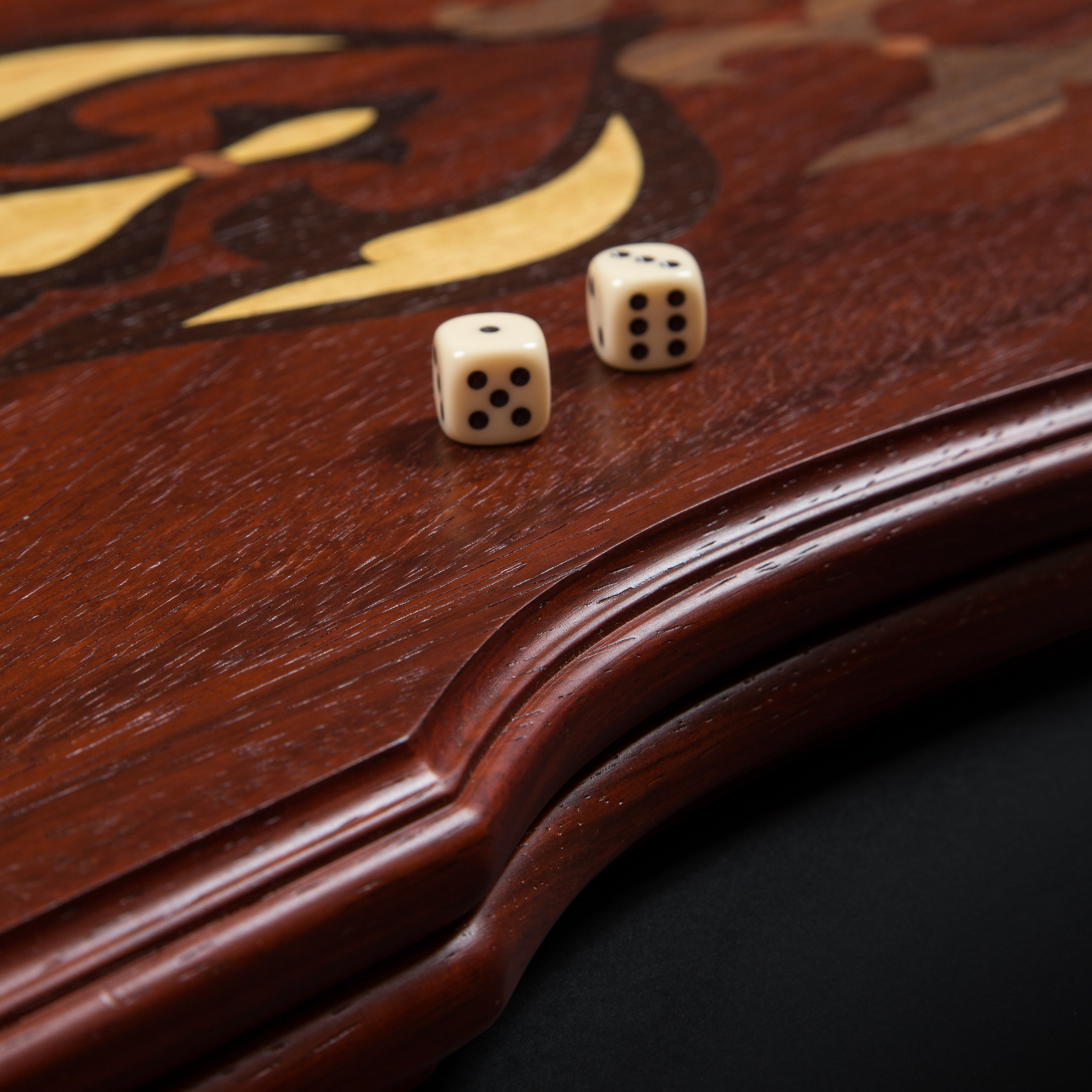 Нарды "авторские" из падука kadun. ручная работа, корпус падук , шелковисто-матовый лак, рисунок в технике маркетри( мозаика ) лицевая сторона – падук, лимонное дерево, орех поле внутри - – падук, лимонное дерево, орех шашки светлые - колхидский самшит, темные - красное дерево, подклеены замшей кубики - обсидиан Размеры в сложенном виде длина 60см ширина 30см в раскрытом виде длина 60см ширина 60см шашки ручной работы диаметром 30мм, 30шт кубики грань 11мм 2шт