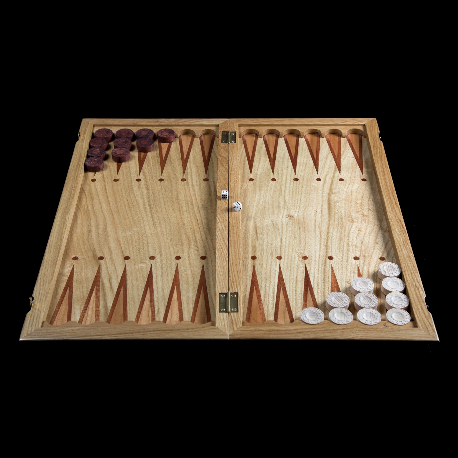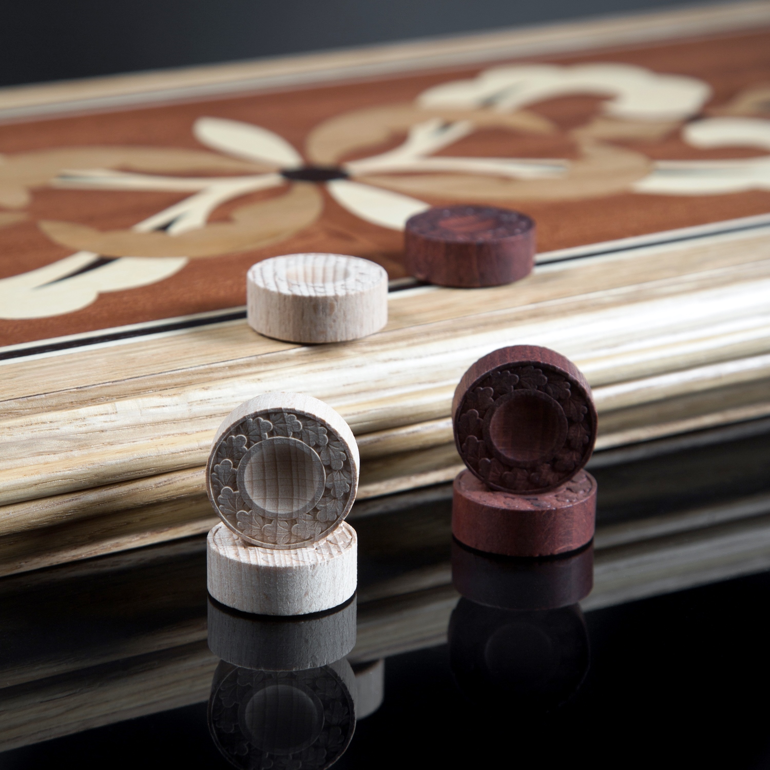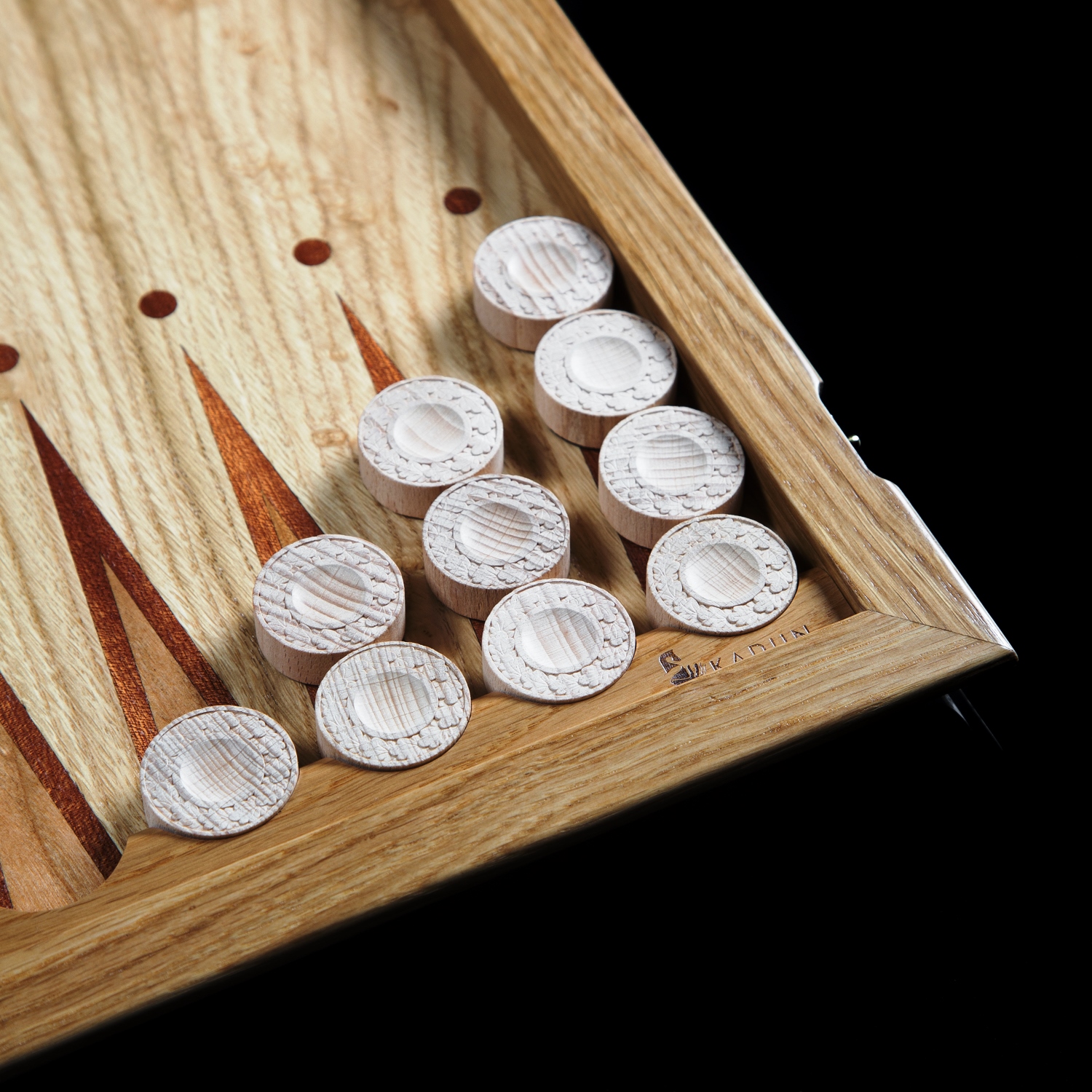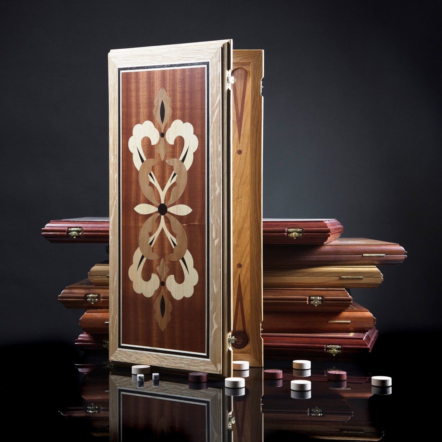 Нарды "корона" (светлый корпус) kadun. корпус - полевой дуб, шелковисто-матовый лак, рисунок в технике маркетри( мозаика ) лицевая сторона – сапеле, венге, дуб, клен, орех, биболо игровое поле внутри - дуб, сапеле, вишня шашки светлые - бук, темные - бук тонированный, подклеены тканью. кубики - пластик Размеры в сложенном виде длина 54см ширина 24см в раскрытом виде длина 54см ширина 48см шашки ручной работы диаметром 27мм 30шт кубики грань 11мм 2шт