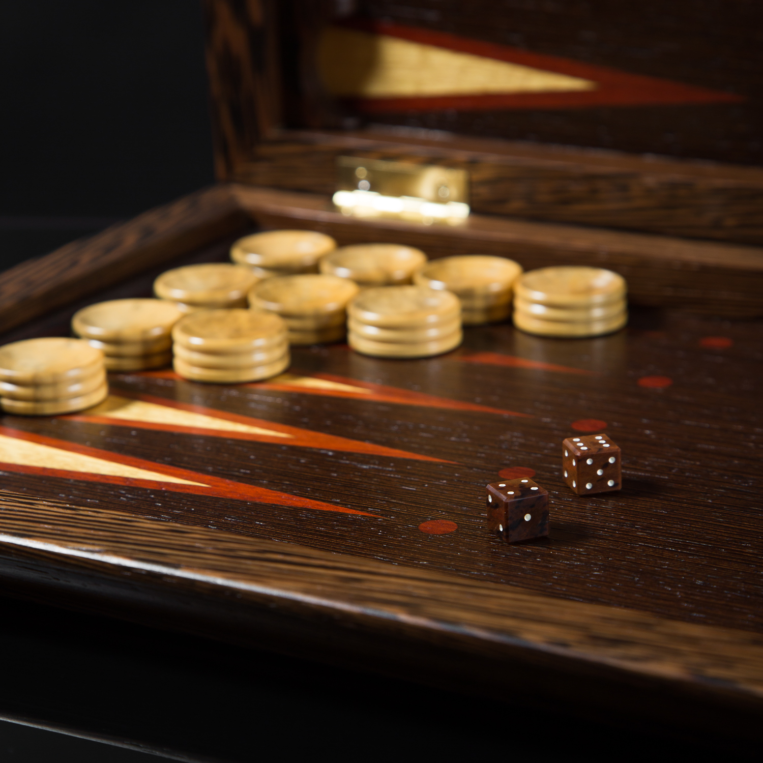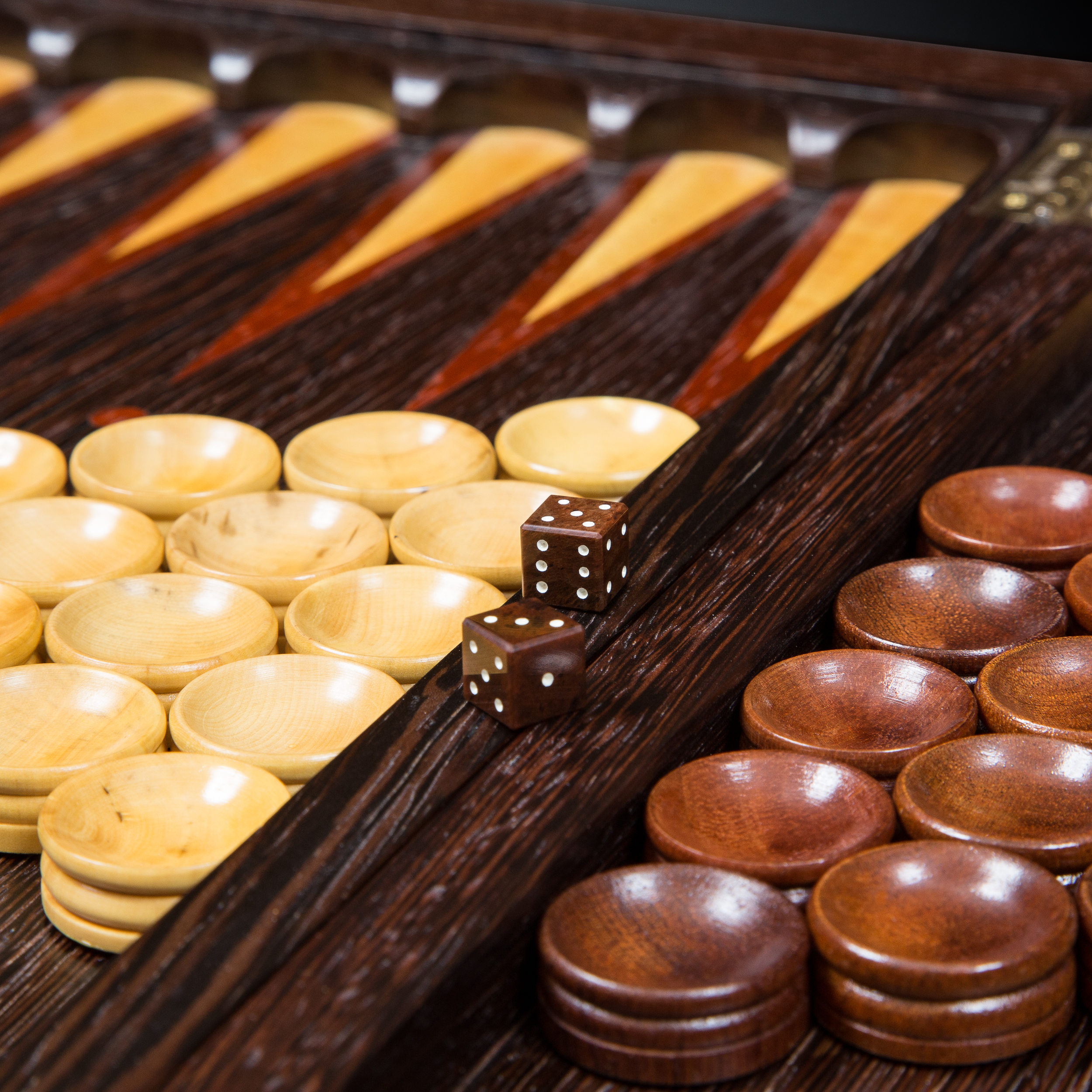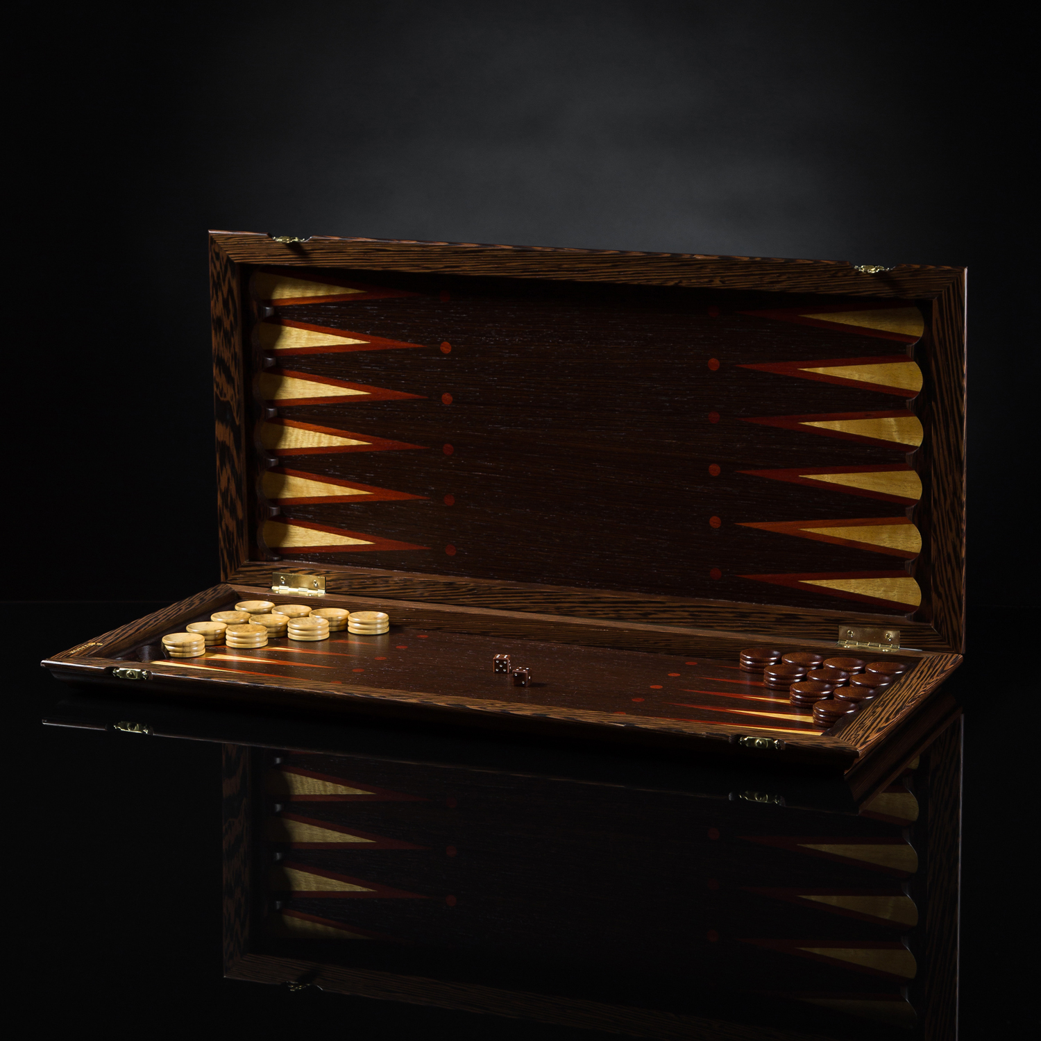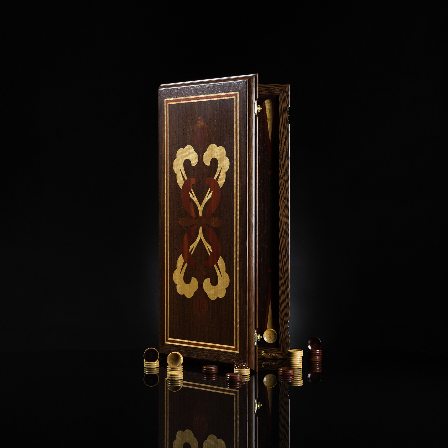 Нарды "корона элит" из венге kadun. корпус - африканский венге, шелковисто-матовый лак, рисунок в технике маркетри( мозаика ) лицевая сторона – венге, лимонное дерево, сапеле, падук, орех поле внутри - венге, падук, лимонное дерево шашки светлые - колхидский самшит, темные - красное дерево, подклеены замшей. кубики - обсидиан Размеры в сложенном виде длина 54см ширина 25см в раскрытом виде длина 54см ширина 50см шашки ручной работы диаметром 27мм, 30шт кубики грань 10мм 2шт