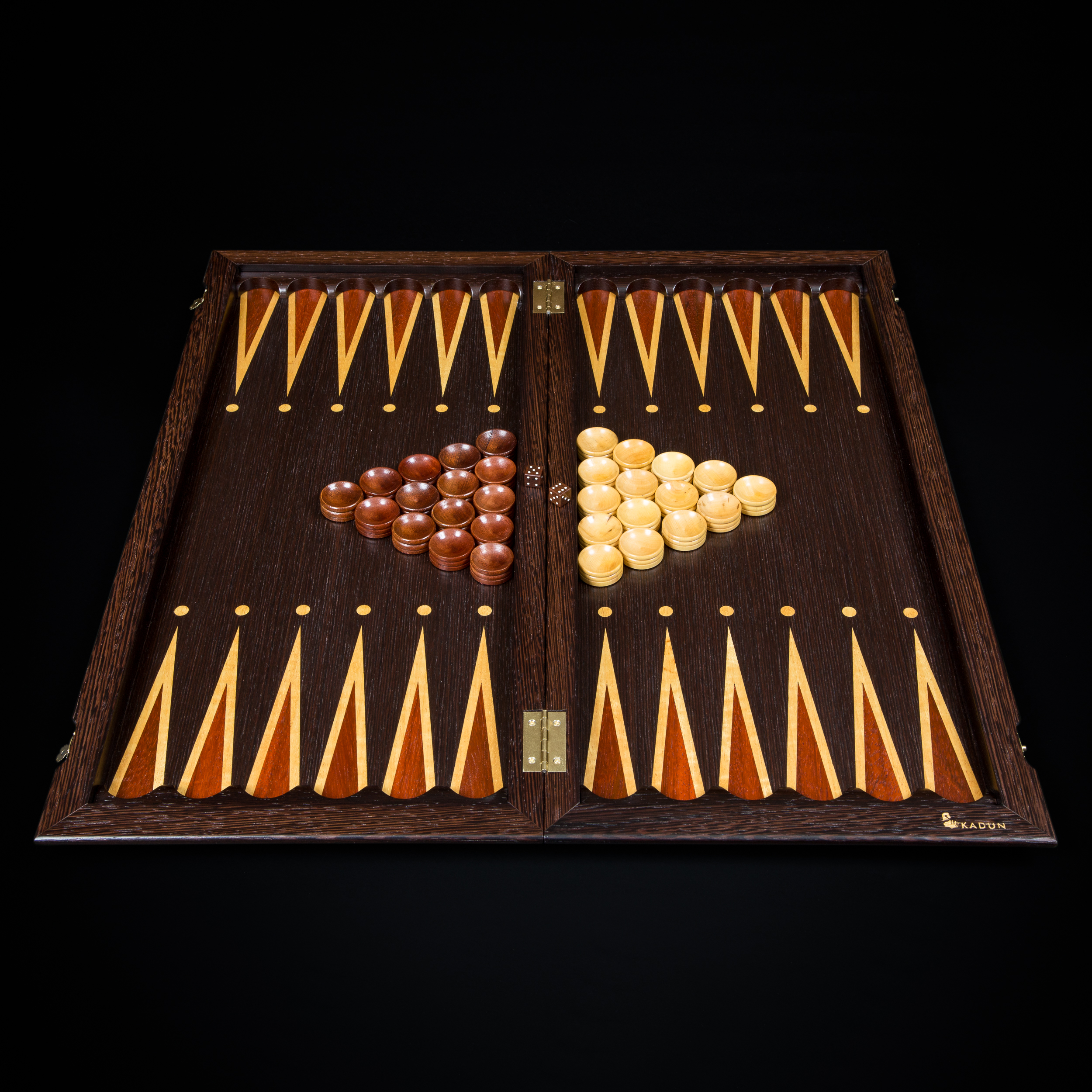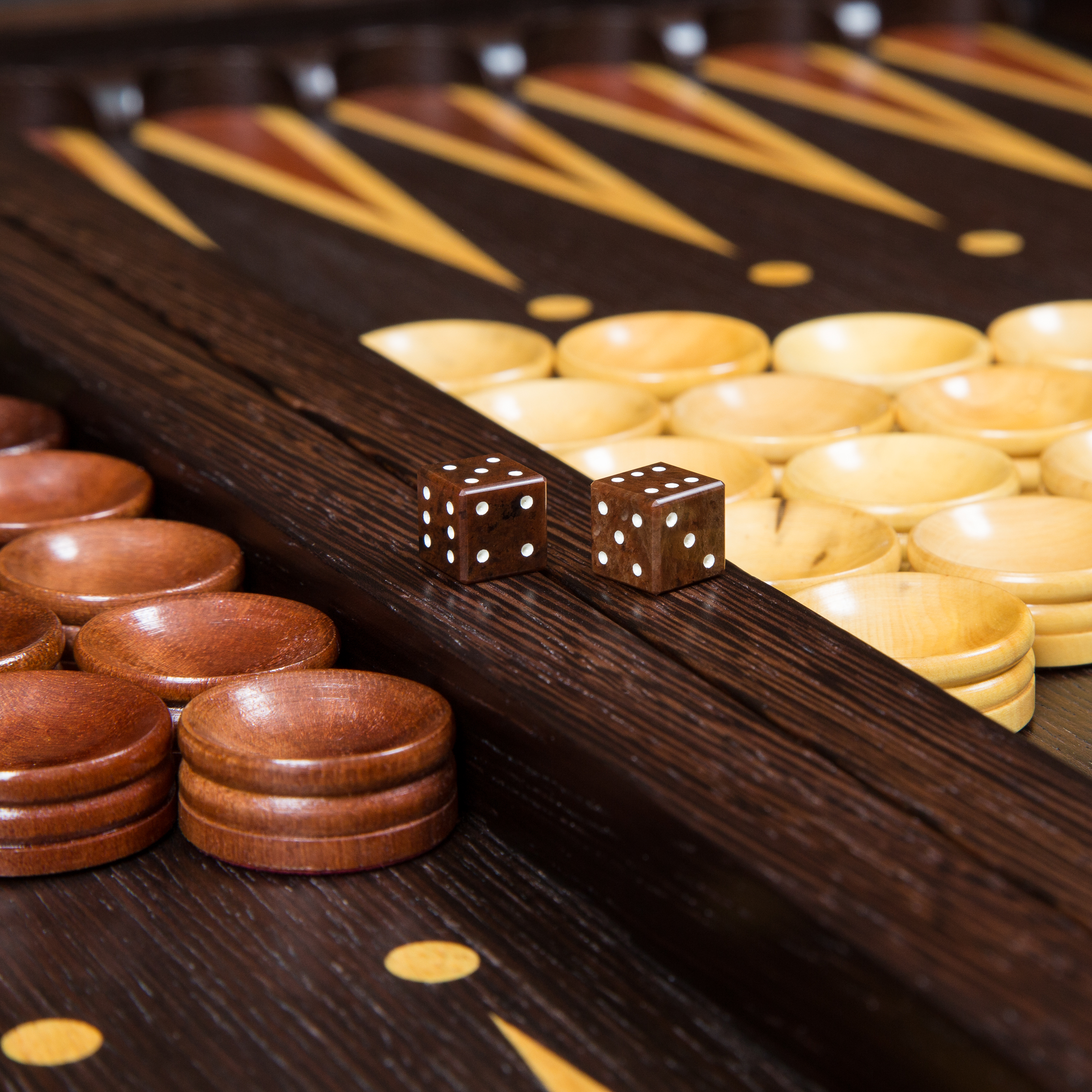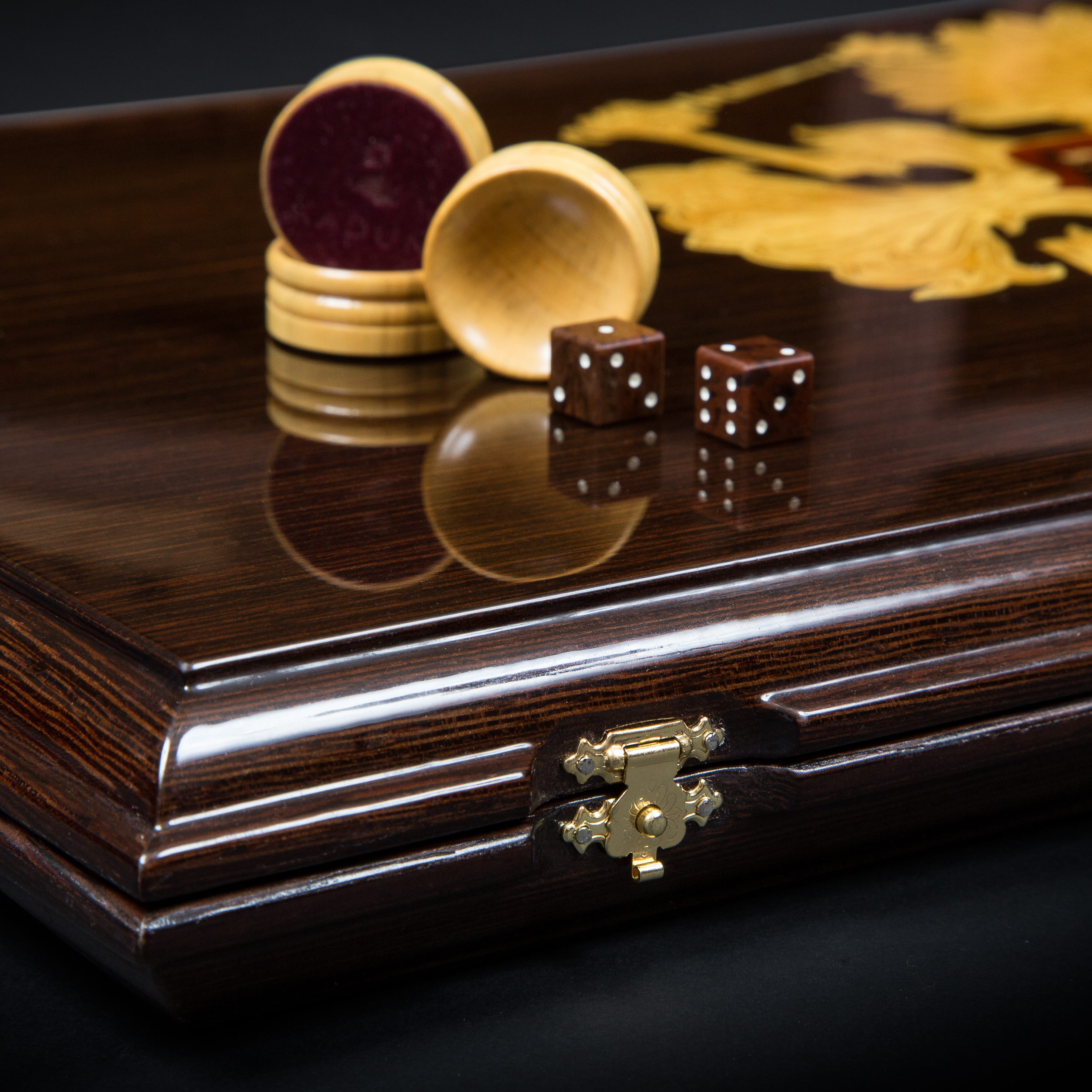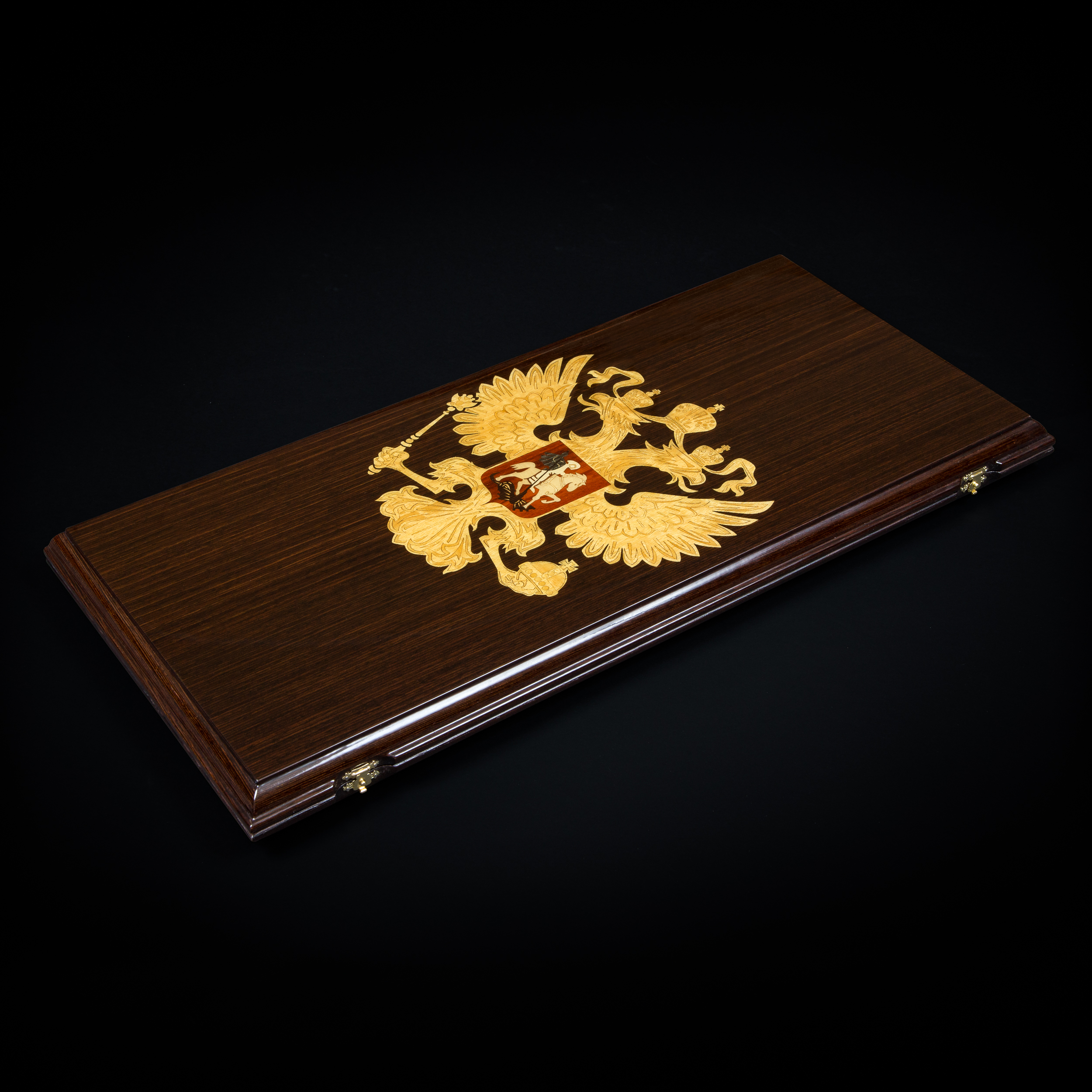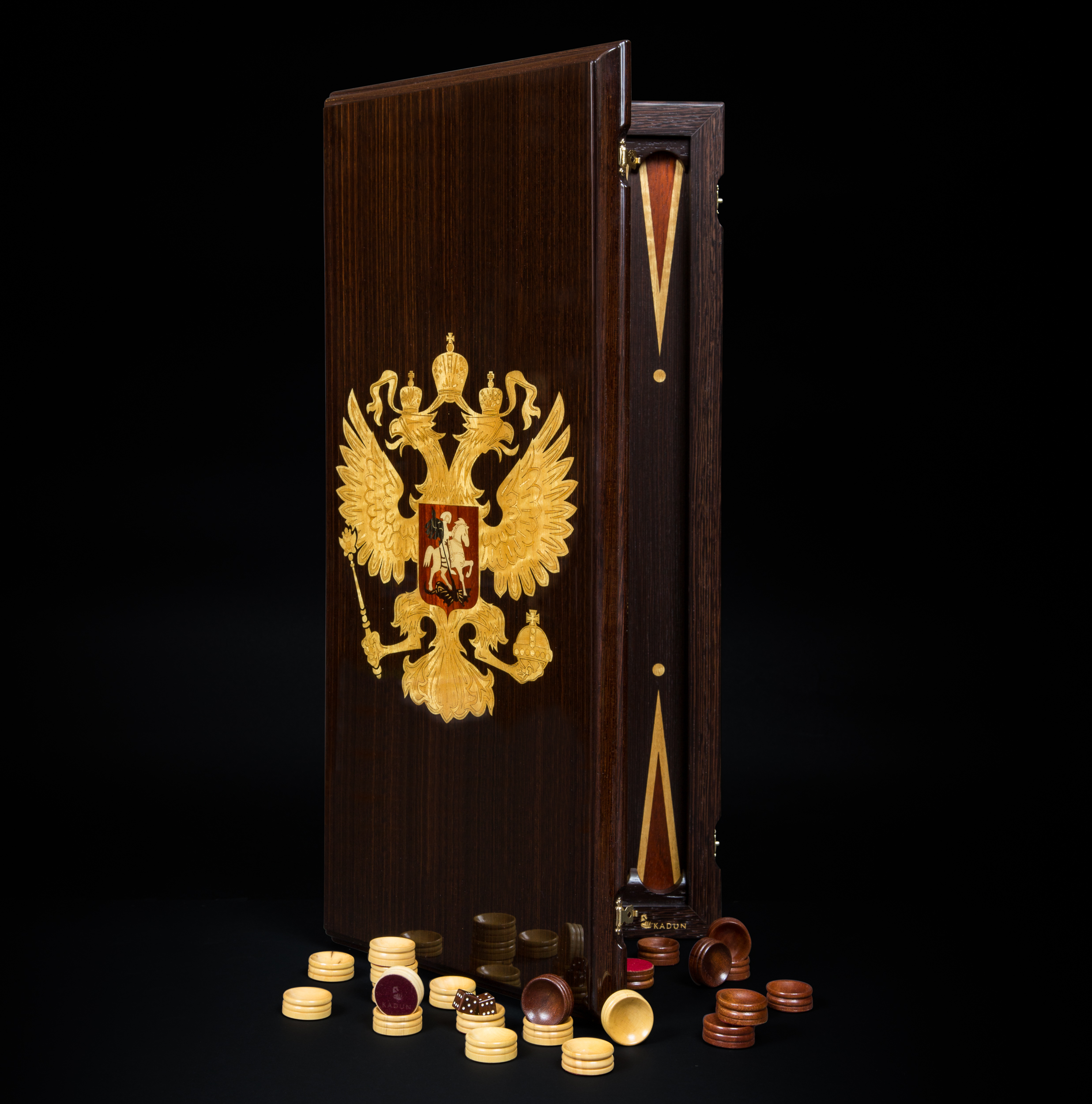 Нарды герб россии kadun. ручная работа, корпус африканский венге, рояльный лак, рисунок в технике маркетри( мозаика ) лицевая сторона – венге , падук, клен, лимонное дерево поле внутри - венге, падук, лимонное дерево, шашки светлые - колхидский самшит, темные - красное дерево сапеле, подклеены замшей. кубики - обсидиан Размеры в сложенном виде длина 54см ширина 25см в раскрытом виде длина 54см ширина 50см шашки ручной работы диаметром 27мм, 30шт кубики грань 10мм 2шт