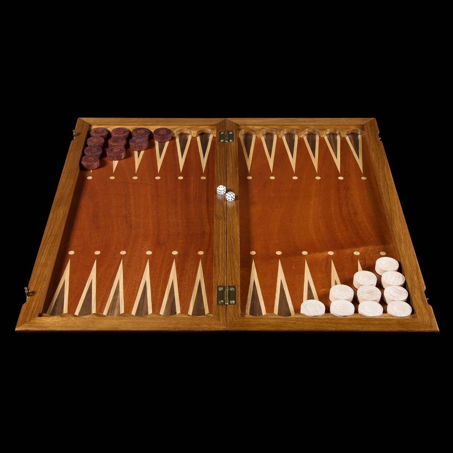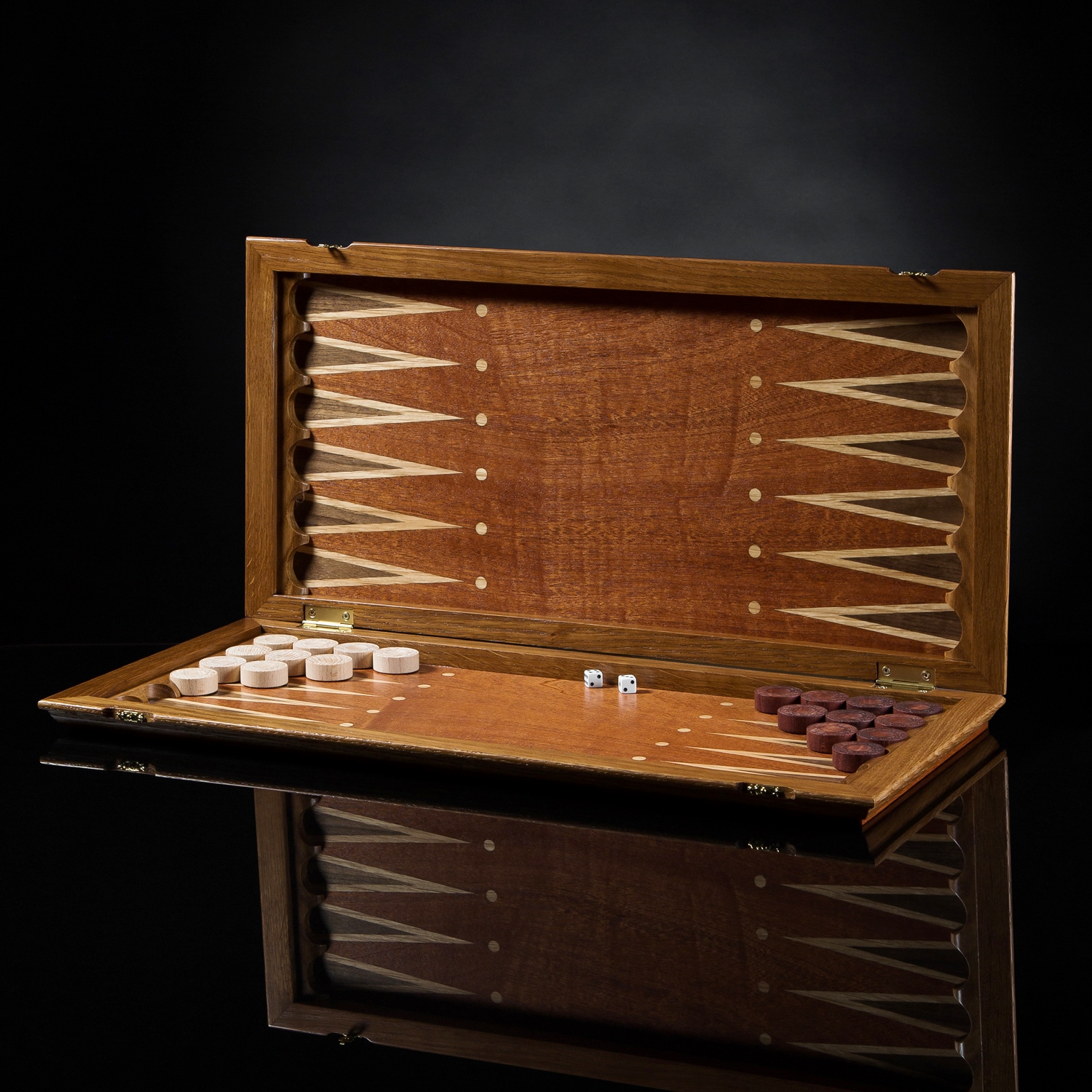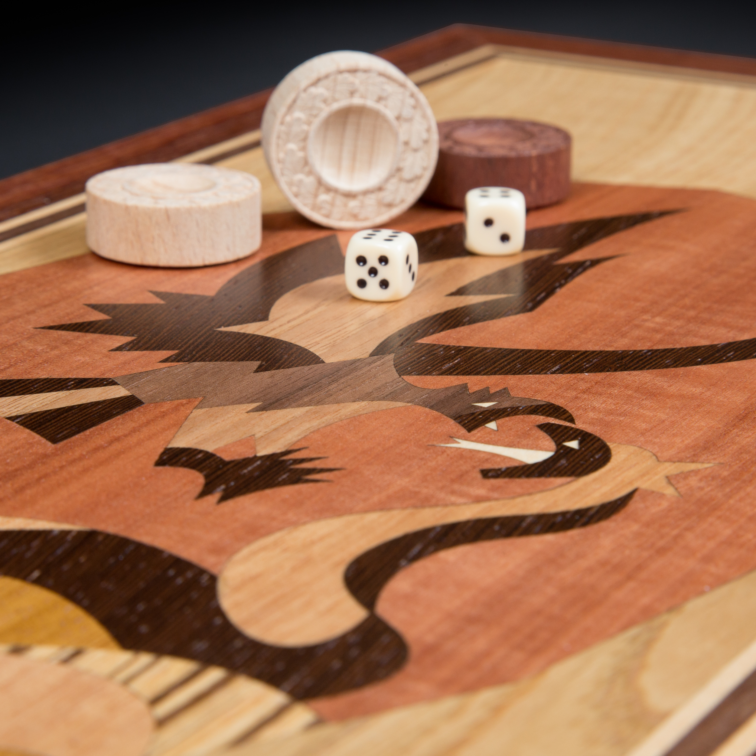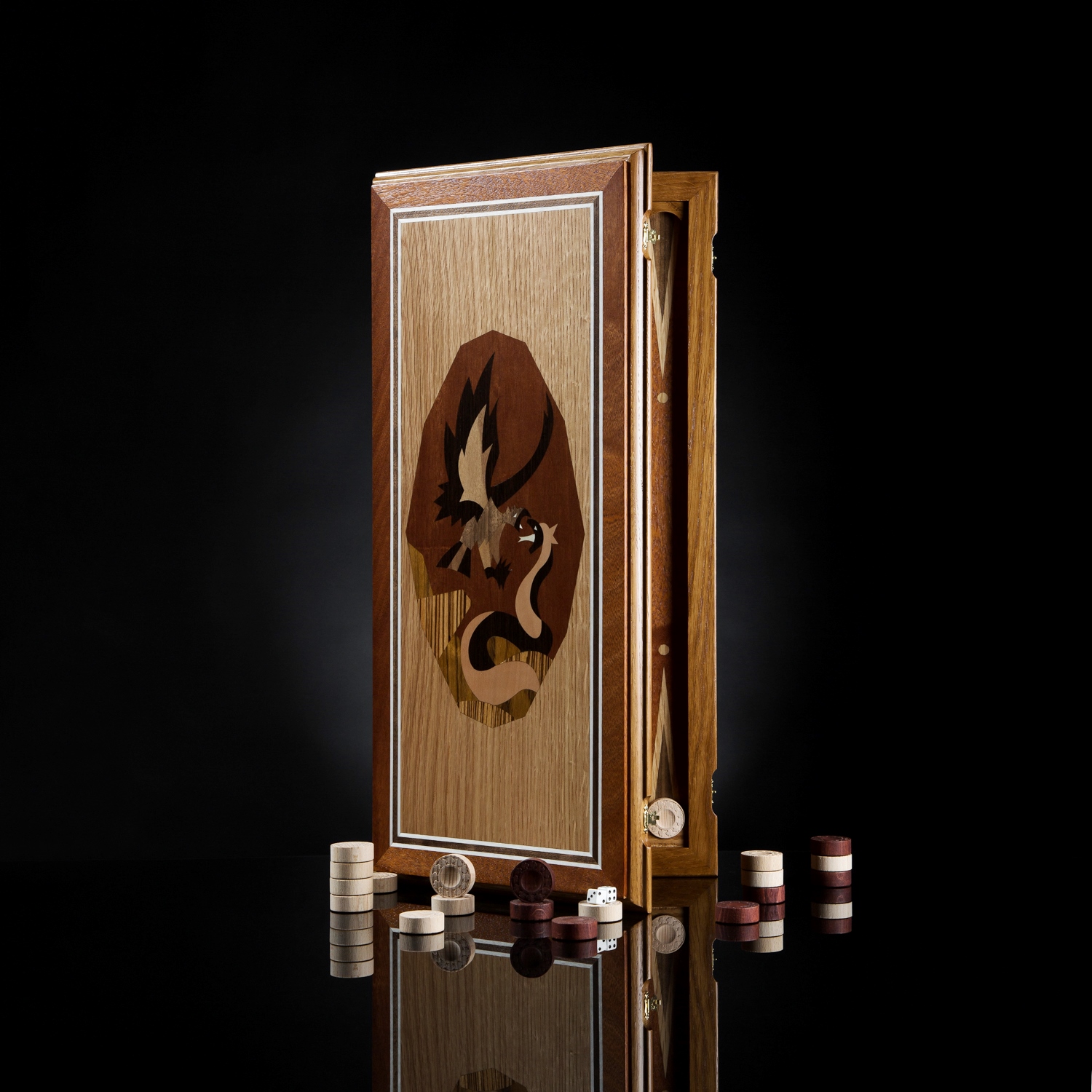 Нарды орел темный корпус kadun. корпус - полевой дуб тонированный, шелковисто-матовый лак, рисунок в технике маркетри( мозаика ) лицевая сторона – красное дерево, полевой дуб, красное дерево, венге, лимонное дерево, орех поле внутри - красное дерево, дуб, орех шашки светлые - бук, темные - бук тонированный, подклеены тканью. кубики - пластик Размеры в сложенном виде длина 54см ширина 25см в раскрытом виде длина 54см ширина 50см шашки ручной работы диаметром 30мм, 30шт кубики грань 11мм 2шт