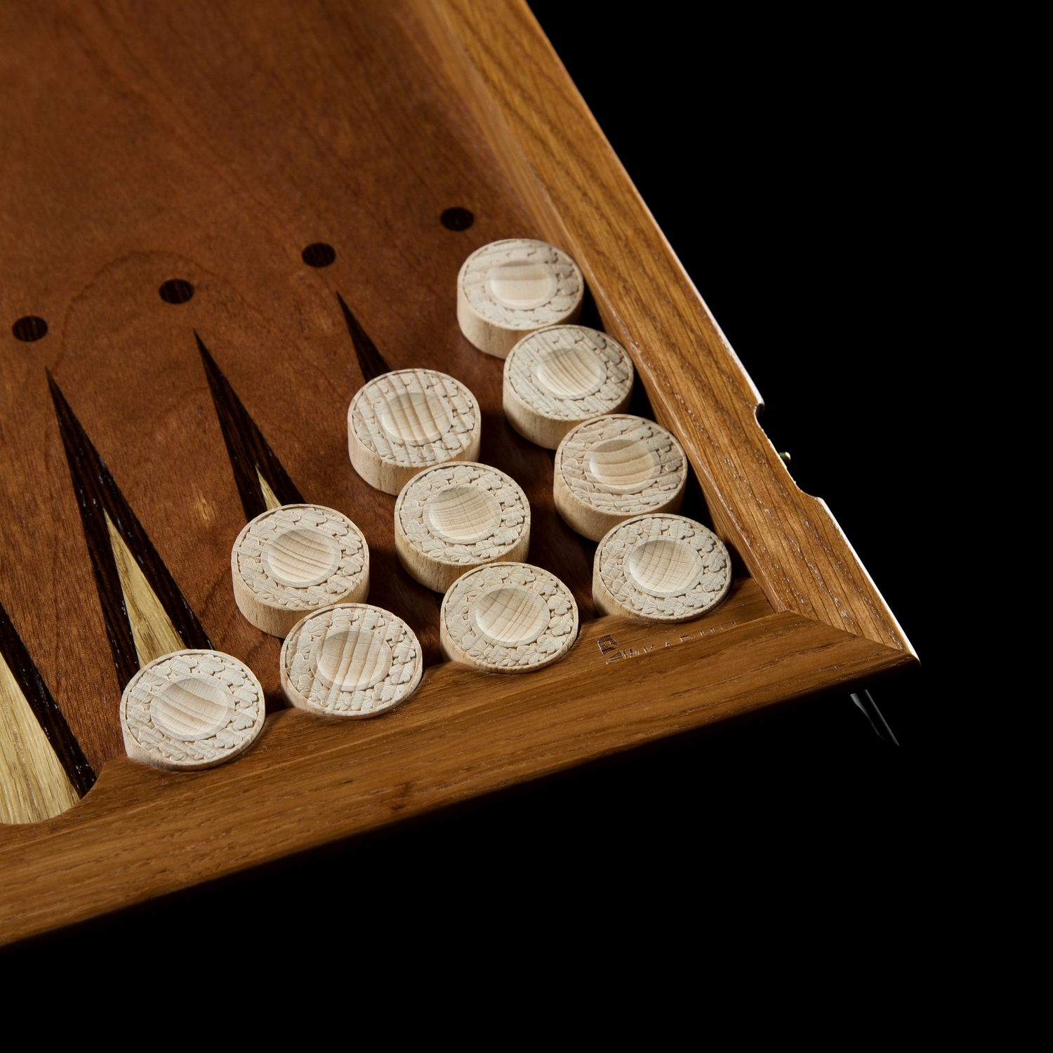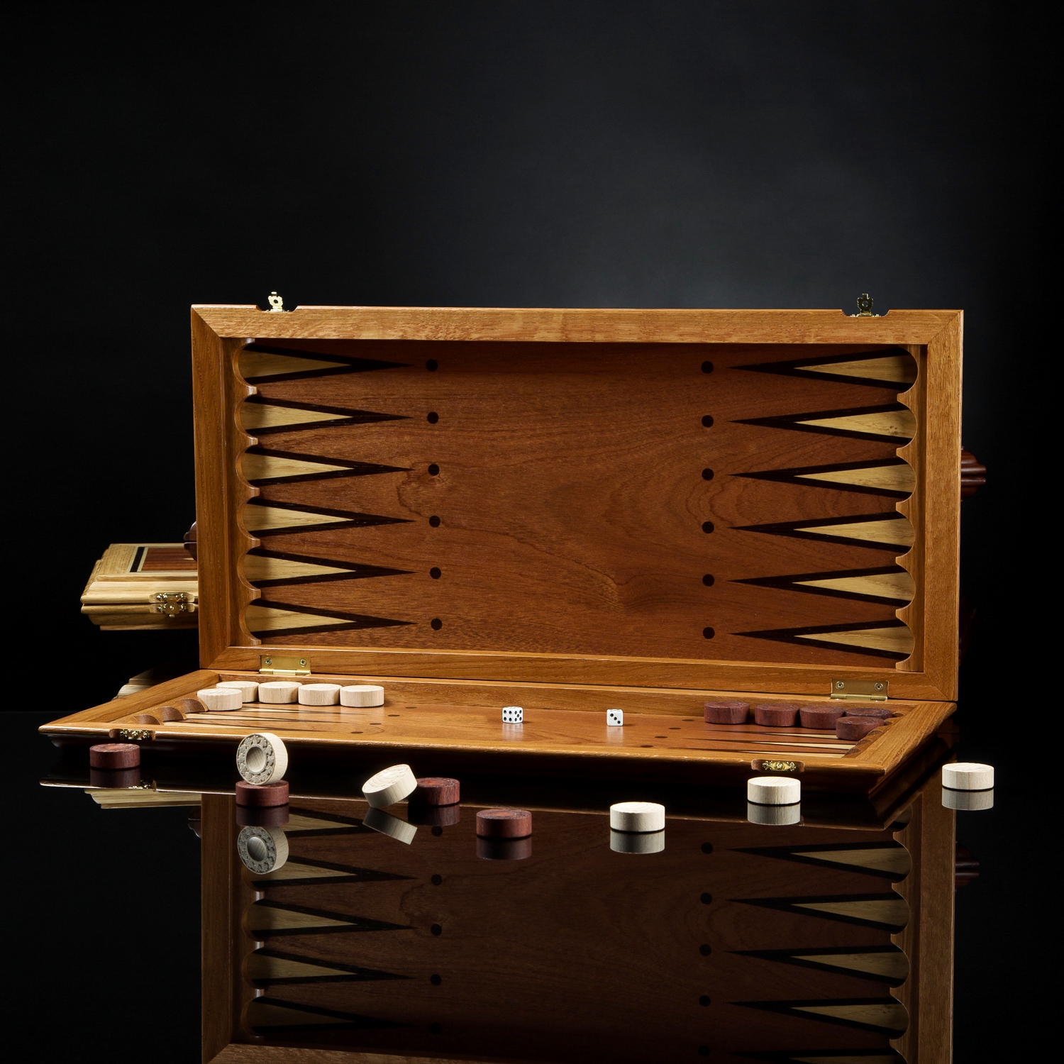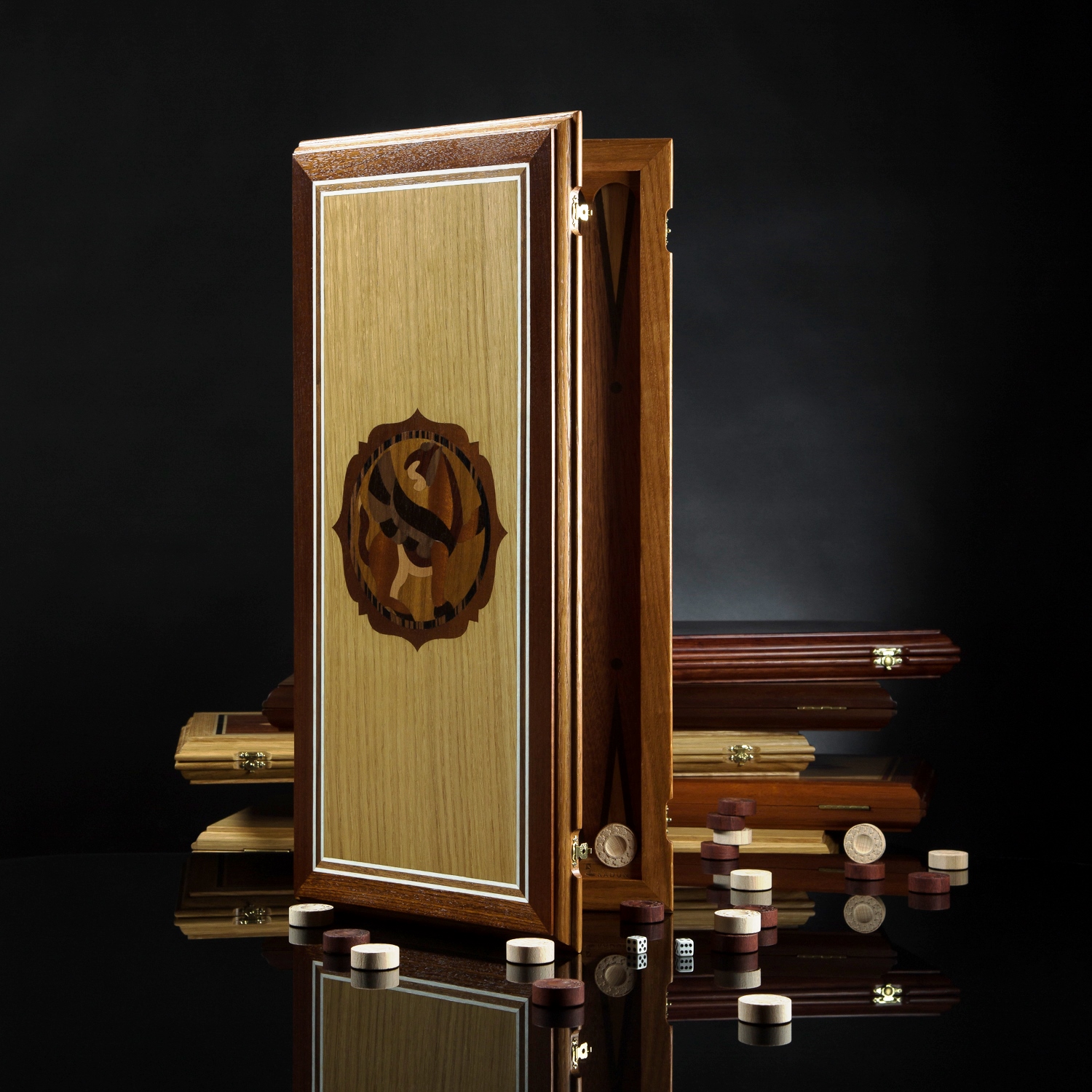 Нарды "лев" (темный корпус) kadun. ручная работа, корпус полевой дуб тонированный, шелковисто-матовый лак, рисунок в технике маркетри( мозаика ) лицевая сторона – красное дерево, полевой дуб, клен, биболо, венге, орех поле внутри - красное дерево, дуб,венге шашки светлые - бук, темные - бук тонированный, подклеены тканью. кубики - пластик Размеры в сложенном виде длина 54см ширина 25см в раскрытом виде длина 54см ширина 50см шашки ручной работы диаметром 30мм, 30шт кубики грань 11мм 2шт