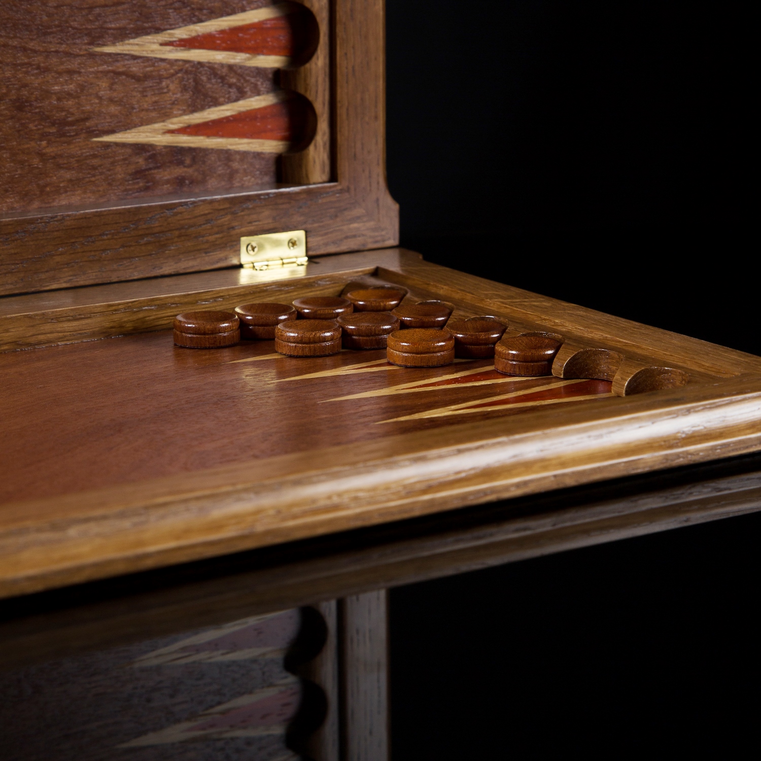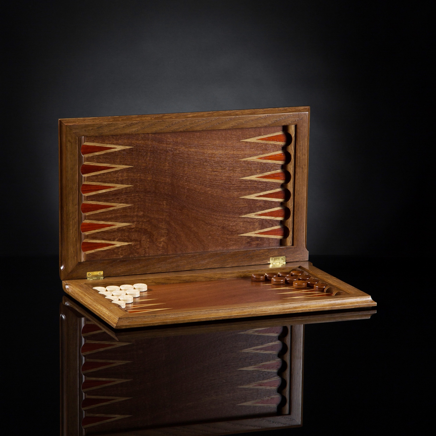 Нарды "книга" (темный корпус) kadun. корпус - полевой дуб тонированный, шелковисто-матовый лак, рисунок в технике маркетри (мозаика) замки – потайные магниты лицевая сторона – сапеле, венге, дуб, клен, орех игровое поле внутри - дуб, красное дерево, орех шашки светлые - ясень, темные - красное дерево, подклеены замшем. кубики - пластик Размеры в сложенном виде длина 34см ширина 21см в раскрытом виде длина 34см ширина 42см шашки ручной работы диаметром 18мм 30шт кубики грань 10мм 2шт
