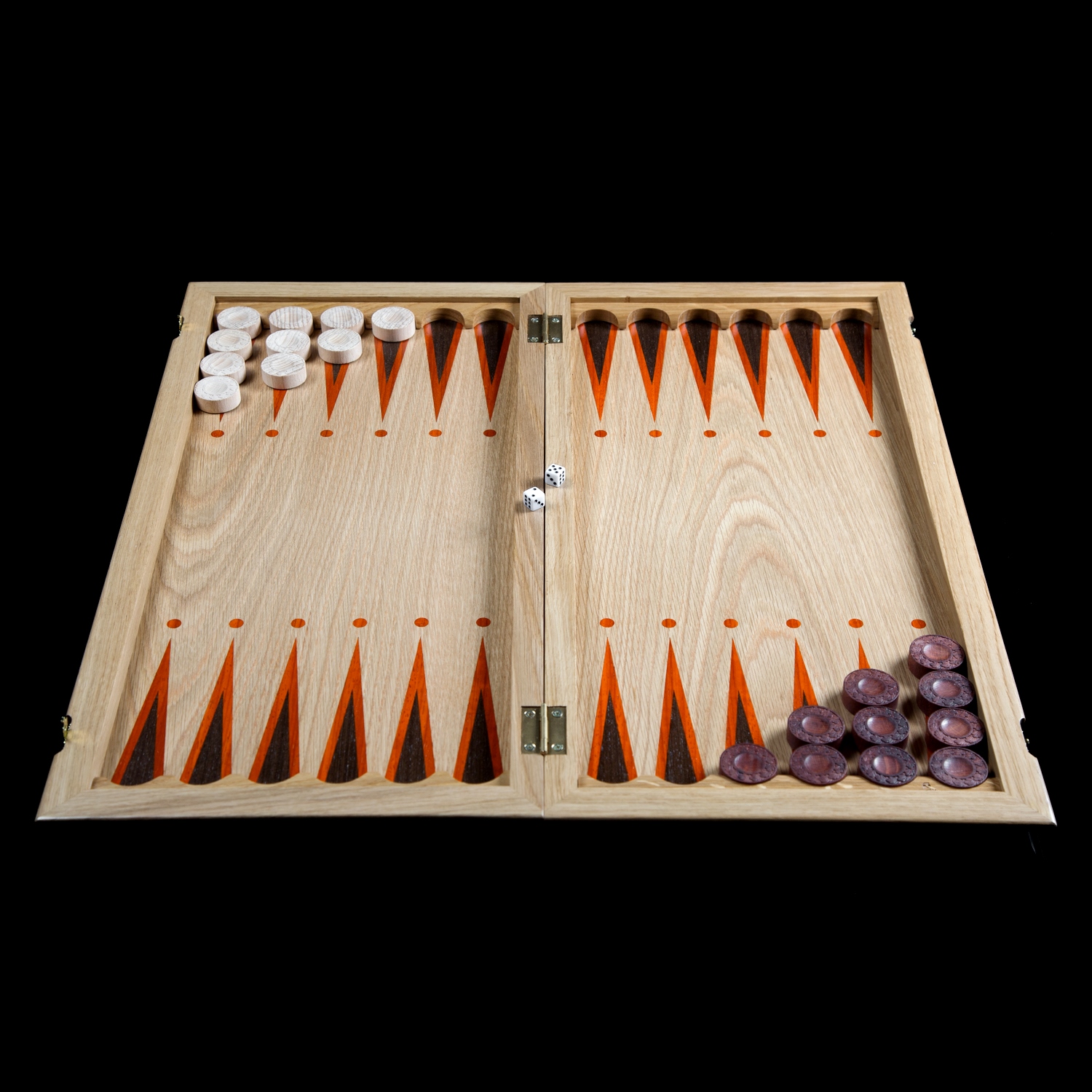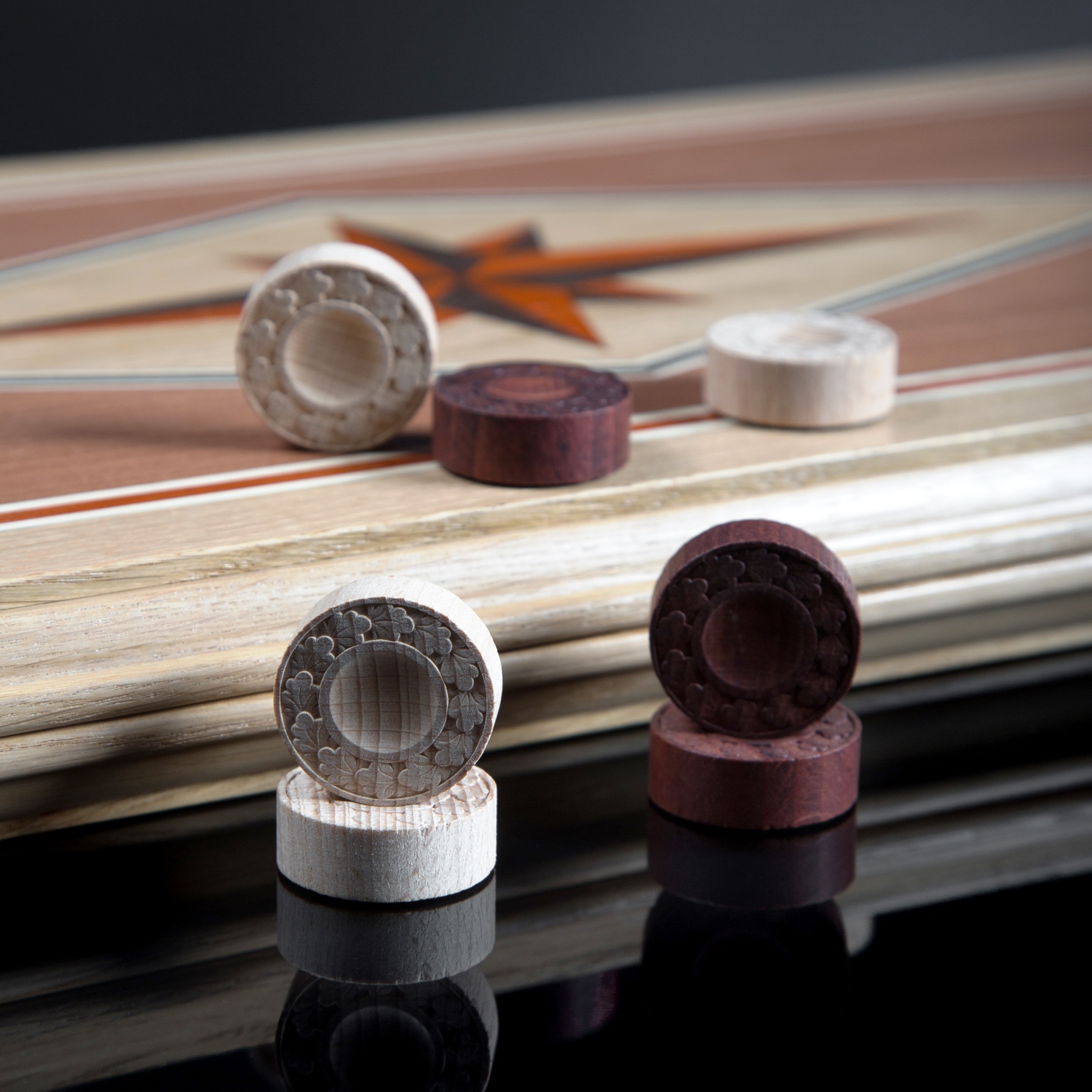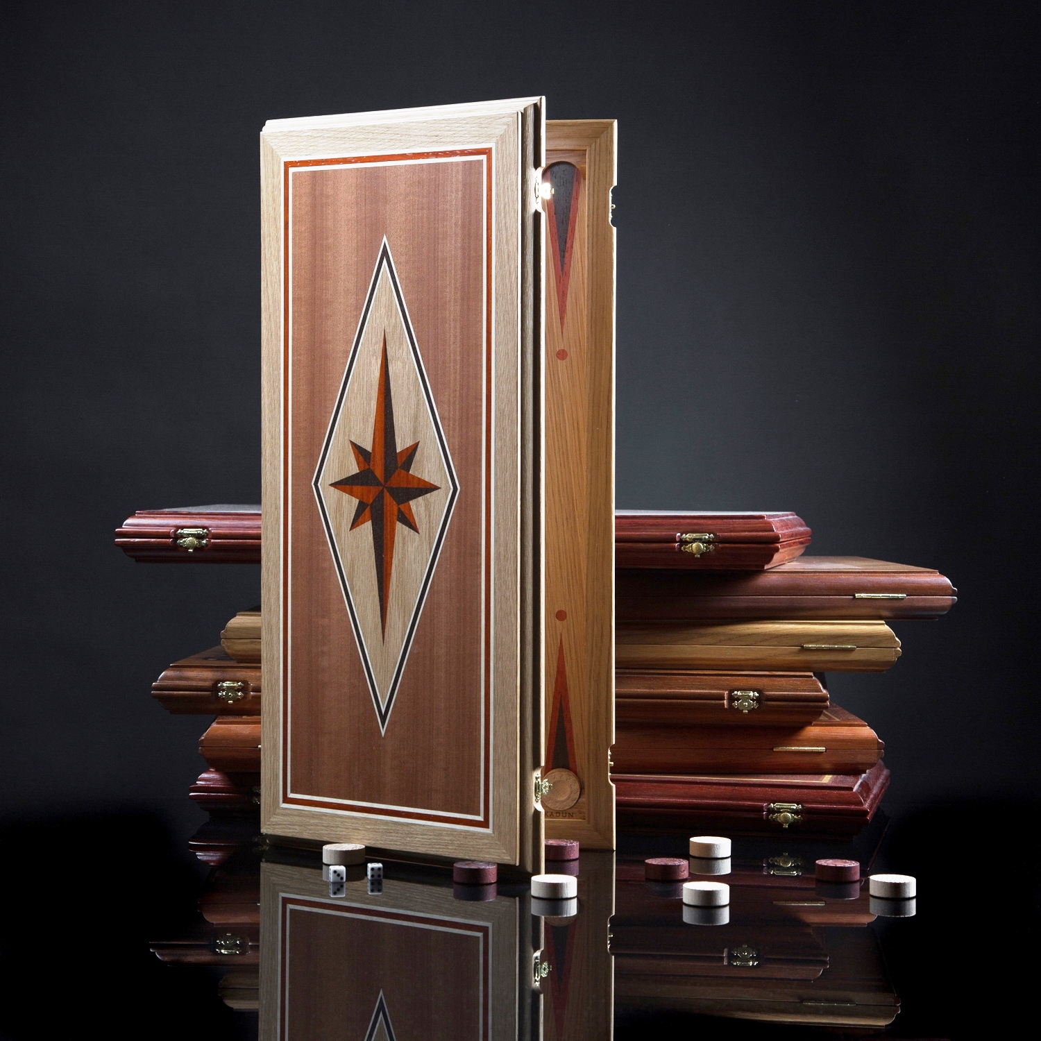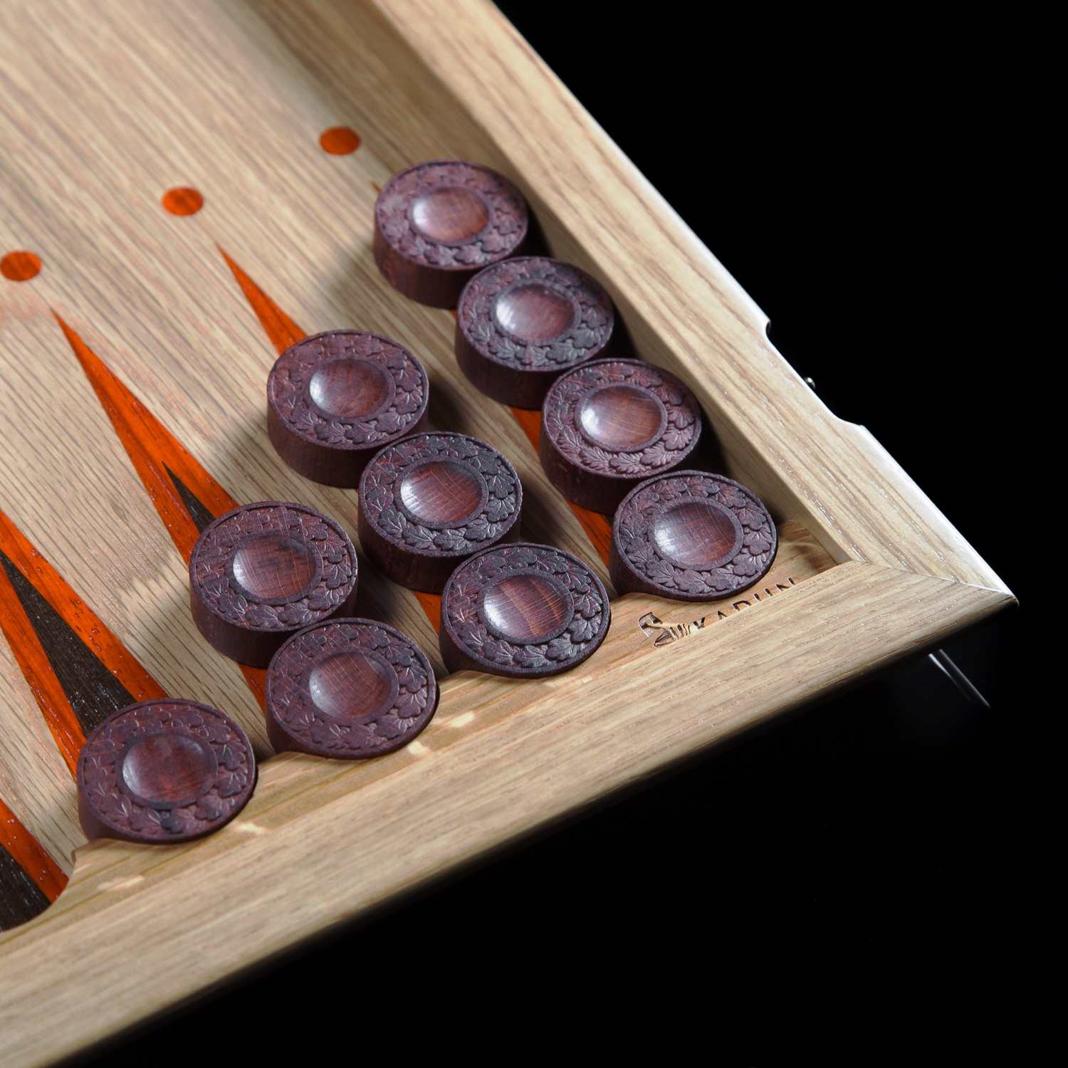 Нарды фэнтези светлый корпус kadun. корпус - полевой дуб, шелковисто-матовый лак, рисунок в технике маркетри( мозаика ) лицевая сторона – сапеле, венге, дуб, клен, падук игровое поле внутри - дуб, падук, венге шашки светлые - бук, темные - бук тонированный, подклеены тканью. кубики - пластик Размеры в сложенном виде длина 54см ширина 24см в раскрытом виде длина 54см ширина 48см шашки ручной работы диаметром 27мм 30шт кубики грань 11мм 2шт