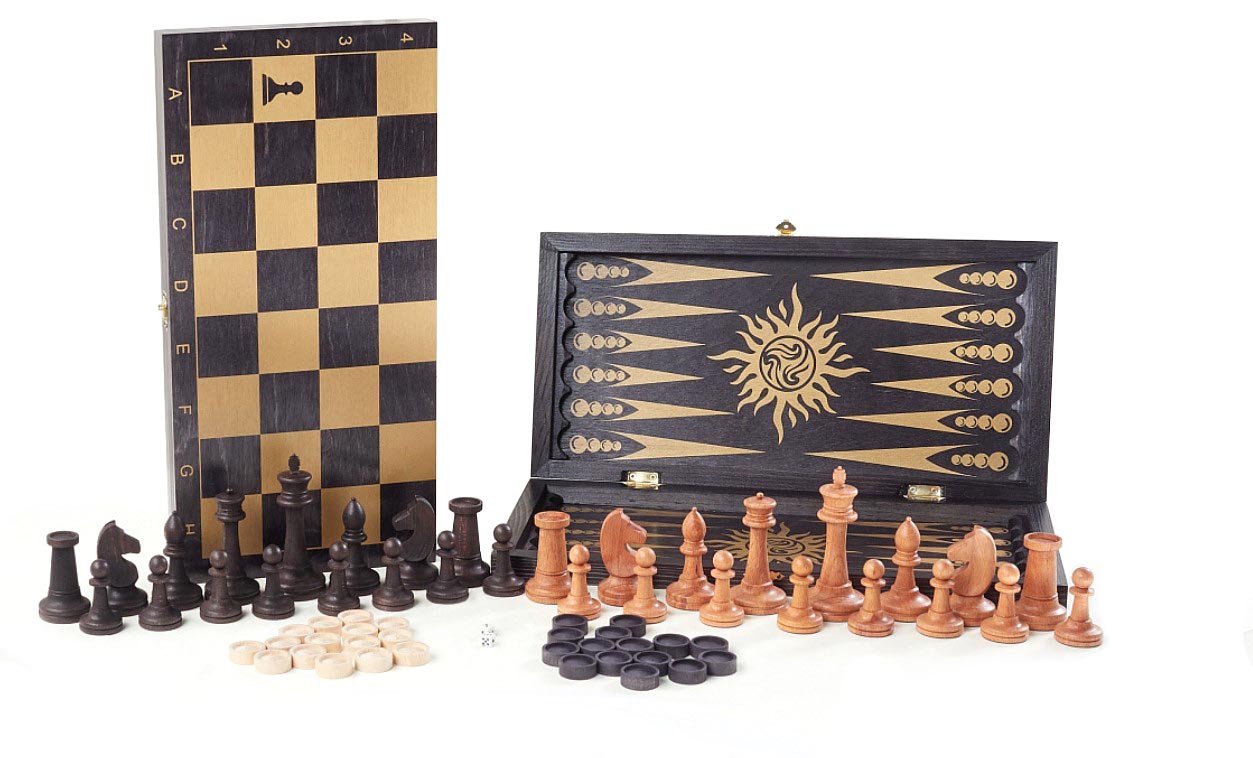 Игра 3в1 малая черная, рисунок золото с гроссмейстерскими буковыми шахмата
