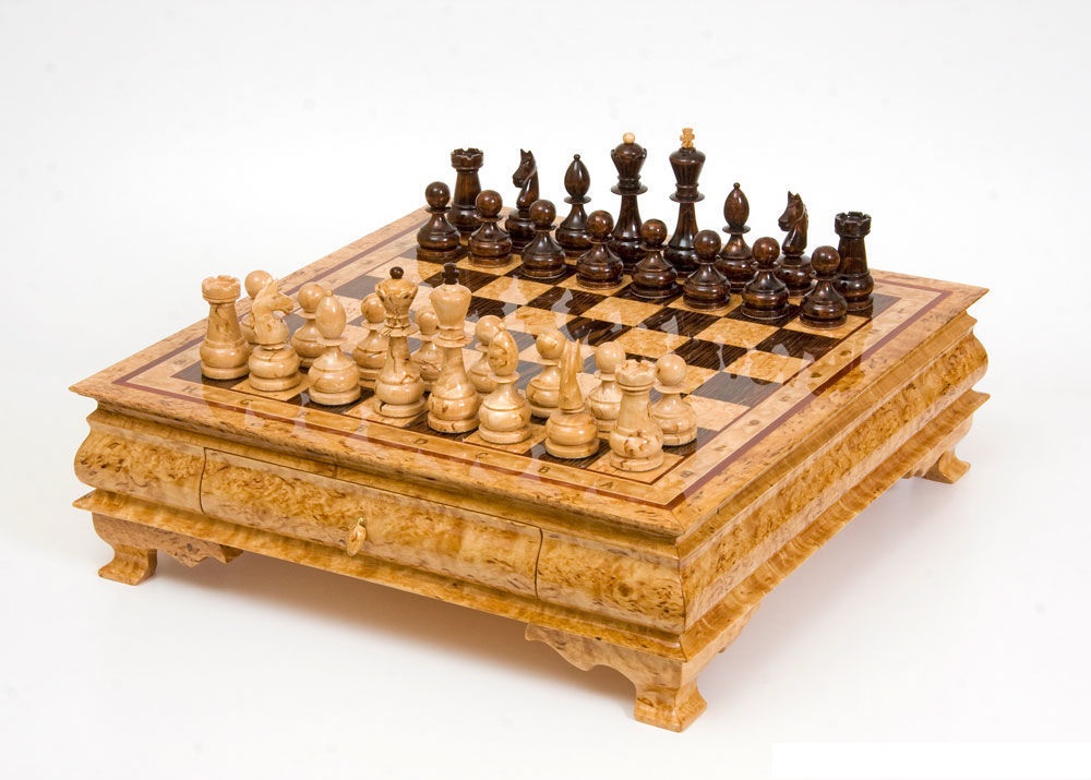 200108 шахматы средние на ножках из карельской березы . Материалы: Карельская берёза, перламутр, шпон, маркетри, берёза Размер: 450х450х130 мм. Конечно же, игра в шахматы - она сама по себе - удовольствие, но игра в шахматы на такой доске - удовольствие втройне. Эта царская шахматная доска выполнена из массива карельской березы, которая неповторима своей богатой палитрой золотистых оттенков и причудливой текстурой, рисунком напоминающей мрамор и украшена причудливыми узорами с использованием натурального перламутра. Из-за своих особенностей древесина карельской березы является сверхпрочной и долговечной, поэтому за игрой в наши шахматы с пользой проведет время не одно поколение семьи. Фигурки для игры, также из карельской березы, в комплекте.