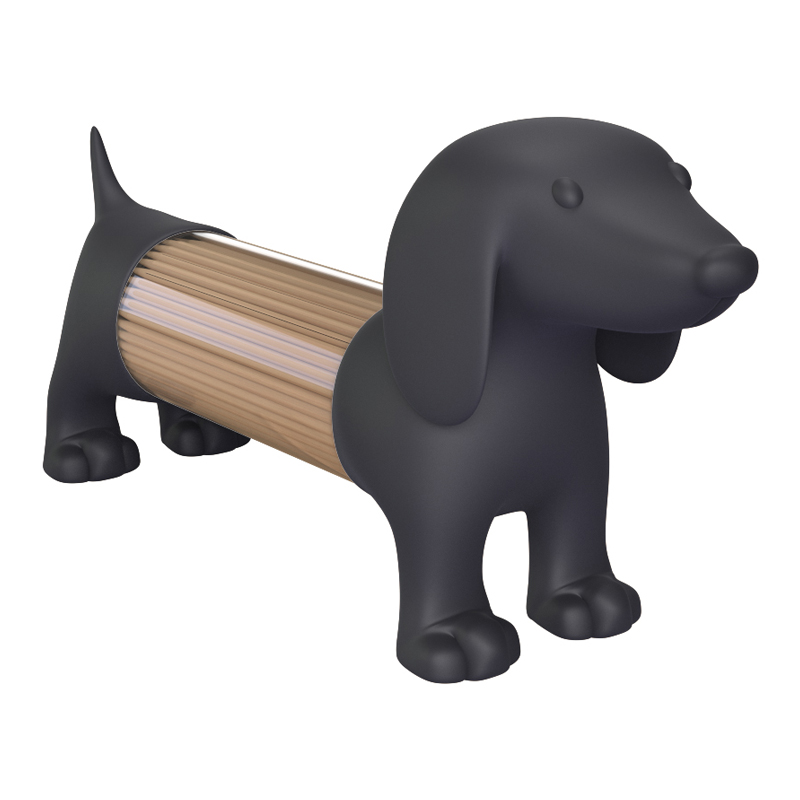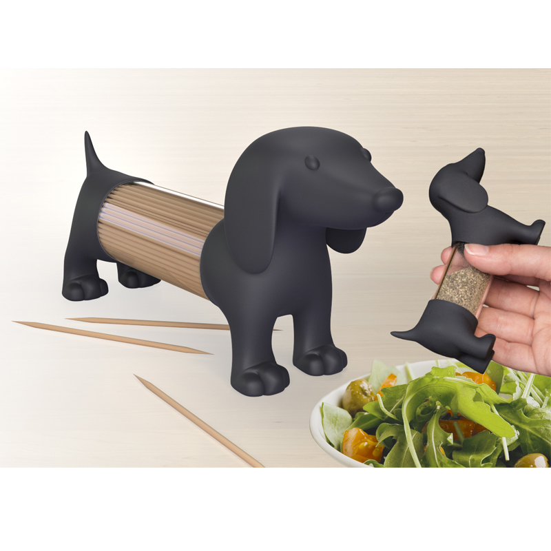 Емкость для соли, перца или зубочисток teckel черный. Если вы любите все нестандартное, необычное и креативное, то емкости для специй или зубочисток Teckel созданы специально для вас. Они изготовлены в форме длинной собачки, напоминают таксу, поэтому в них легко помещаются зубочистки. Емкости представлены в трех цветах, поэтому купив сразу 3 штуки, вы получаете оригинальный набор. Белую собачку можно использовать для соли, черную для молотого перца, а коричневую – для зубочисток. Под хвостом находится дырочка для высыпания специй или зубочисток, а засыпать все можно, отсоединив задние лапки от корпуса. • Изготовлен из приятного на ощупь софт-тач пластика • Прозрачный экран по периметру для определения степени наполненности • Три цвета на выбор: белый, черный и коричневый • Каждая емкость по отдельности универсальна – подходит как под мелкие специи, так и под зубочистки