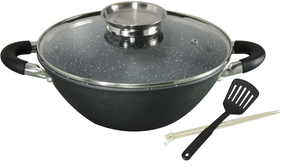Сковорода вок kl-4069-30 30см.мрамор.покр.стекл.крыш.. Бренд Kelli Страна КИТАЙ Сковорода-вок, диаметр 30 см. Мраморное антипригарное покрытие, клепанные ручки с силиконовоми накладками, Арома крышка с паровыпуском, лопатка и бамбуковык палочки в подарок, подходит для всех видов плит  развернуть описание ▼
