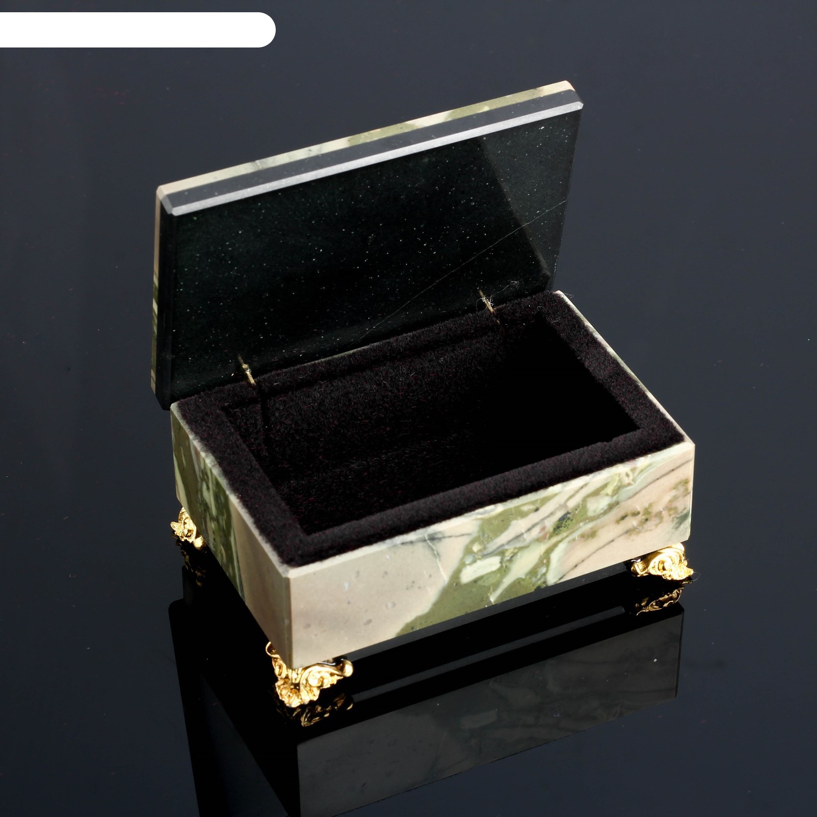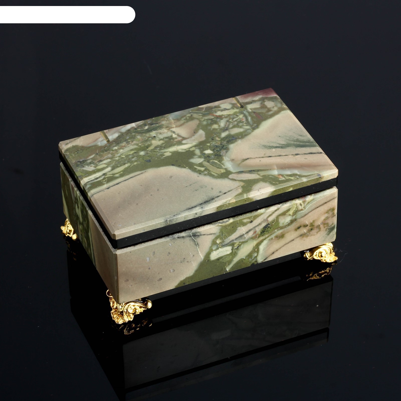 Ларец на ножках 9х6х5 см, натуральный камень, яшма. Вес, гр: 360 Страна: Россия Цвет: Зелёный Форма: Прямоугольная Тематика: Камень Тематика праздника: Без повода Материал: Натуральный камень Материал: Яшма РосЗакуп: Да