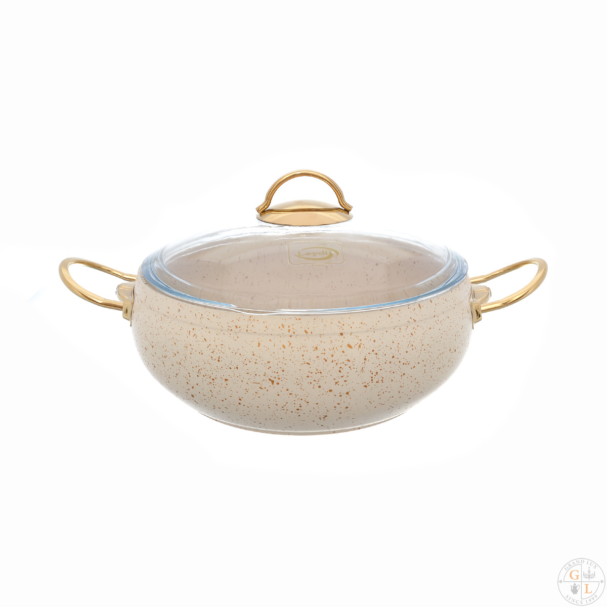 Кастрюля с а/п покрытием Repast 24 см Белоснежная, с золотым напылением, эта кастрюля автоматически станет вашей любимицей на кухне. В приготовлении любых блюд – от первых до гарниров и сложных вторых блюд ей нет равных. Наша новинка имеет многослойное антипригарное покрытие, которое обуславливает не только высокие антипригарные качества и удобство использования, но и минимизацию использования масла. Это не только – забота о вашем здоровье, но и сохранение полезных свойств продуктов. Repast: залог здоровья и гарантия отменных блюд. Всегда!