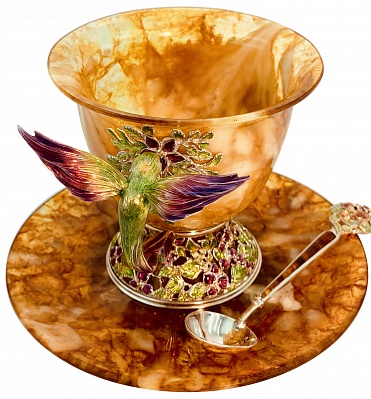 Чашка чайная "колибри" 4201/l (ювелирная бронза). Роскошный эксклюзивный подарок! Чашка из янтаря и белой ювелирной бронзы или серебра 875 пробы, декорированная эмалью. Фоновый рисунок выполнен в виде зарослей цветов. Ручка представляет собой яркую, как драгоценный камень, роскошную птицу Колибри (эмаль). Блюдце янтарное. Ложка из серебра 875 пробы, отделана янтарем и эмалью. Чашка упакована в респектабельный подарочный футляр шоколадного цвета. Объем чашки 200 мл., диаметр блюдца 15 см. Рекомендуемая температура напитка до 80С.