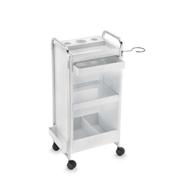 Тележка new kross. Тележка парикмахерская из пластика на хромированном каркасе на колесах. Имеет 1 выдвижной ящик и 2 просторных отделения для хранения инструментов и шампуней. В верхней части тележки расположены отделения под миски для окрашивания и сопутствующие аксессуары, а также металлический фенодержатель. Цвет на выбор: - белый; - черный. Вес: 9,7 кг; Объем: 0,15 м³. Размер (ДхШхВ): 46x30x89 см Стоимость модели, представленной на фото, может отличаться от цены, указанной на сайте. Артикул: 423 N Бренд: Artecno
