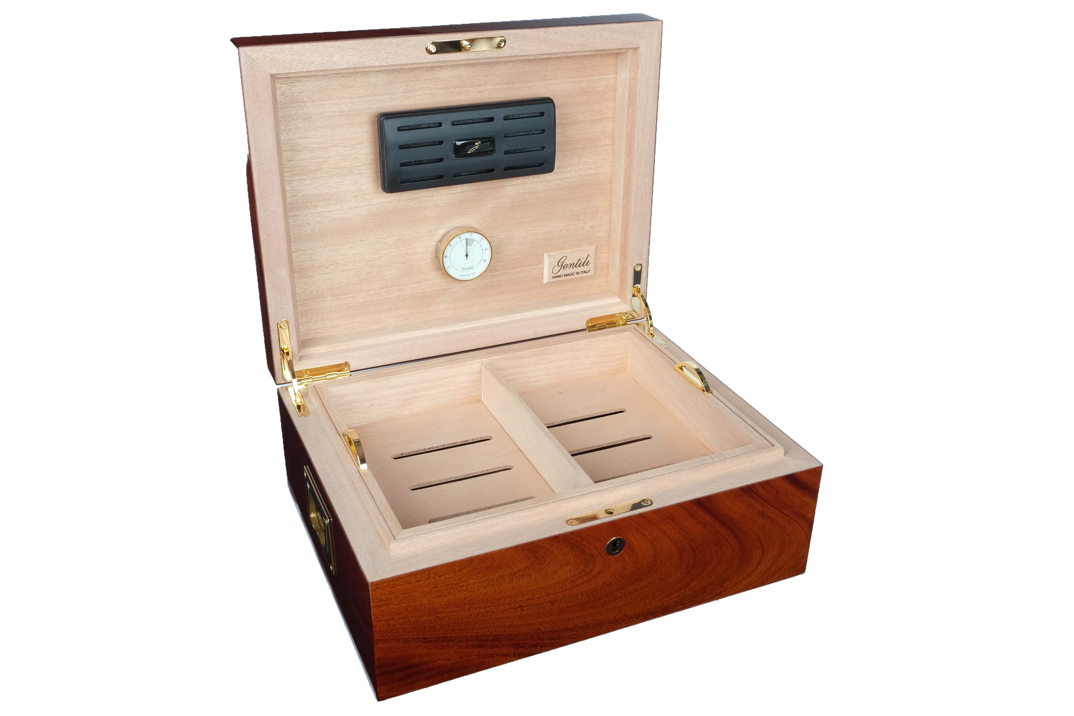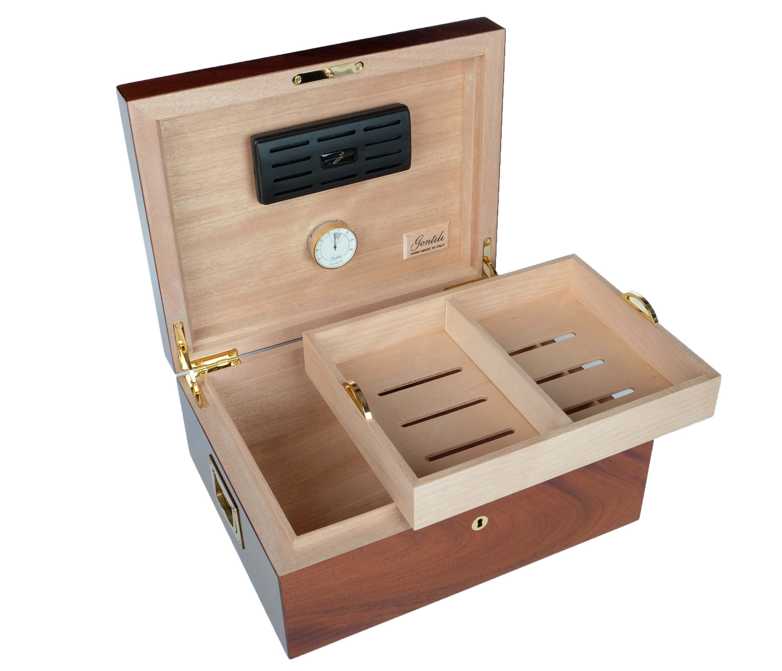 Хьюмидор gentili 545 di mogano на 70 сигар. Хьюмидор премиум-класса на 70 сигар от итальянских мастеров фабрики Fabrizio Gentili SRL. Модель характеризуется строгим классическим дизайном, подходящим для большинства интерьеров, и безупречностью в исполнении. Корпус представляет собой комбинацию нескольких видов дерева, что обеспечивает стойкость к деформации при колебаниях температуры и влажности. Внутренняя отделка выполнена из высококачественного испанского кедра, снаружи — великолепный шпон Махагона африканского в варианте Piuma («перо», итал. ), полученный путем строгания развилки ствола дерева, что создает уникальный симметричный рисунок с волнистыми разводами, напоминающими перо. Семислойный рояльный лак подчеркивает красоту рисунка и защищает шпон от внешних воздействий. В комплекте с хьюмидором идут увлажнитель с акриловым полимером последнего поколения, высокоточный откалиброванный итальянский гигрометр, съемный лоток с перегородками из кедра (для наилучшей сортировки и вентиляции сигар), фирменный буклет Gentili с информацией о компании и мультиязычной инструкцией по уходу. Подарочная упаковка. Ручная работа, сделано в Италии. Официальный сайт производителя: https://www. gentili-italy. com Материал Африканское красное дерево (Махагони), Испанский кедр Производитель GENTILI, Италия Размер 35х28х15, внутренний 28,8х21,8х10, вес 5 кг