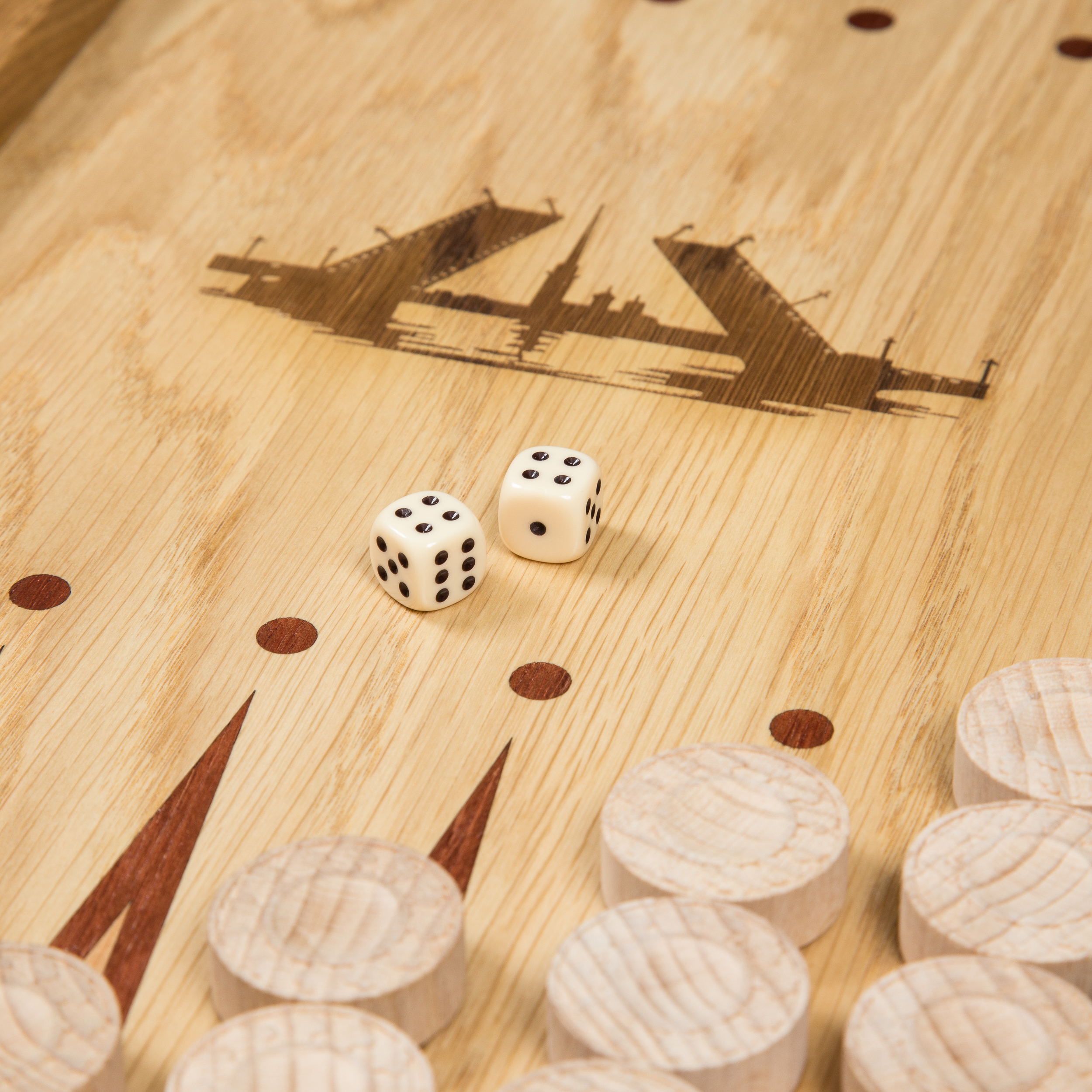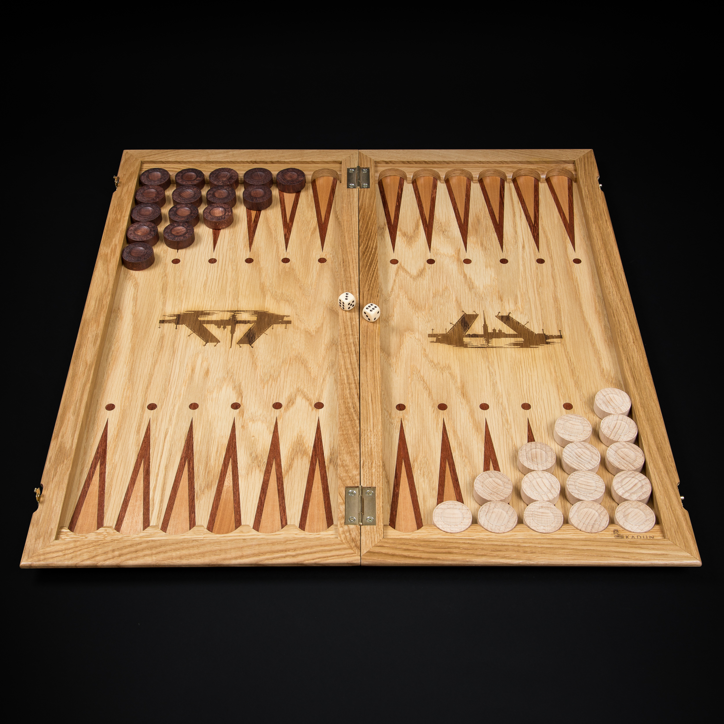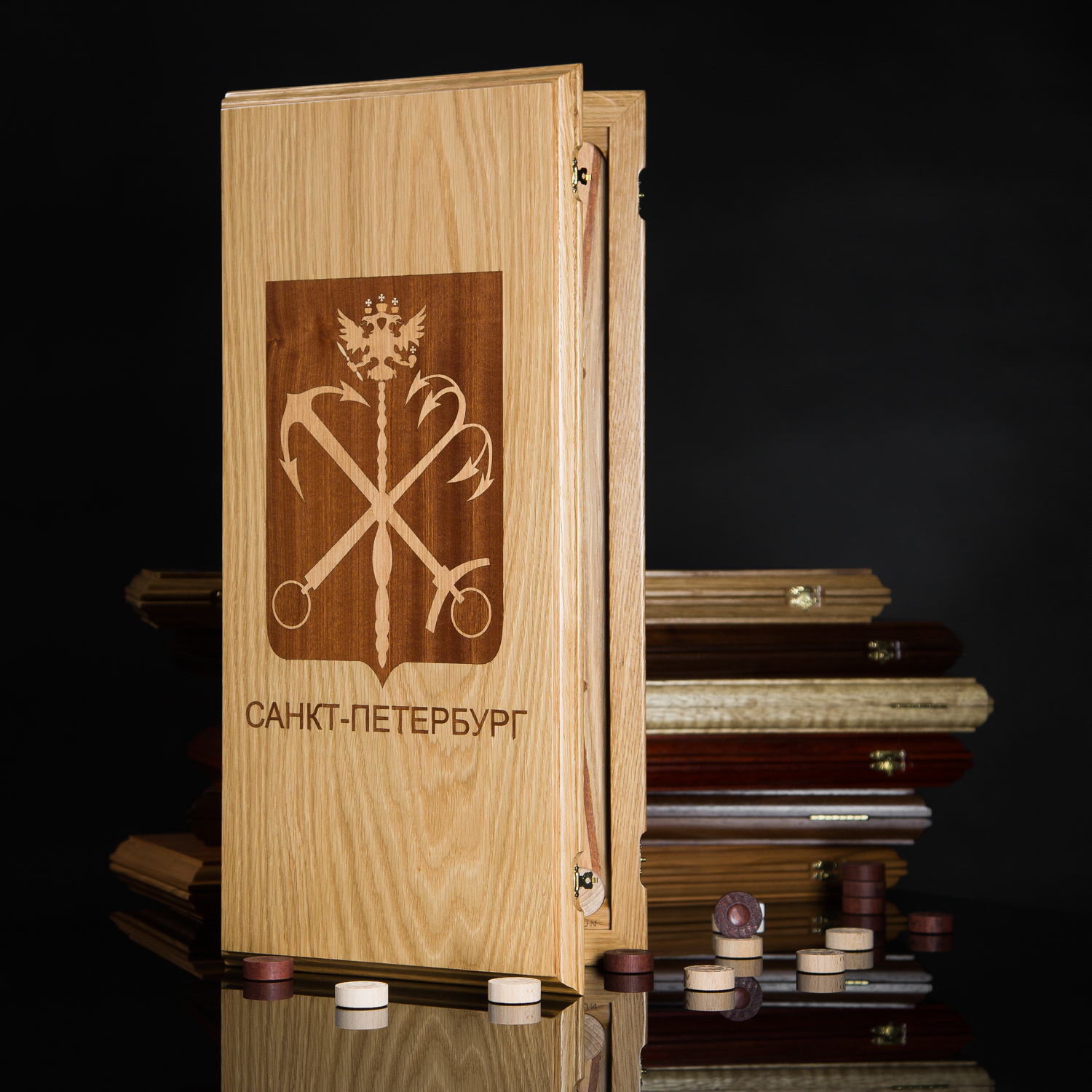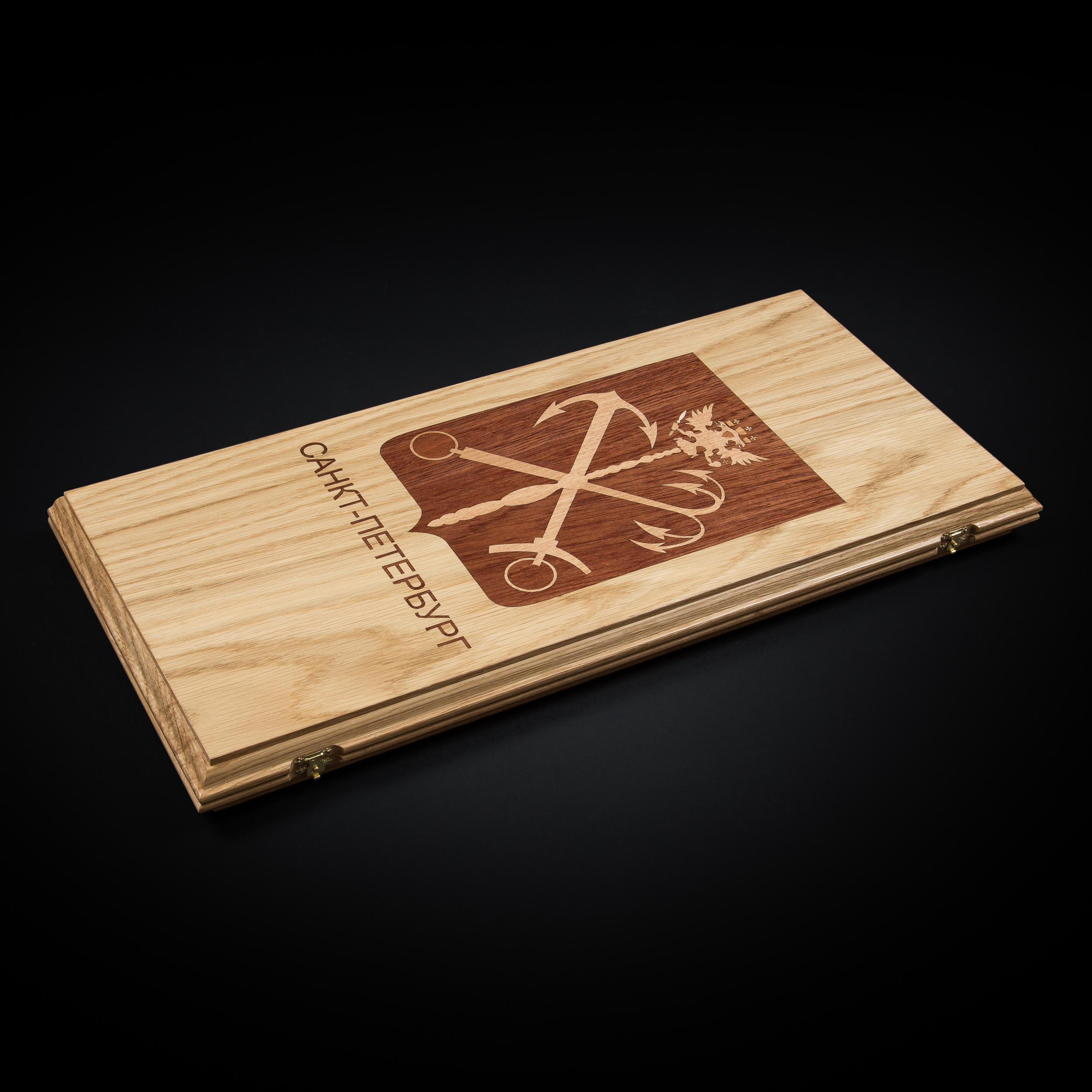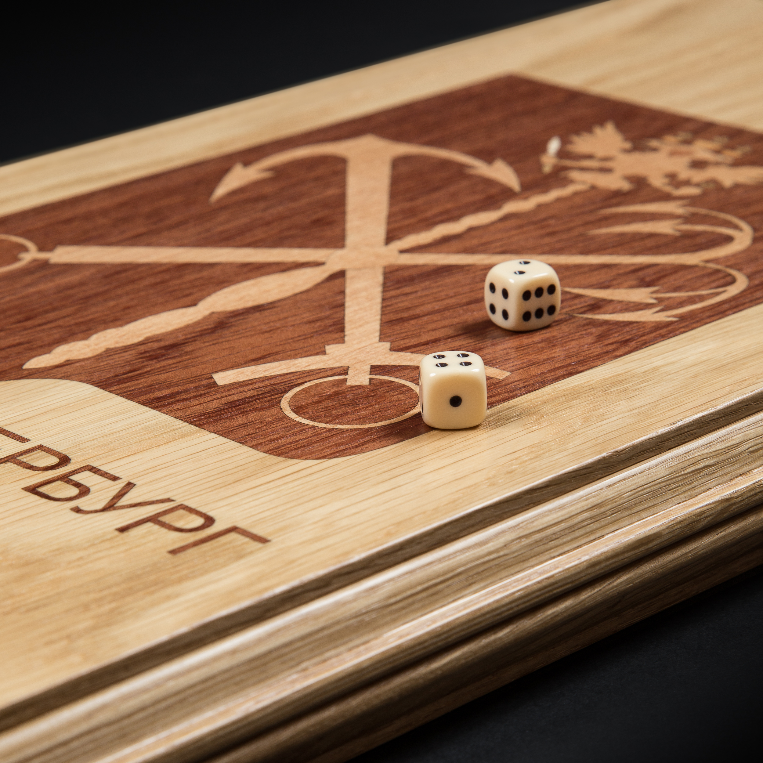 Нарды "герб петербурга" (светлый корпус) kadun. ручная работа, корпус полевой дуб, шелковисто-матовый лак, рисунок в технике маркетри( мозаика ) лицевая сторона – красное дерево, дуб, клен поле внутри - дуб, красное дерево, вишня шашки светлые - бук, темные - бук тонированный, подклеены тканью. кубики - пластик Размеры в сложенном виде длина 54см ширина 25см в раскрытом виде длина 54см ширина 50см шашки ручной работы диаметром 30мм, 30шт кубики грань 11мм 2шт