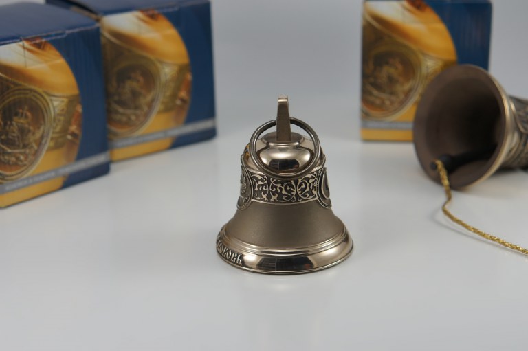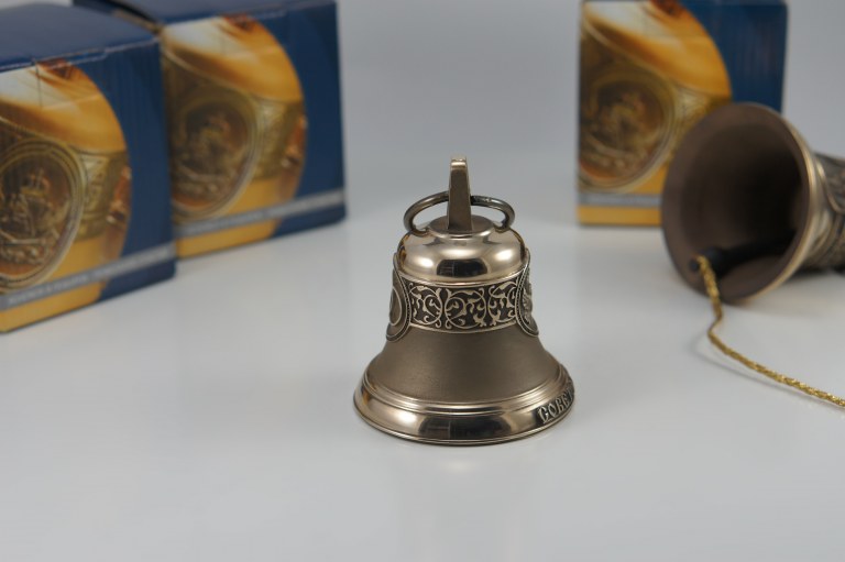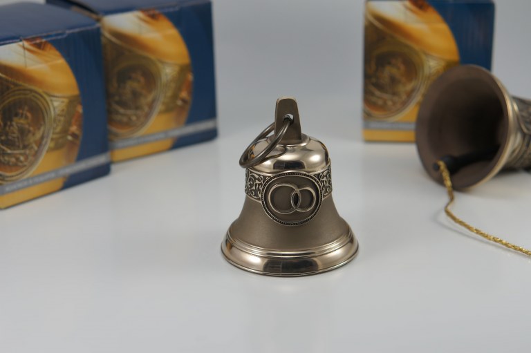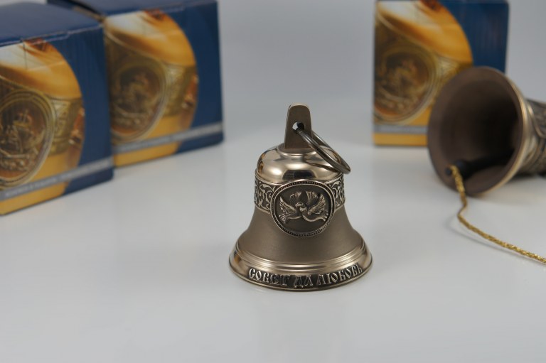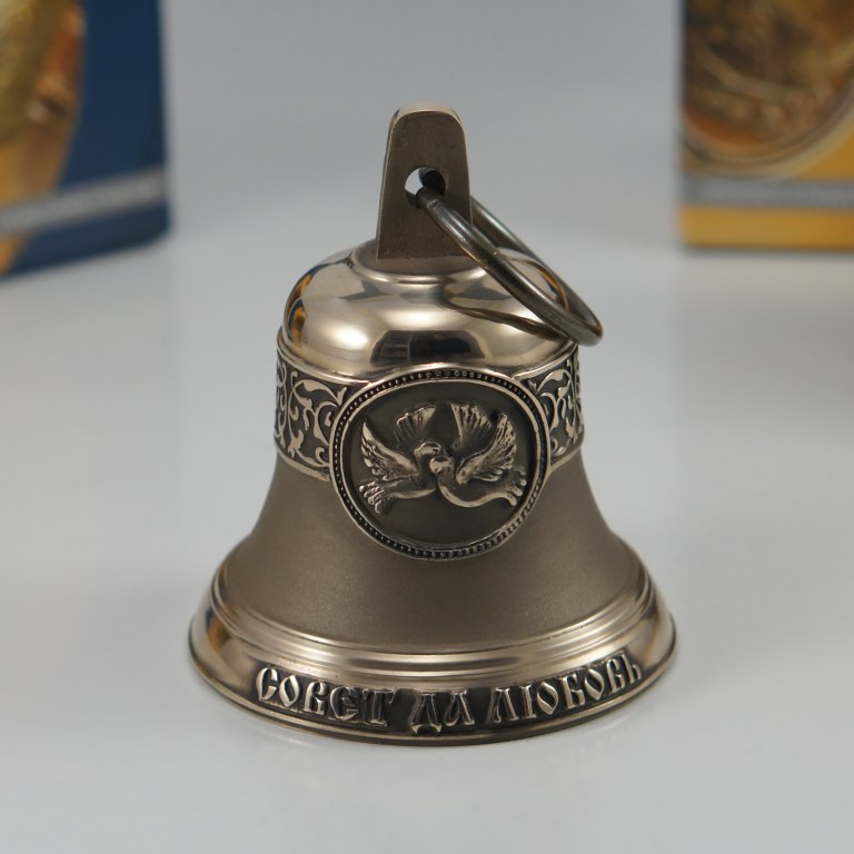 Колокол 0.3кг свадебный. Колокольчик является, наверное, самым символичным из традиционных свадебных подарков. Все многочисленные явления жизни, даже приметы, говорят о колоколе как носителе всех добрых начал, своеобразном обереге от злых и тёмных сил. А ведь свадебный колокольчик - это миниатюрная копия большого колокола. Там, где звенит колокольчик, ощущается гармония, там нет места раздорам и разладам, а значит, и люди там живут счастливо и дружно. С одной стороны: изображение пары голубей С другой стороны: изображение колец Надпись на колоколе: Совет да любовь Полированная бронза. Поверхность светлая матовая с вызолочением, полированна юбка и голова Уважаемые покупатели, просим обратить внимание что каждый колокольчик ручной работы и может незначительно отличаться от фотографий.