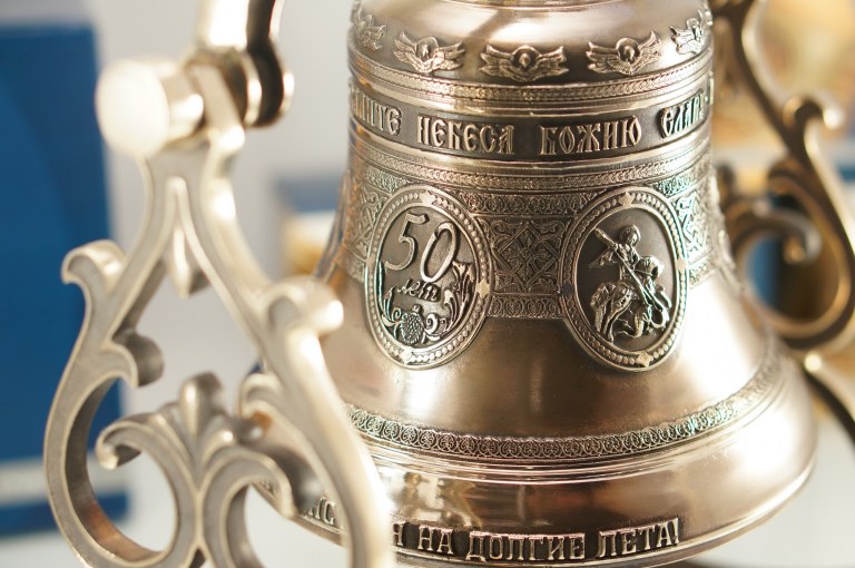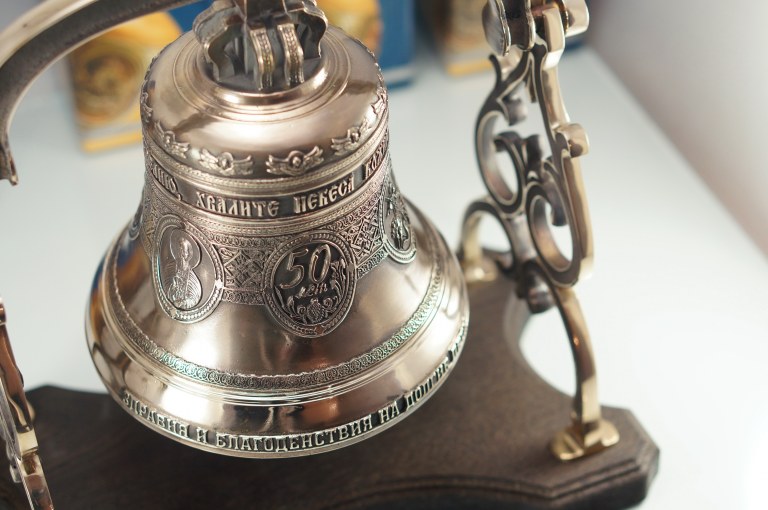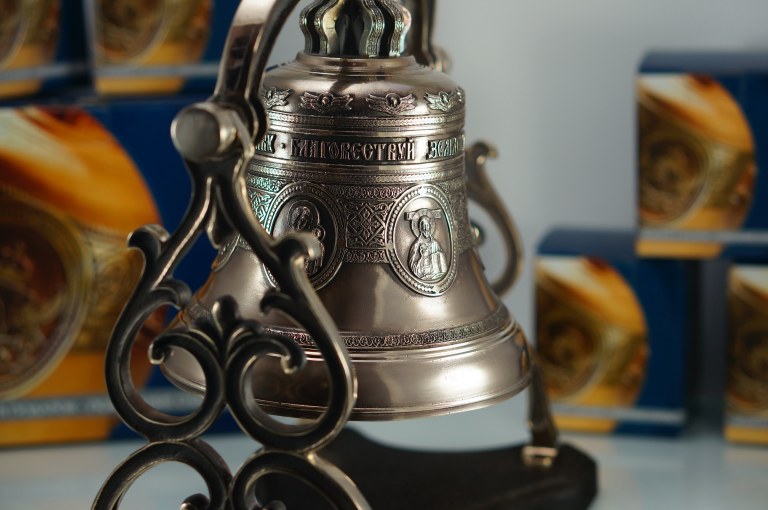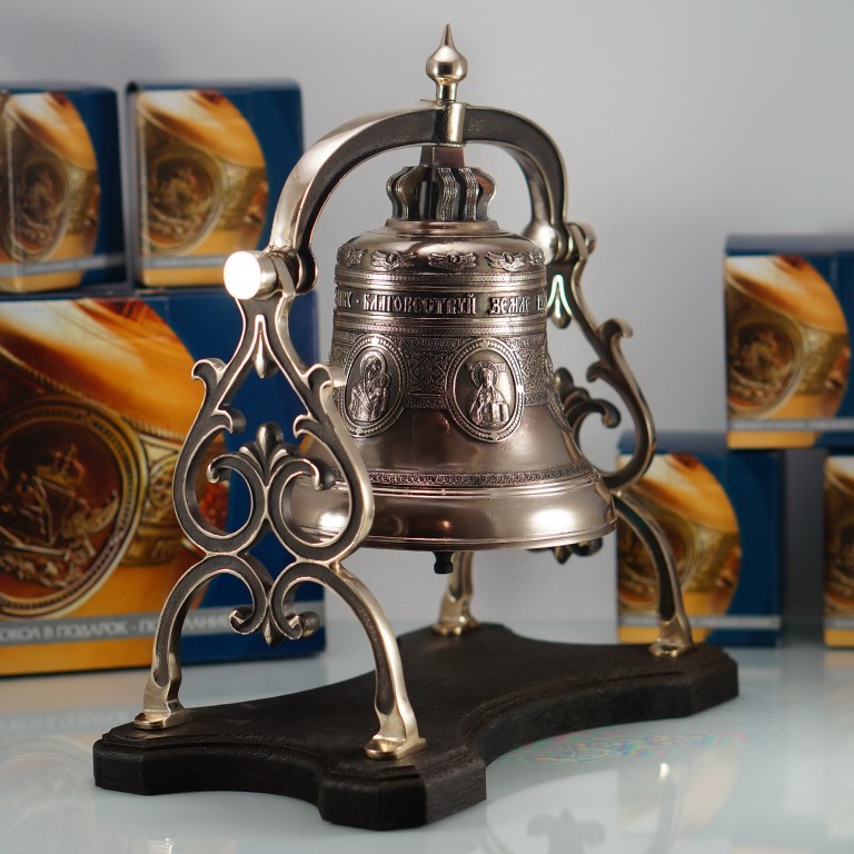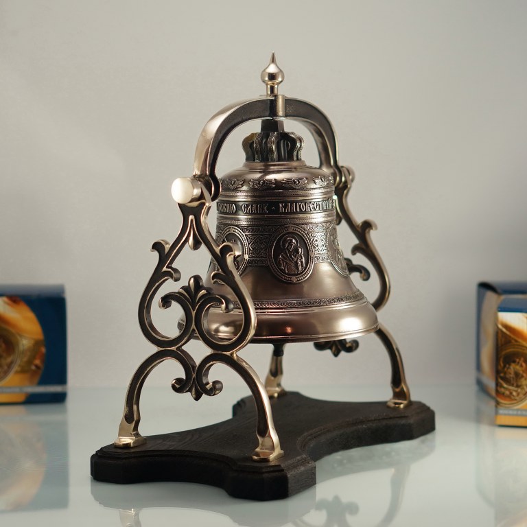 Колокол 3кг на бронзовой качалке с ликами православных святых. Колокол на качалке будет эксклюзивным и дорогим подарком, который оценят по достоинству. Колокол украшен ликами православных святых святителя и чудотворца Митрофана Воронежского, преподобного Сергия Радонежского, Великомученика Георгия Победоносеца, Казанской иконы Божией Матери, святителя Николая, архиепископа Мирликийского, иконой Господа Вседержителя. Поверхность колокола тонированная. Основание подставки дуб тонированный.