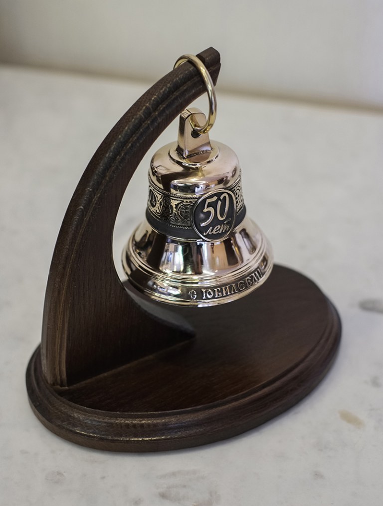 Колокол 0.3кг с юбилеем! на дубовой подставке. С Юбилеем». Этот уникальный подарок выражает заботу, любовь, уважение юбиляру. И мы с уверенностью можем сказать, что это индивидуальная работа единственная в своем роде, что делает такой подарок бесценным. В Библии древнееврейское слово «йовель» или «ювель» означало «бараний рог», позже — «год свободы». Так называли установленный пророком Моисеем год, когда проданные и заложенные земли возвращались к прежним владельцам, рабы получали свободу, прощались долги должникам, Закон (Тора) читался народу и земля отдыхала от полевых работ. Этот «год свободы» наступал каждые пятьдесят лет, после семи седьмиц, то есть семи семилетий. Число семь в древних традициях считалось священным, а помноженное на семь — священным в квадрате, так что год, следующий за таким сочетанием лет обязательно должен был не пройти даром и быть особенным. С одной стороны: Спас Нерукотворный с одной стороны и 50 лет с другой. С другой стороны: 50 лет (может быть заменена по желанию заказчика) Надпись на колоколе: С юбилеем! (может быть заменена по желанию заказчика)