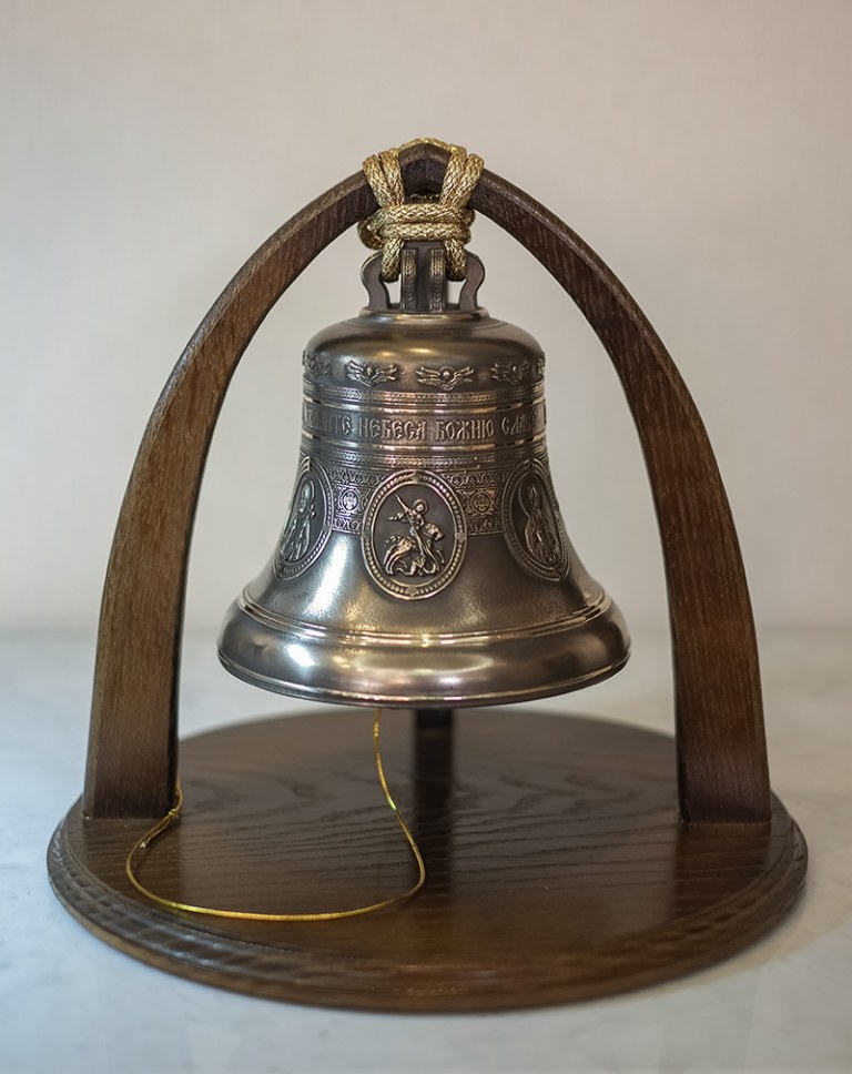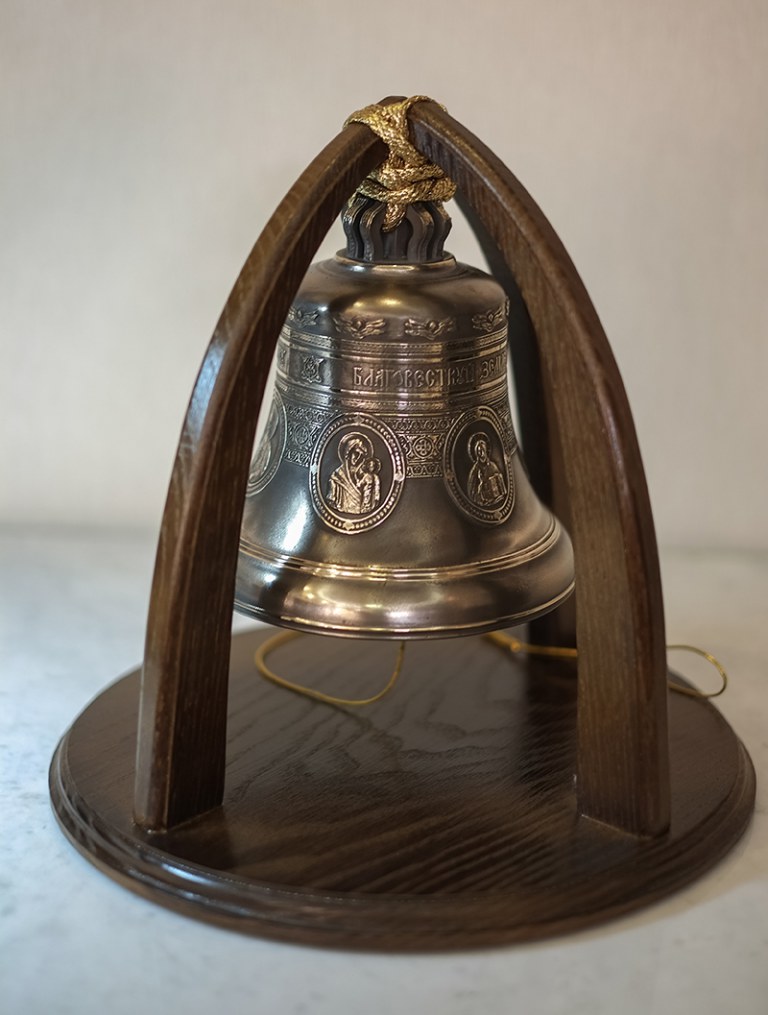 Колокол 3кг с шестью иконами святых на дубовой подставке. Колокол будет эксклюзивным и дорогим подарком, который оценят по достоинству. Колокол с шестью иконами Святых: Господь Вседержитель, Казанская икона Божией Матери, Св. прп. Сергий Радонежский, Св. Вмч. Георгий Победоносец, Святитель Николай Чудотворец, Св. Митрофан Воронежский Надпись: БЛАГОВЕСТВУЙ ЗЕМЛЕ РАДОСТЬ ВЕЛИЮ, ХВАЛИТЕ НЕБЕСА БОЖИЮ СЛАВУ