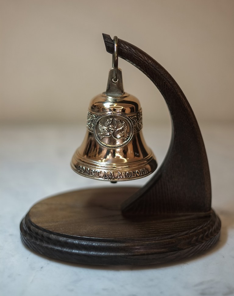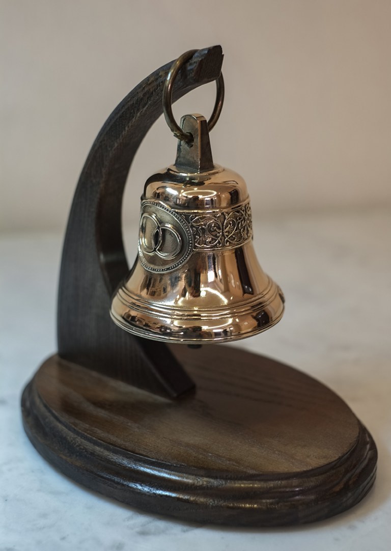 Колокол 0.3кг п свадебный на дубовой подставке. Колокольчик является, наверное, самым символичным из традиционных свадебных подарков. Все многочисленные явления жизни, даже приметы, говорят о колоколе как носителе всех добрых начал, своеобразном обереге от злых и тёмных сил. А ведь свадебный колокольчик - это миниатюрная копия большого колокола. Там, где звенит колокольчик, ощущается гармония, там нет места раздорам и разладам, а значит, и люди там живут счастливо и дружно. С одной стороны: изображение пары голубей С другой стороны: изображение колец Надпись на колоколе: Совет да любовь Полированная бронза.