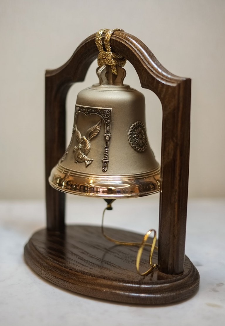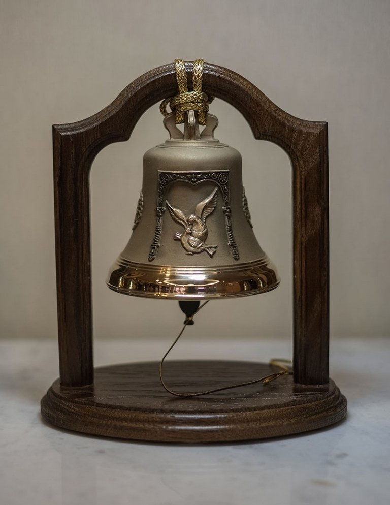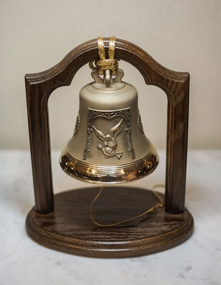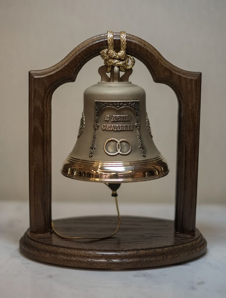 Колокол 1кг п в день свадьбы на дубовой подставке. Колокольчик является, наверное, самым символичным из традиционных свадебных подарков. Все многочисленные явления жизни, даже приметы, говорят о колоколе как носителе всех добрых начал, своеобразном обереге от злых и тёмных сил. А ведь свадебный колокольчик - это миниатюрная копия большого колокола. Там, где звенит колокольчик, ощущается гармония, там нет места раздорам и разладам, а значит, и люди там живут счастливо и дружно. С одной стороны: изображение пары голубей С другой стороны: изображение колец и надпись В ДЕНЬ СВАДЬБЫ Поверхность колокола матовая с вызолочением.