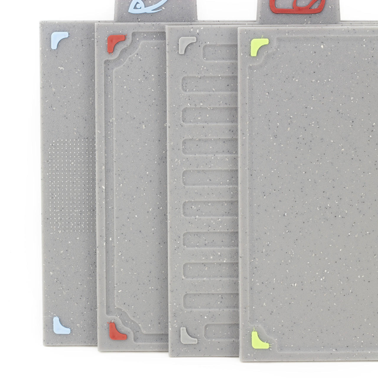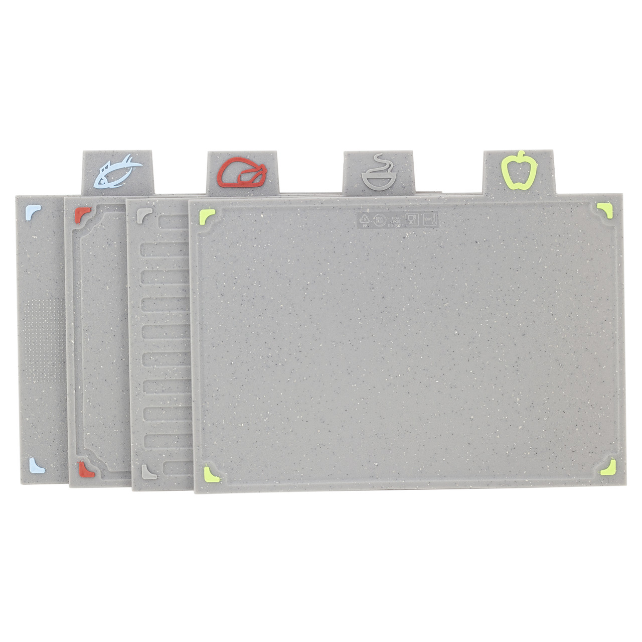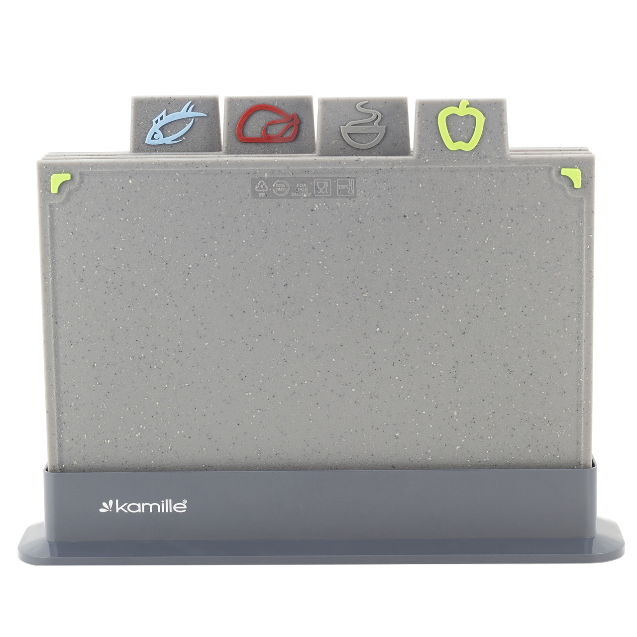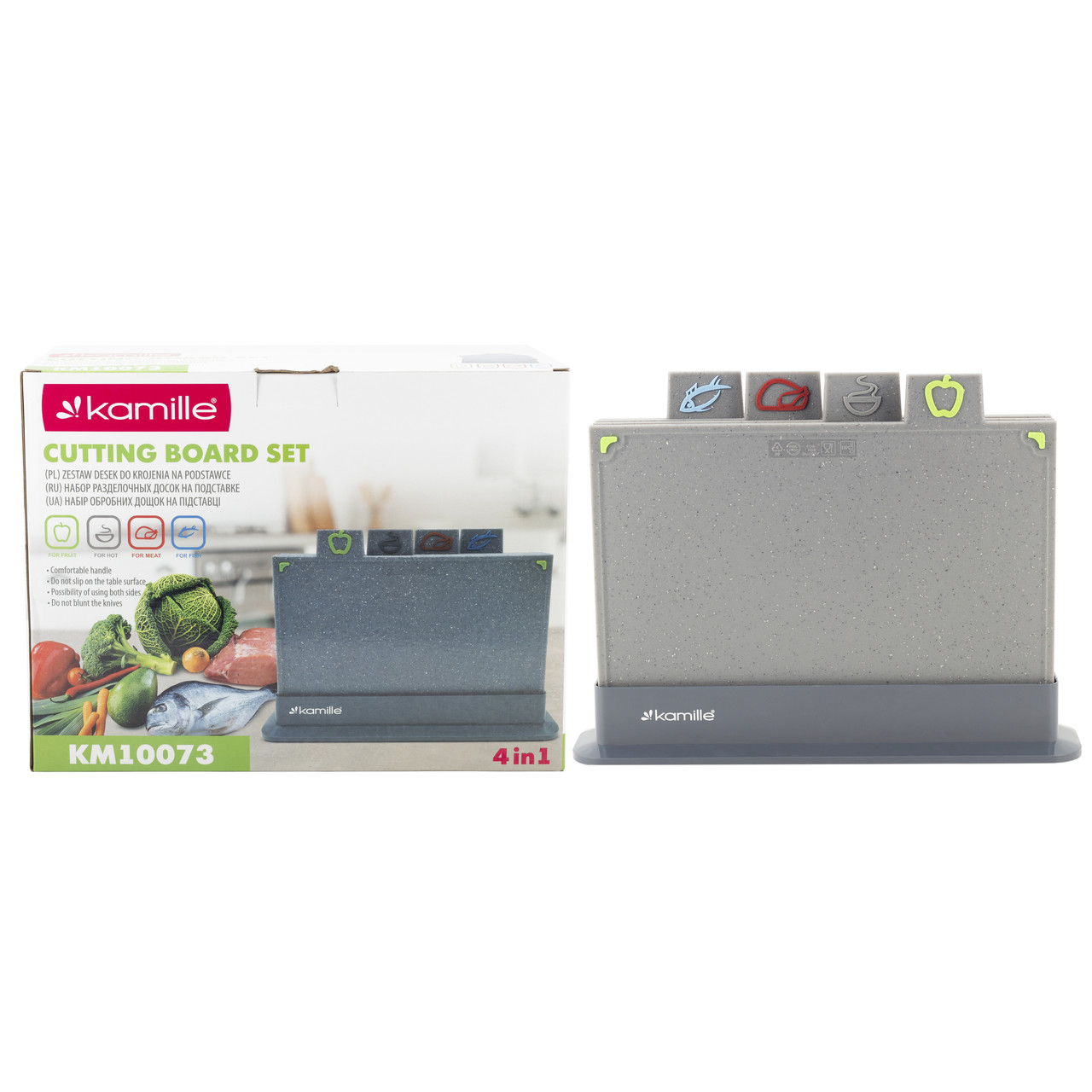 Набор разделочных досок на подставке kamille km-10073. Бренд: Kamille Описание: Набор разделочных досок Kamille KM-10073 очень удобен и компактен, благодаря чему отлично впишется в любой интерьер кухни. В комплект входит 4 доски с текстурированной поверхностью созданной специально для определенного типа продуктов, и небольшими бортами, удерживающими сок и крошки нарезаемых продуктов. Доски изготовлены из высококачественного пластика, который не затупляет ножи и при резке не оставляет микроскопических частиц на пище. Силиконовые ножки препятствуют скольжению аксессуара по столешнице. А возможность мыть досточки в посудомоечной машине точно порадует любого кулинара. Простая и вместе с тем эффективная маркировка позволяет легко распределять доски для разных типов продуктов, сохраняя максимальную гигиену в процессе нарезки и исключая взаимное загрязнение продуктов. Специальные ярлыки помогают определить, какую доску следует использовать для разных ингредиентов: сырого мяса, рыбы, овощей или хлеба. Доски из набора Kamille можно использовать с двух сторон, не задумываясь. Комплект: 4 досточки + подставка. Размеры: 29х19,5х0,6 см. Цвет: серый гранит. Материал: ПП. Возможно использовать обе стороны доски. Подходит для посудомоечной машины.