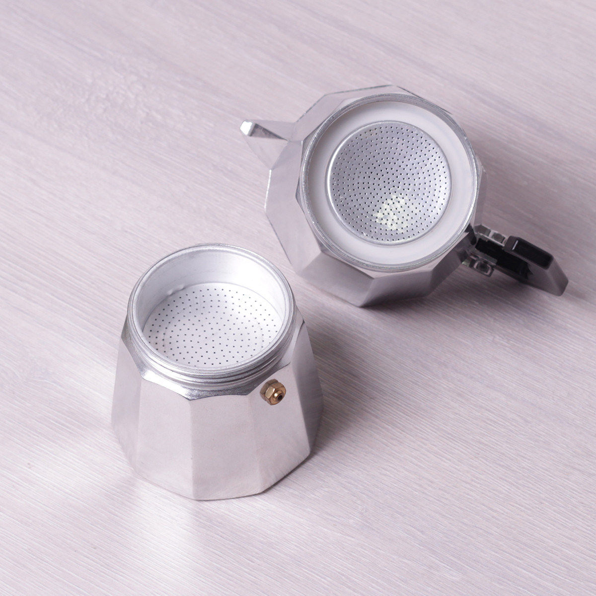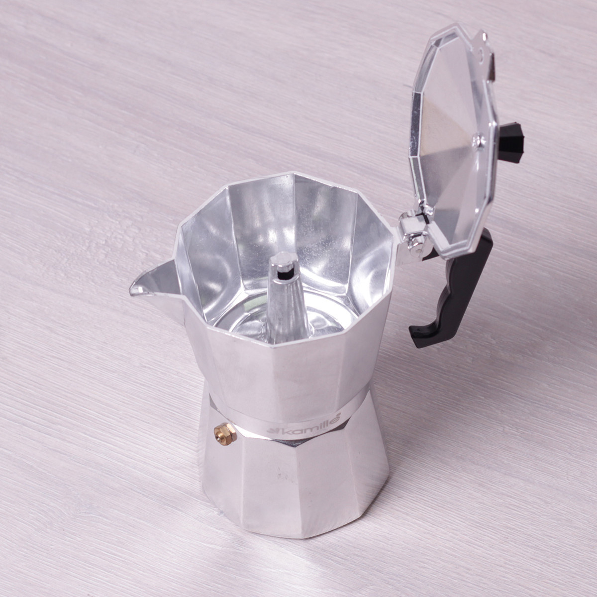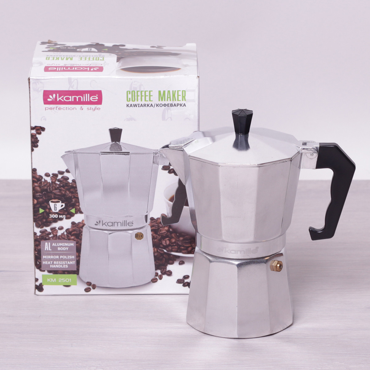 Кофеварка гейзерная kamille 300мл из алюминия. Бренд: Kamille Описание: Гейзерная кофеварка Kamille создана для приготовления великолепного кофе по современным итальянским технологиям. Используя ее на любых кухонных плитах (за исключением индукционных), за считанные минуты Вы сможете насладиться чашкой ароматного, хорошо проваренного кофе. Материал: алюминий Материал ручки: бакелит Высота: 19см Диаметр дна: 8. 5см Объем: 300мл Количество порций: 6 Комплектация: нижняя емкость для воды емкость-фильтр для кофе фильтр силиконовое кольцо верхняя емкость Использование: Наполните нижнюю емкость водой, поместите сверху емкость-фильтр и наполните ее молотым кофе, не утрамбовывая его. Оденьте верхнюю секцию и прокрутите для закрытия. Убедитесь, что фильтр и силиконовое кольцо на месте и плотно прилегают друг к другу. Обратите внимание, что очень важно обеспечить таким образом полную герметичность. При приготовлении кофе уровень нагревания должен быть низким! Когда кофе перестанет поступать в верхнюю емкость, кофеварку необходимо убрать с нагревающей поверхности. Ароматный горячий кофе готов. Уход: После остывания кофеварки рекомендуется сразу раскрутить и вымыть ее при помощи небольшого количества моющего средства. Производить сборку только в сухом виде!