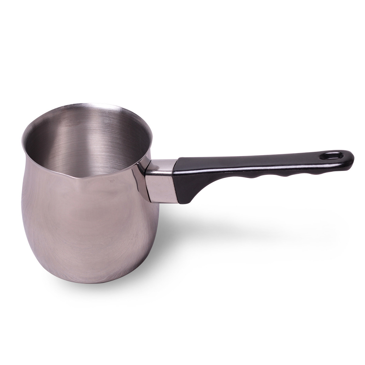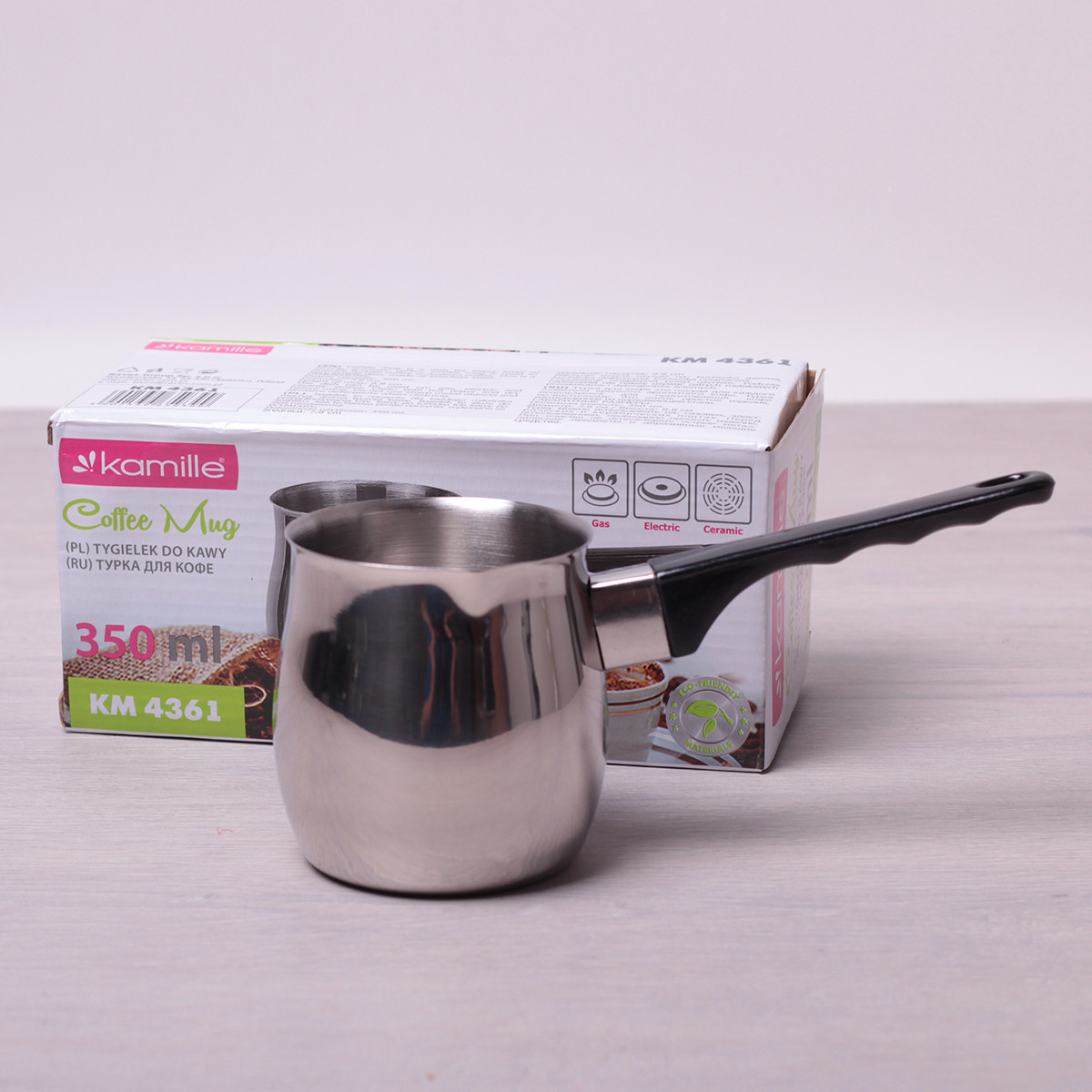 Турка для кофе kamille 350мл из нержавеющей стали. Бренд: Kamille Описание: Турка для кофе Kamille создана для приготовления великолепного кофе по-восточному. Используя ее на любых кухонных плитах (за исключением индукционных) Вы сможете насладиться чашкой ароматного и вкусного кофе. Материал: нержавеющая сталь Полировка металла: зеркальная/сатин Материал ручки: бакелит Высота: 8. 5см Диаметр: 7. 7см Длина (с ручкой): 19. 3см Объем: 350мл Уход: После остывания турки рекомендуется сразу вымыть ее при помощи небольшого количества моющего средства.