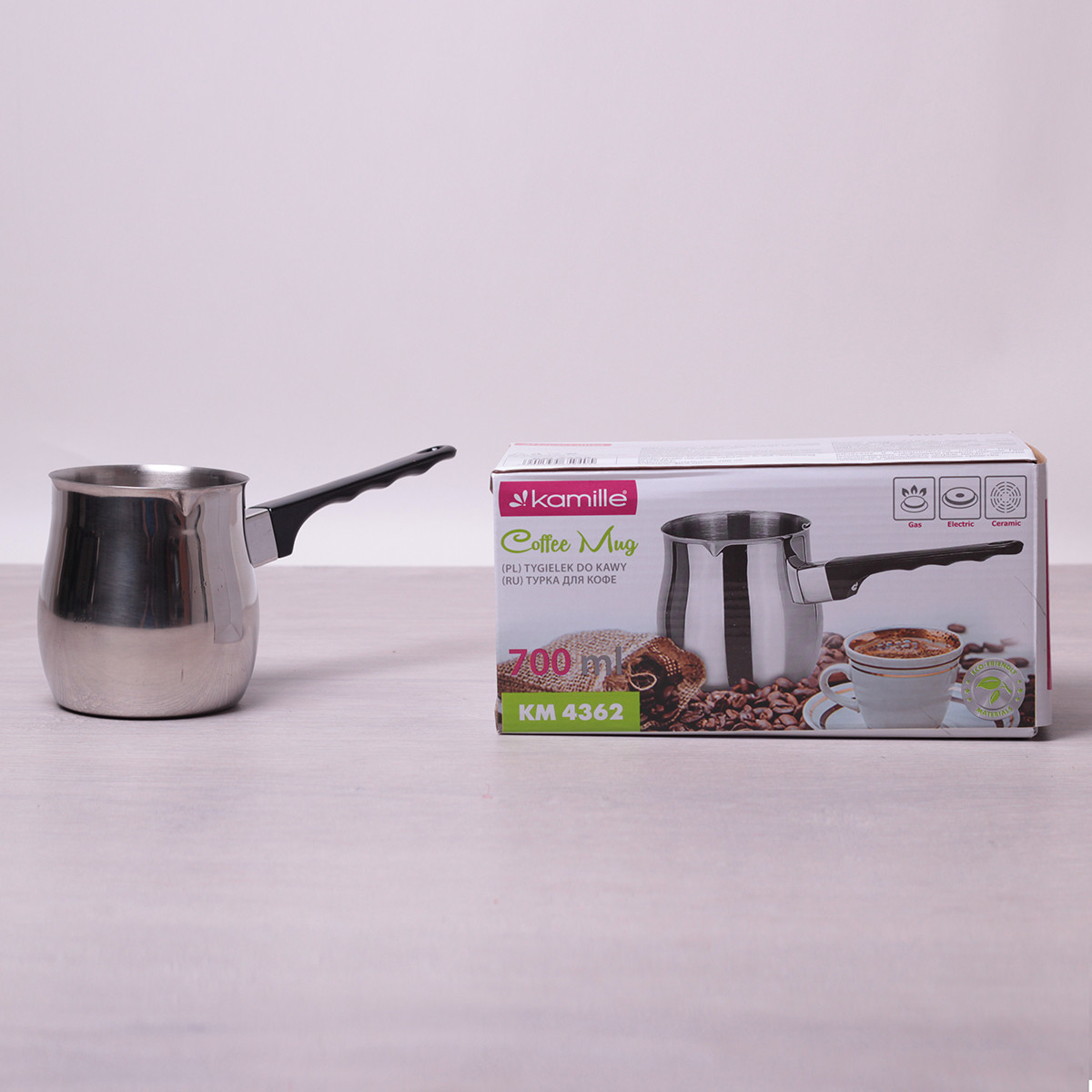 Турка для кофе kamille 700мл из нержавеющей стали. Бренд: Kamille Описание: Турка для кофе Kamille создана для приготовления великолепного кофе по-восточному. Используя ее на любых кухонных плитах (за исключением индукционных) Вы сможете насладиться чашкой ароматного и вкусного кофе. Материал: нержавеющая сталь Полировка металла: зеркальная/сатин Материал ручки: бакелит Высота: 10. 5см Диаметр: 9. 1см Длина (с ручкой): 22. 4см Объем: 700мл Уход: После остывания турки рекомендуется сразу вымыть ее при помощи небольшого количества моющего средства.