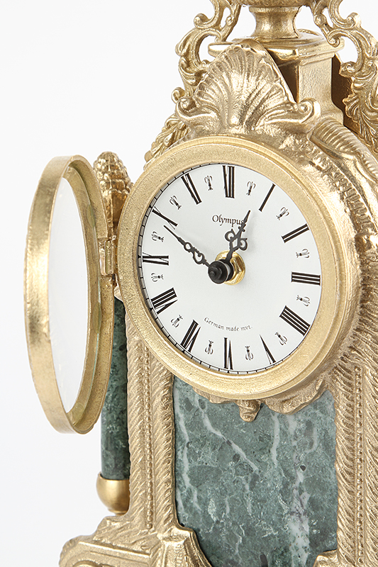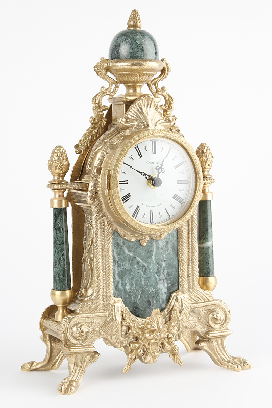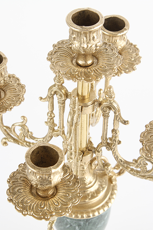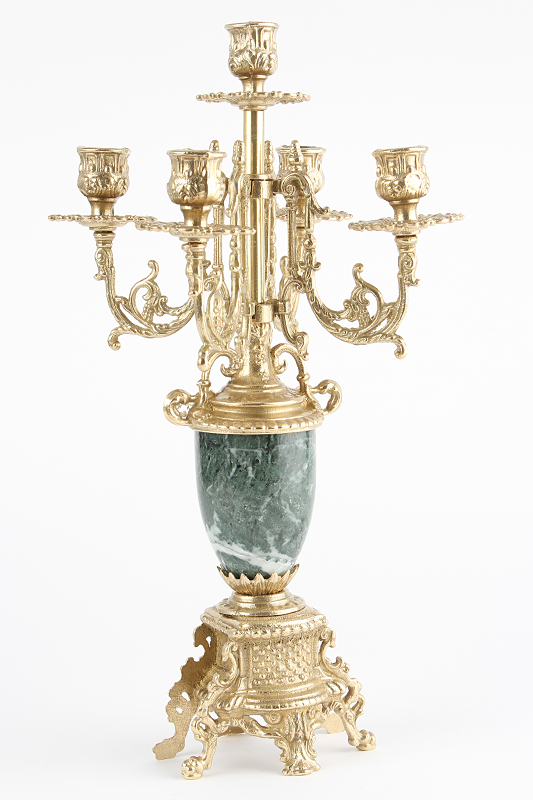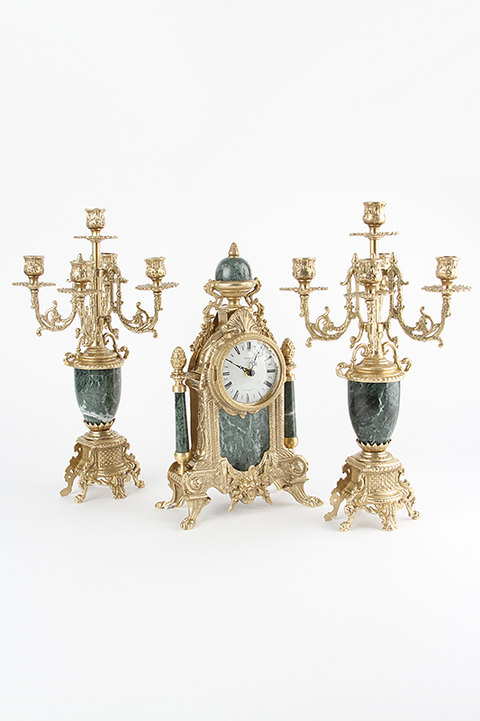 Набор часы (45х25х18 см) + 2 канделябра (50х20х18 см), латунь, мрамор зеле