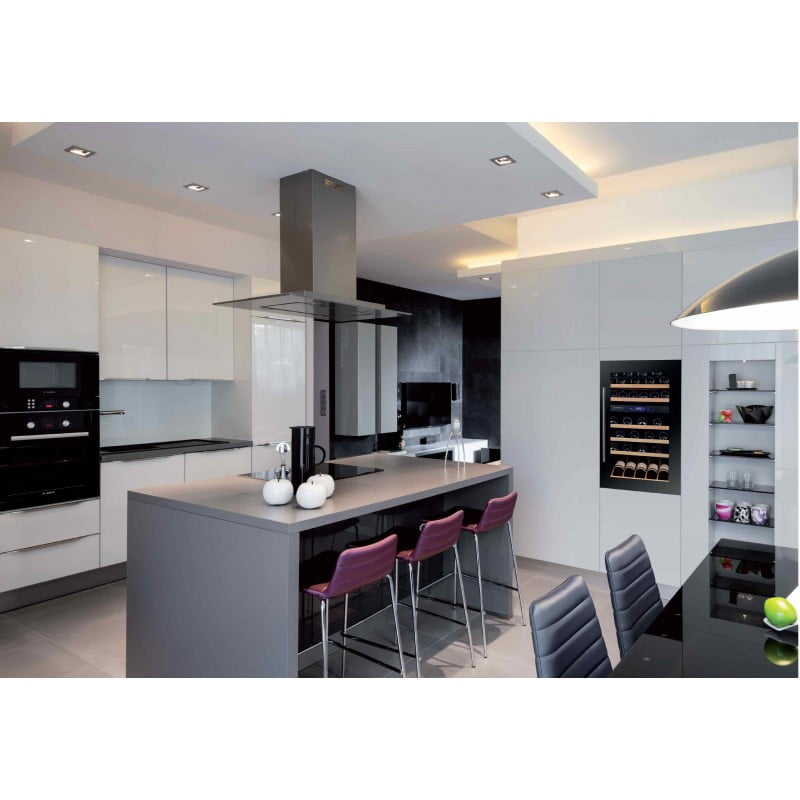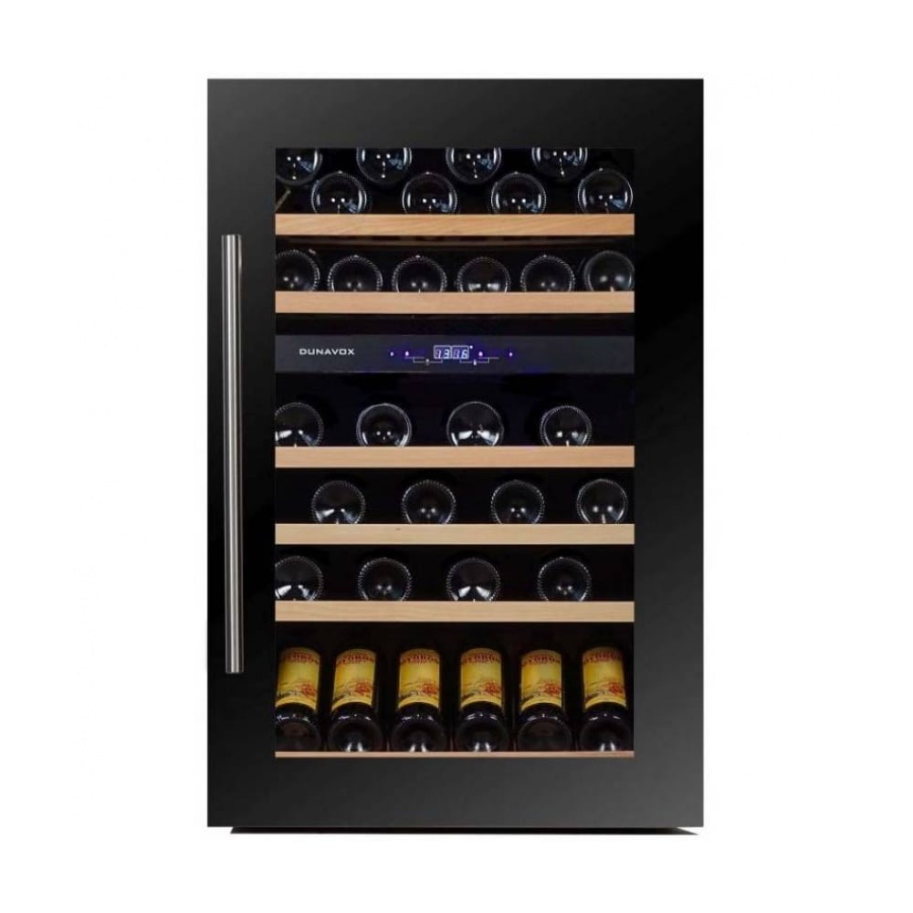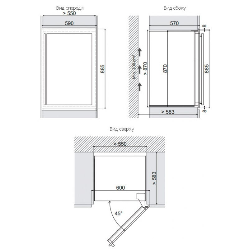 Винный шкаф dunavox build-in dx-57.146dbk, товары для загородного дома. Встраиваемый шкаф для вина Dunavox DX-57. 146DBK - это новейшая модель с усовершенствованной системой охлаждения для создания оптимальных условий хранения и подготовки к дегустации вина. Комплектуется шестью деревянными полками, имеется возможность заказать дополнительную полку для демонстрации бутылок. Шкаф оснащен сенсорной панелью управления, с помощью которой пользователь выбирает необходимый температурный режим работы аппарата. В модель DX-57. 146DBK встроены такие функции как: функция звукового оповещения об открытой двери и энергосберегающая функция Отдых, позволяющая при работающем холодильнике (работающем охлаждении вина) на время отключить дисплей, подсветку и звуковые оповещения. Корпус модели DX-57. 146DBK металлический с покрытием черного цвета, дверца выполнена из прозрачного двойного стеклопакета, защищенного от воздействия ультрафиолетовых лучей. Ручка двери удобная, накладная, выполнена из нержавеющей стали. Цифровой индикатор температуры и внутреннее освещение на светодиодах синего цвета. Винный шкаф Dunavox DX-57. 146DBK предназначен для встраивания в нишу. Для обеспечения охлаждения компрессора и отвода горячего воздуха необходимо предусмотреть сквозную вентиляционную нишу площадью не менее 200 см? от цоколя до верхней части мебельного модуля (см. рисунок). Рекомендуется устанавливать винный шкаф Dunavox DX-57. 146DBK вдали от прямых солнечных лучей и источников тепла (духовки, нагревателя, батареи и т. д. ). Прямой солнечный свет может плохо повлиять на корпус, а источники тепла могут увеличить энергопотребление. Не допускается установка аппарата рядом с плитой или прибором, который может нагревать воздух в пространстве 1-5 см от его корпуса (например, рядом с холодильником, у которого теплообменная стенка граничит с аппаратом). Не рекомендуется устанавливать прибор на полы с подогревом без специальной термоизолирующей подложки. Тип охлаждения Компрессорный Тип установки Встраиваемый Размеры шкафа, см 870х545х570 Количество зон Две Объем, Л 146