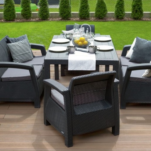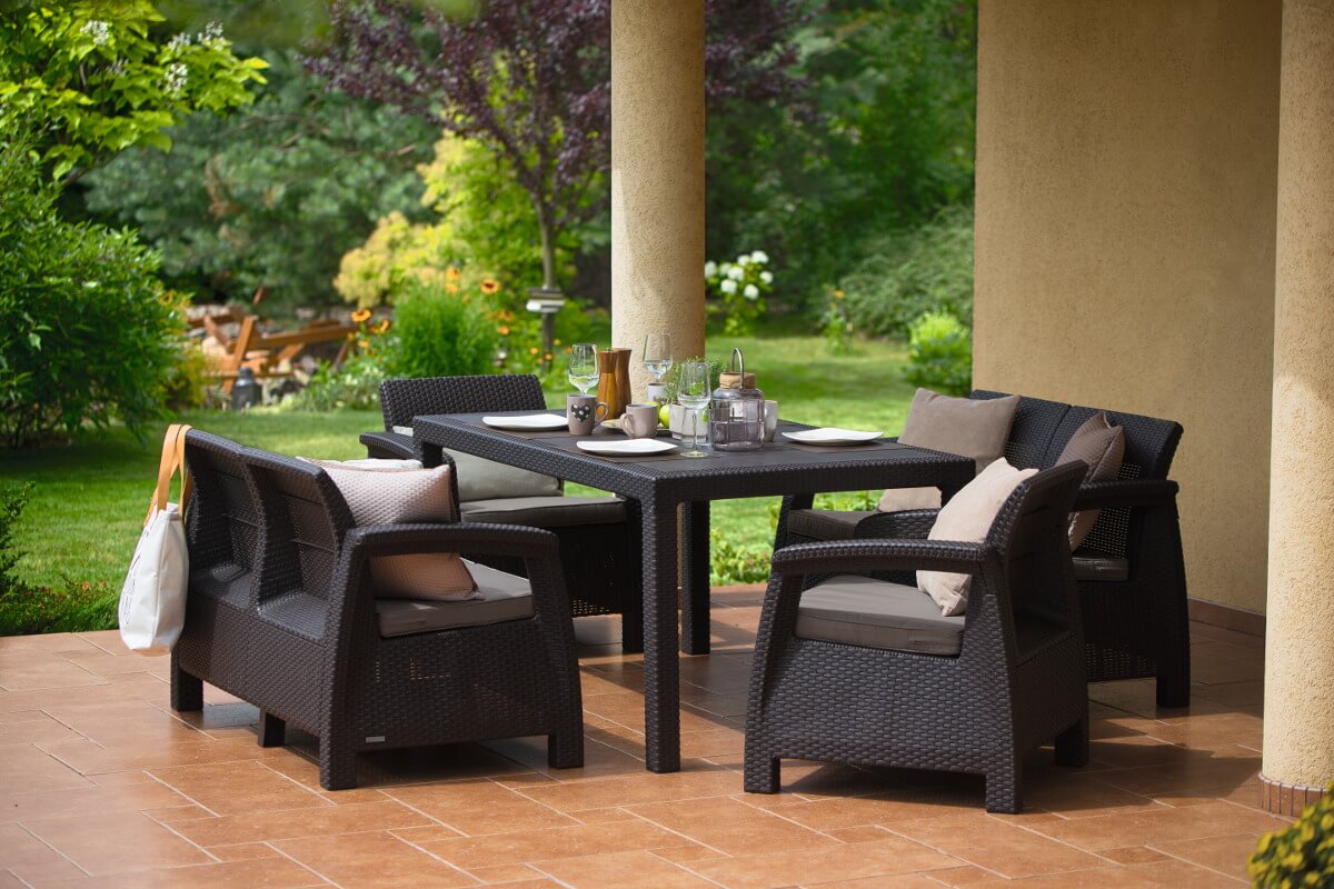 Обеденная группа keter corfu fiesta коричневая, садовая мебель. Шикарная обеденная группа Keter Corfu Fiesta Keter станет украшением лаунж зоны. Она состоит из 2 диванов, 2 кресел и 1 стола в коричневом цвете. Все предметы выполнены в едином стиле, который сочетает в себе классические и новомодные тенденции. Кресла и диваны дополнены удобными подлокотниками, что создает условия для максимального комфорта. В целом обеденная группа способна разместить 6 человек. nbsp Благодаря стойкому к высоким температурам полипропилену, цвета не выгорают и не бледнеют Диван, см 128 Х 70 Х 79 Кресло, см 75 Х 70 Х 79 Обеденный стол, см 160,5 Х 94,5 Х 74,5 Материал изделия Полипропилен Страна бренда Израиль