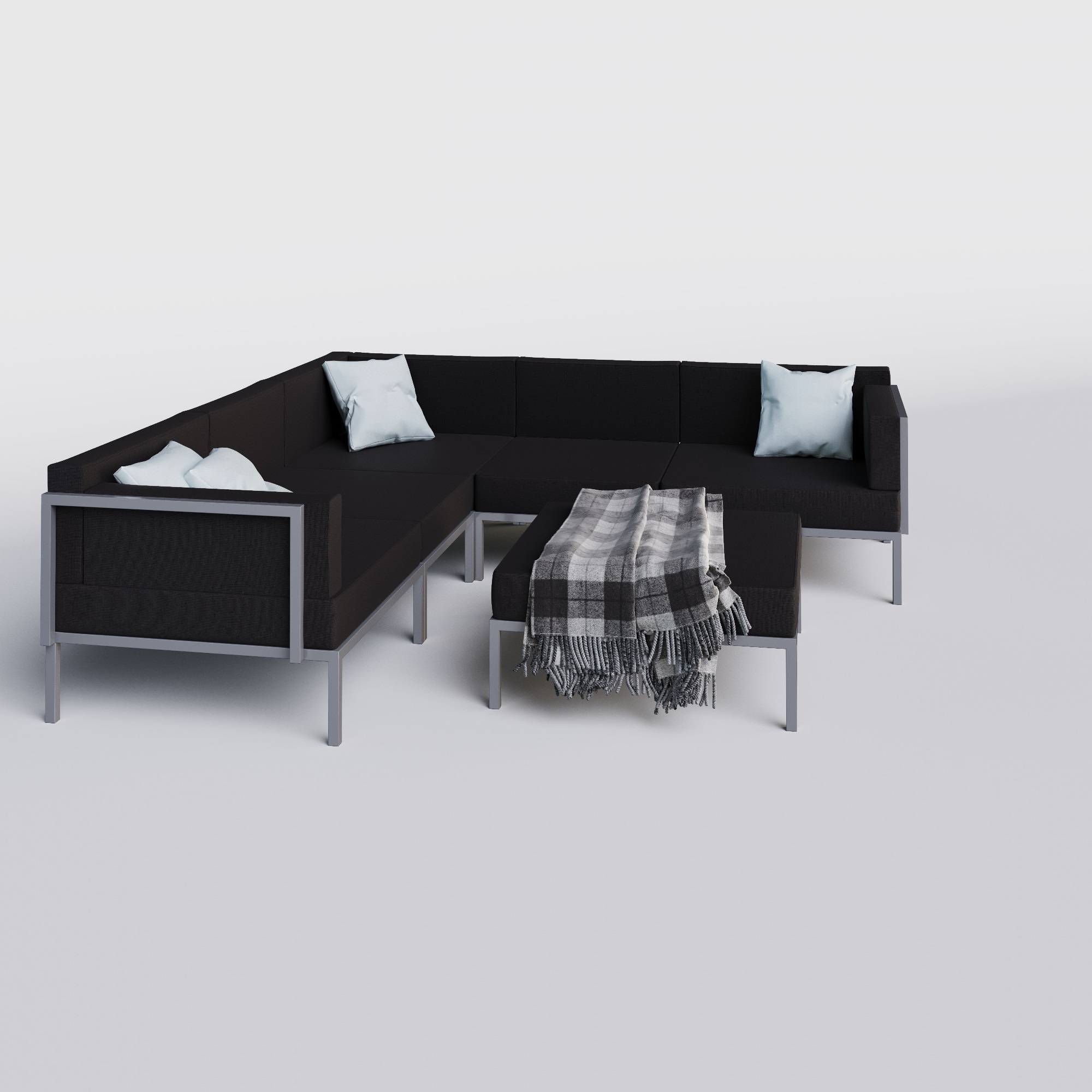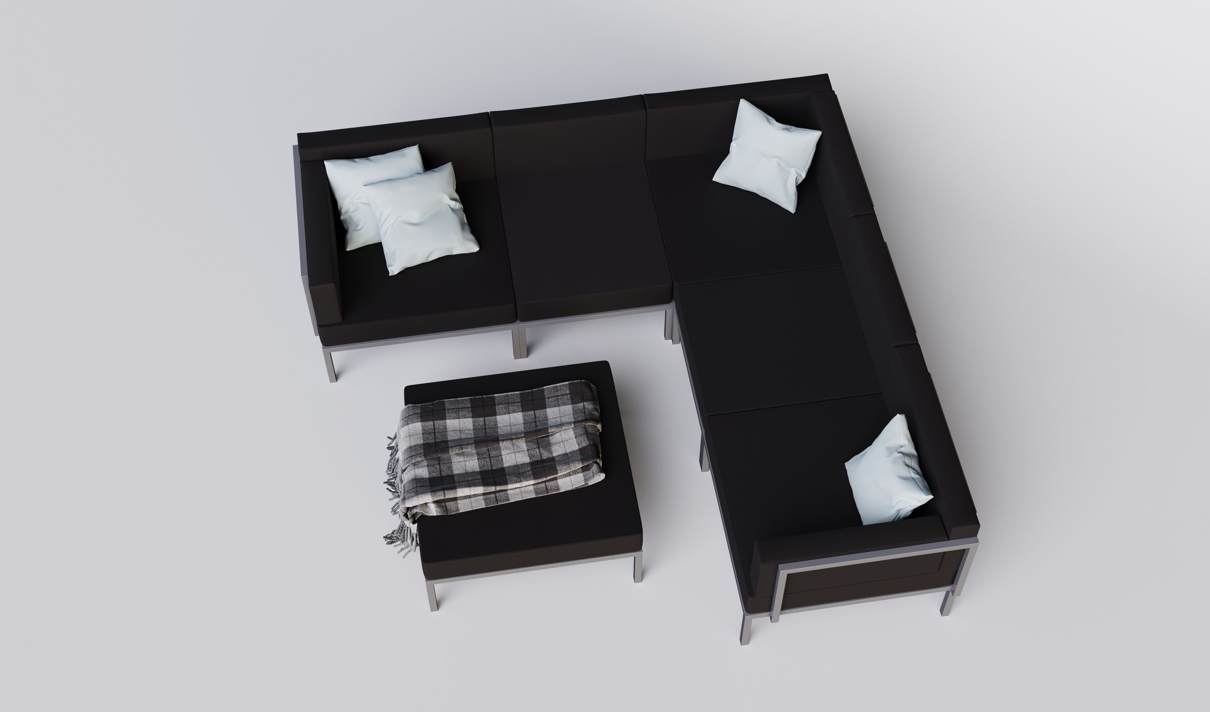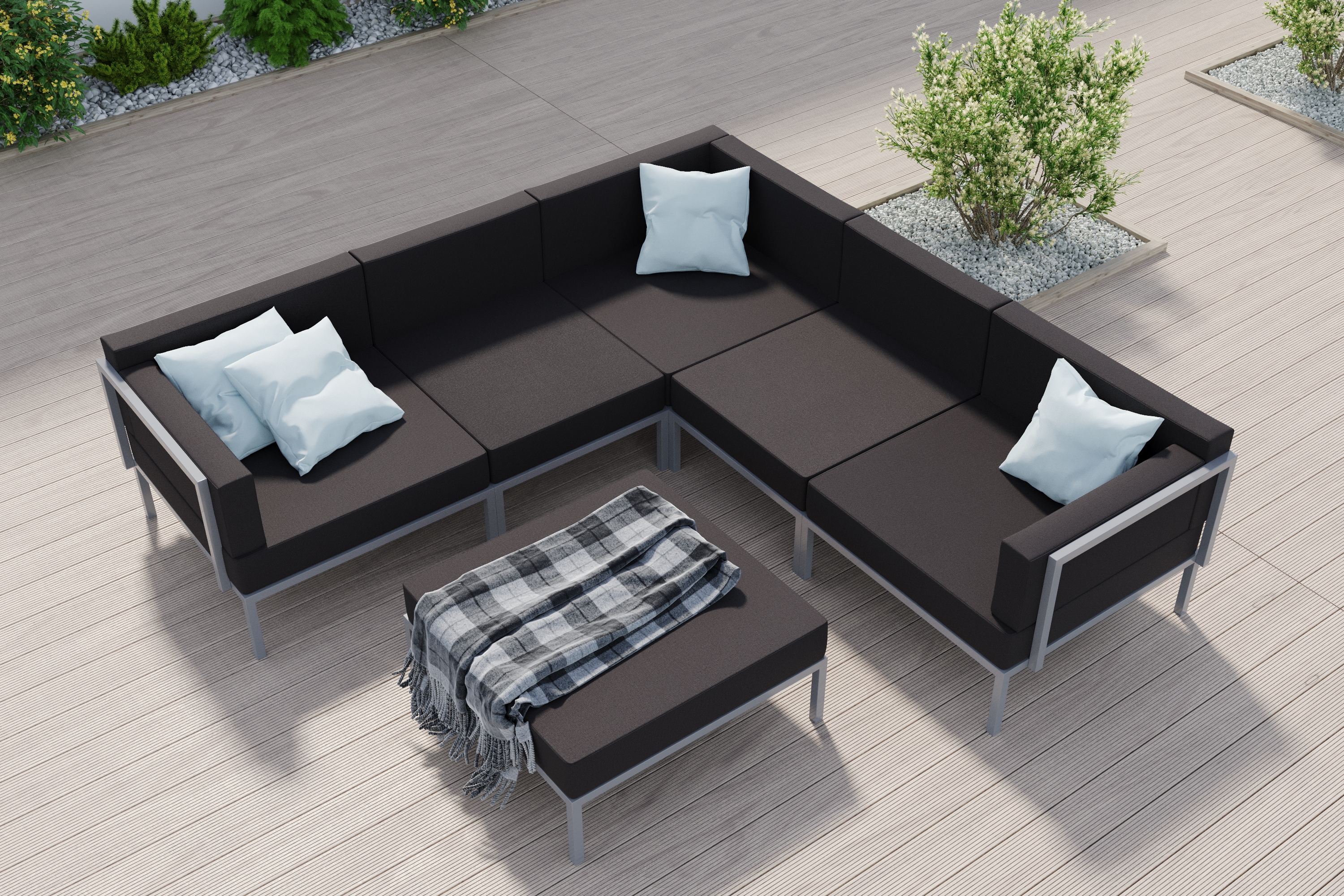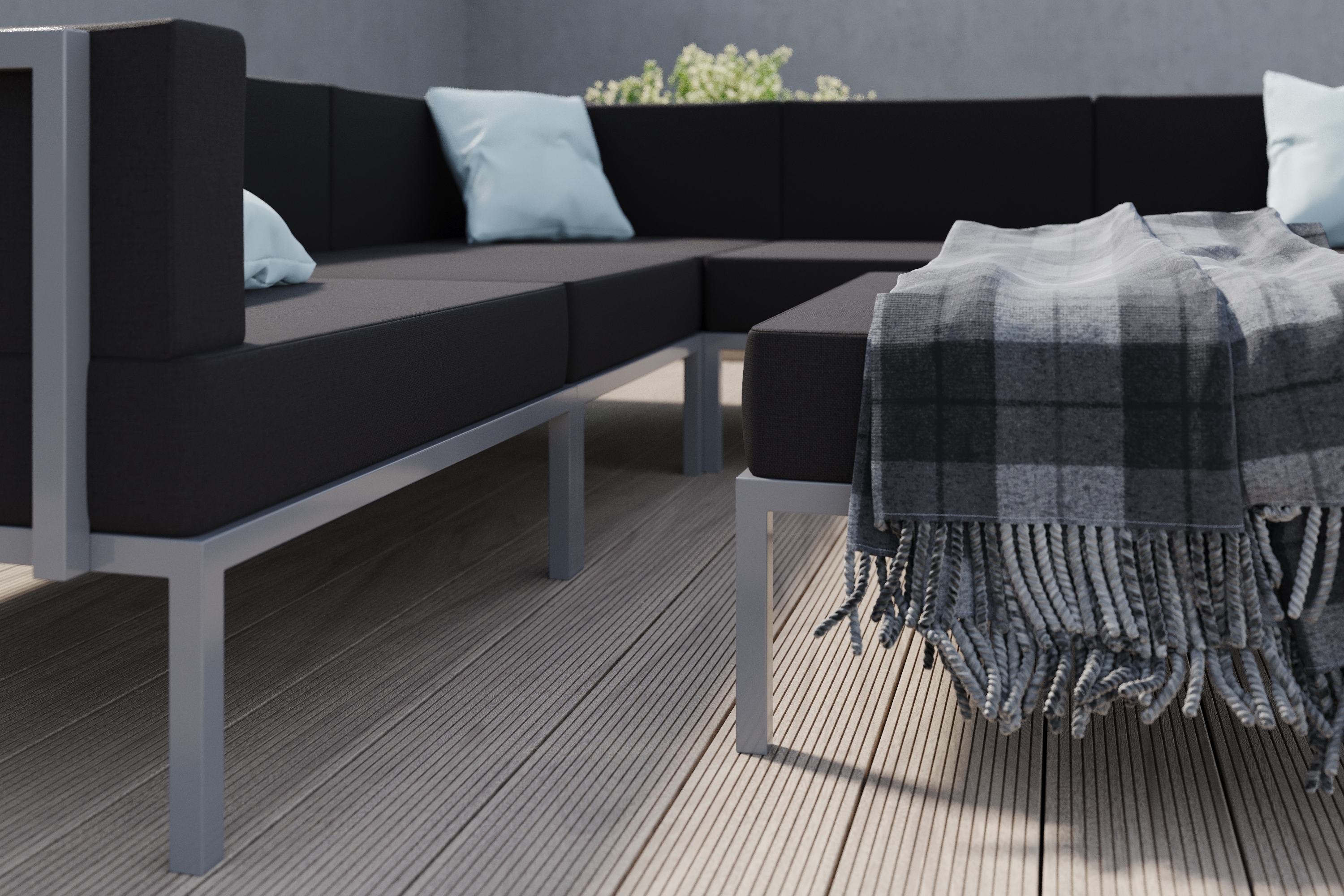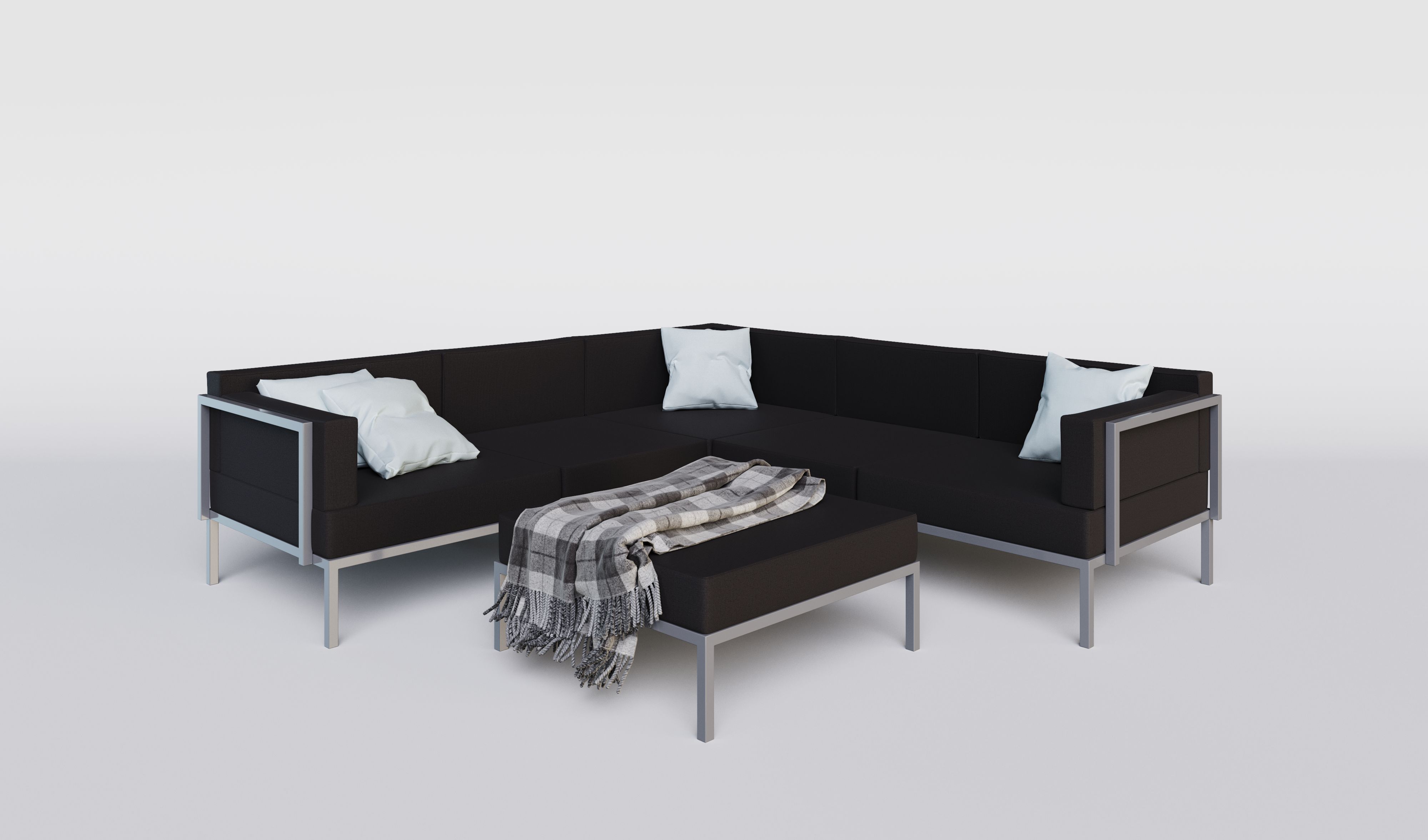 Материалы и цвета: каркас мебели выполнен из алюминия с порошковым покрытием серебряного цвета, подушки спинки и сидений изготовлены из специальной пены, пропускающей воду, обшиты уличной тканью черного цвета, толщина подушек 12 см, дополнительно в комплекте идут 3 декоративные подушки белого цвета (40 Х 40 см).