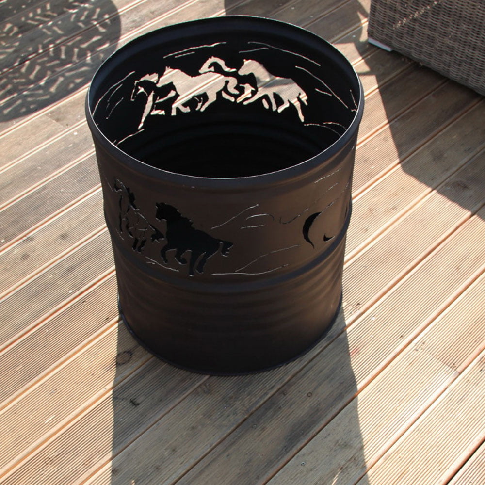 Бочка для костра firecup лошади, уличное оборудование. Оригинальная наружность Бочка для костра Firecup Loshadi выглядит не просто как бочка, ведь над ней постарался профессиональный мастер. Вручную на поверхности бочки из стали вырезаны лошади. Необычный и в то же время привлекательный дизайн помогает конструкции хорошо вписываются в любую окружающую обстановку и сразу украшать ее. Прочность и надежность Данная бочка сделана из черной стали высокого качества, которая дополнительно покрыта огнеустойчивой краской черного цвета. Благодаря этому бочка отличается длительным сроком службы, а толстые стенки хорошо распределяют тепло по всей поверхности кострища и равномерно отдают его в окружающую атмосферу. Легкость в транспортировке Бочка для костра Firecup Loshadi отлично поддается перемещению – ее можно катить по земле, либо поместить в багажник легкового автомобиля и транспортировать в любое нужное место, например, за город или на природу. Внутри бочки в момент перевозки можно поместить другие вещи, чтобы использовать максимум пространства. Безопасный костер Загрузив в бочку древесный уголь либо древесину можно не беспокоиться о пожаробезопасности – огонь не сможет покинуть пределы конструкции. Перевернуть бочку тоже не получится – ни ветру, ни случайно мимо прошедшему человеку, так как кострище устойчиво и массивно. Искры также не смогут выбраться наружу. Материал Сталь Толщина материала, мм 1,5 Страна производства Россия Покрытие Термостойкая краска Высота, мм 600