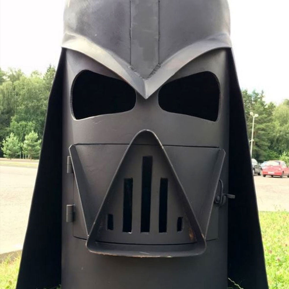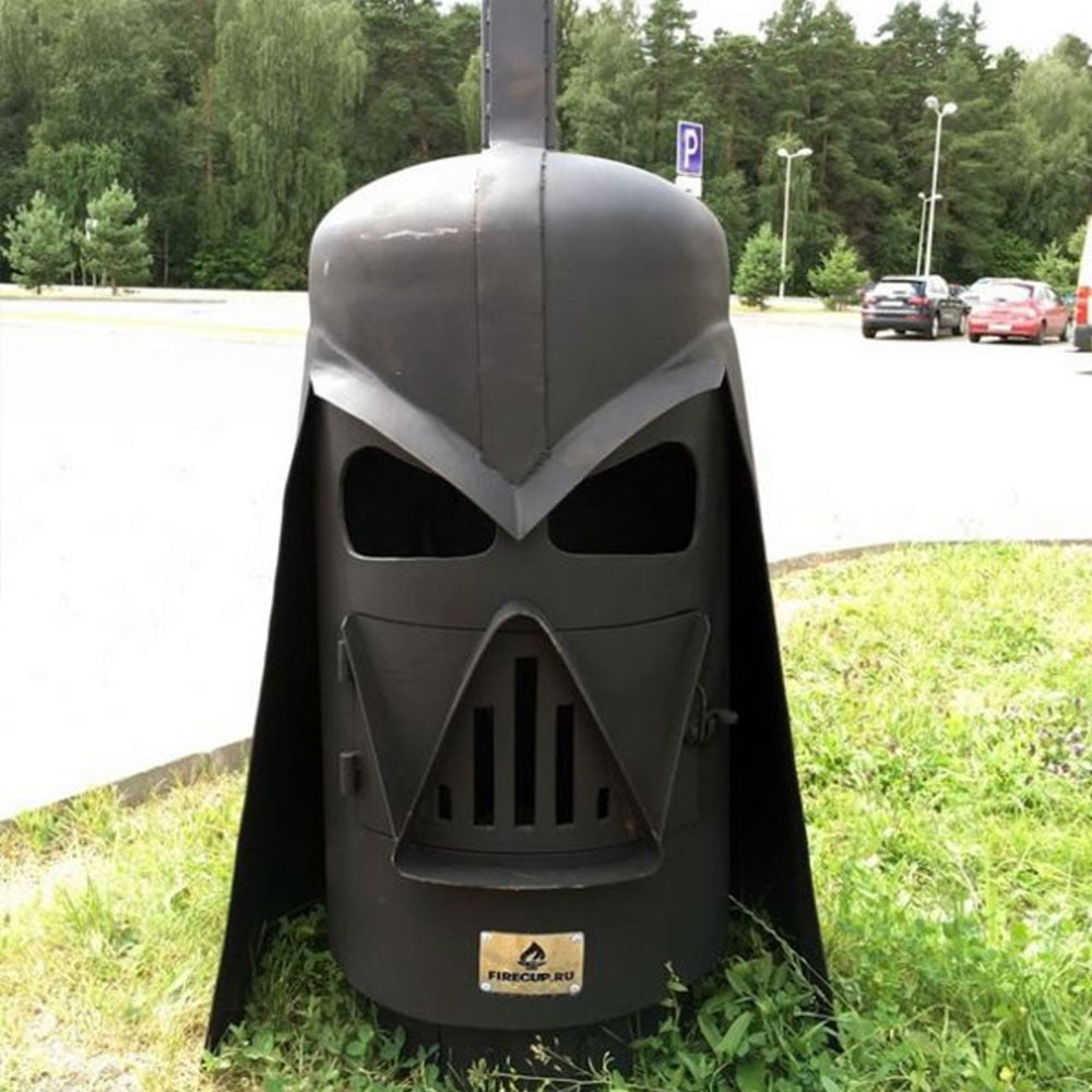 Уличный очаг firecup дарт вейдер, уличное оборудование. Необычный звездный дизайн Уличный очаг Дарт Вейдер Firecup – это идеальный очаг для поклонников вселенной Звездных Войн. Очаг выполнен в форме шлема одного из главных антагонистов вселенной – Дарта Вейдера. Во время горения костра отверстия для глаз и рта будут светиться ярким пламенем, согревая при этом вас и вашу большую компанию. Прочно и надежно! Очаг для установки на улице изготовлен из толстой черной стали, которая отличается высокой прочностью и хорошей способностью равномерно отдавать тепло в окружающую среду. Дополнительно конструкция очага покрыта огнеупорной краской, которая не потеряет свою привлекательность даже через несколько лет. Удобство использования Загрузка топлива в уличный очаг Дарт Вейдер Firecup производится через отсек, на котором установлена дверца с прорезями. Через этот же отсек можно очистить уличный очаг от остатков отработанного топлива – дров или угля. Чтобы вытрусить золу, не придется переворачивать тяжелую конструкцию, что еще один плюс очага. Максимальная устойчивость Благодаря внушительному весу и форме конструкции с широким основанием, уличный очаг не получится опрокинуть ни человеку, ни сильному порыву ветра. Распространение огня жестко ограничено стенками самого очага – можно не беспокоиться о том, что пламя перекинется на прилежащие к конструкции объекта. Материал Сталь Толщина материала, мм 6 Комплектация Кочерга, совок Страна производства Россия Покрытие Термостойкая краска