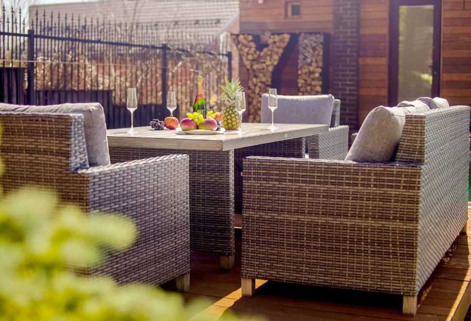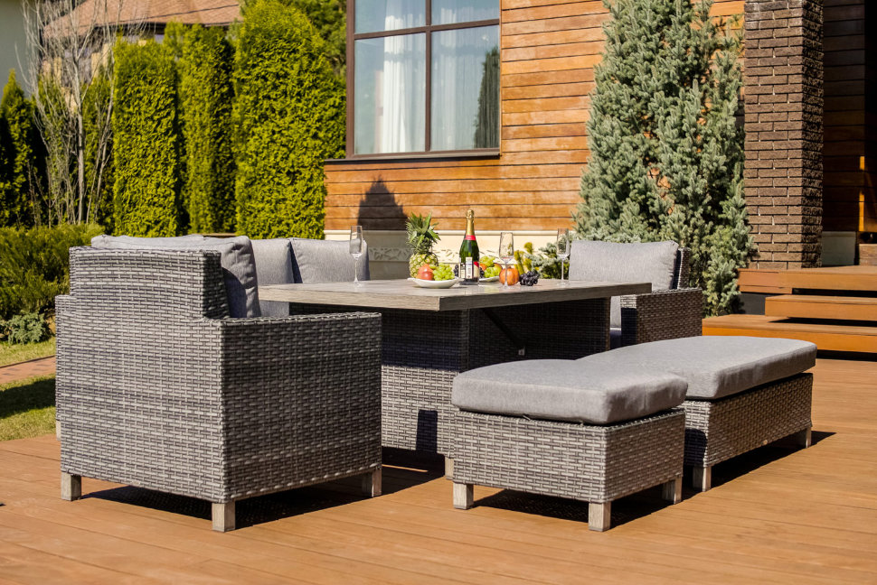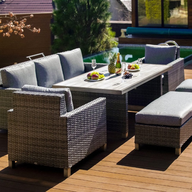 Обеденная группа lite palermo, садовая мебель. Каркас кресел, дивана и пуфика изготовлены из алюминия, легкий, прочный металл, совершенно не боится коррозии. Благодаря каркасу, изготовленному из алюминия, комплект мебели выдерживает большой вес. Комплектация: обеденный стол, два кресла с подушками, диван (трехместный) с подушкой на сидении и тремя подушками на спинке, два пуфика разного размера с мягкими подушками (115. 5 x 58 x 33 см и 58 x 58 x 33 см). Диван, см 197 X 82. 5 X 84. 5 Кресло, см 76 X 82. 5 X 84. 5 Обеденный стол, см 170 X 100 X 70 Пуфик, см 115. 5 X 58 X 33 Материал каркаса Всепогодный алюминий