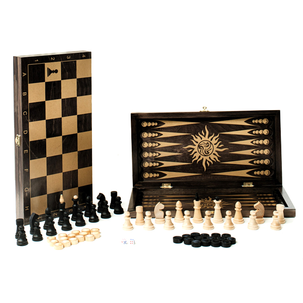 Игра 3в1 малая венге, рисунок золото с обиходными деревянными шахматами &q. Что в коробке Доска; 32 фигуры; 30 фишек; 2 кубика. Игра 3в1 малая венге, рисунок золото с обиходными деревянными шахматами Объедовские Классика (400*200*40). Прекрасный игровой комплект 3-в-1. С его помощью вы можете осуществить любое своё желание: сыграть в шахматы или в шашки, а можно и в нарды. Дизайн набора притягателен сочетанием цвета венге и золота. Дополнительный декор отсутствует, всё очень функционально и удобно. Вы играете в шахматы или шашки на разметке клетками, а перевернув доску, сможете сыграть в нарды. Фигуры и фишки деревянные, ими очень приятно играть. Это отличный вариант подарка любому человеку по любому поводу. Каждый обладатель этого набора оценит его красоту и функциональность.