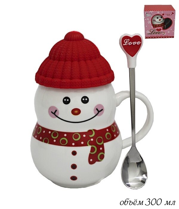Кружка с силик. крышкой и ложкой снеговик в под.уп. фарфор