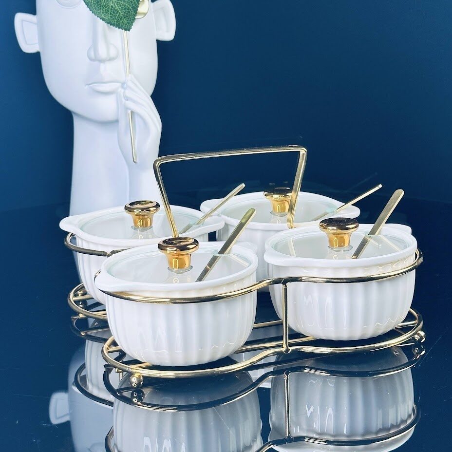Набор из 4 баночек для специй с ложками на подставке в под.уп. фарфор