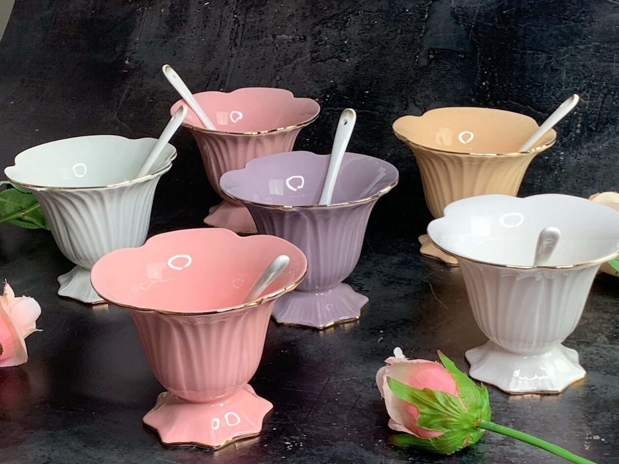 Великолепные креманки из фарфора, форма бокала в виде раскрывшегося цветка тюльпана. Все креманки разных пастельных тонов, обводка золотом на ножке и по краю бокала.