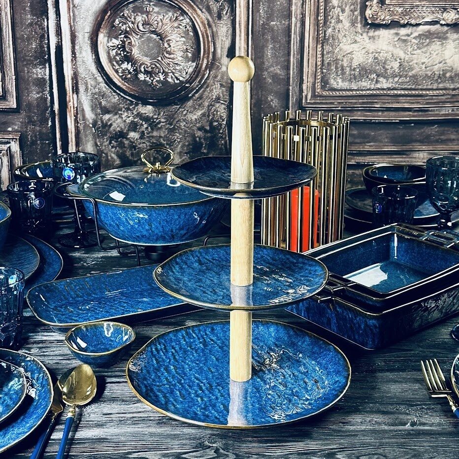 Трехъярусная этажерка aquamarine в подарочной упаковке фарфор lenardi. Трехъярусная этажерка Диаметр 27,20,16 см высота 39 см Упаковано в подарочную коробку Коллекция AQUAMARINE изготовлена их фарфора, покрыта глянцевой цветной глазурью глубокого синего цвета с вкраплениями. Структура поверхности изделий имеет рельеф. Благодаря прочной и глянцевой глазури посуду легко мыть. Подходит для дома и для ресторанов. Материал: фарфор Можно использовать в микроволновой печи и мыть в посудомоечной машине.  развернуть описание ▼