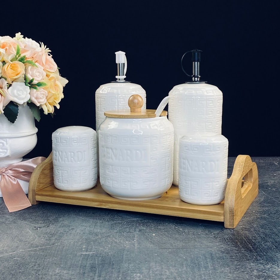 Набор для специй: сахарница,бутылки для масла, 5пр. на подс-ке Bamboo в под.уп. фарфор