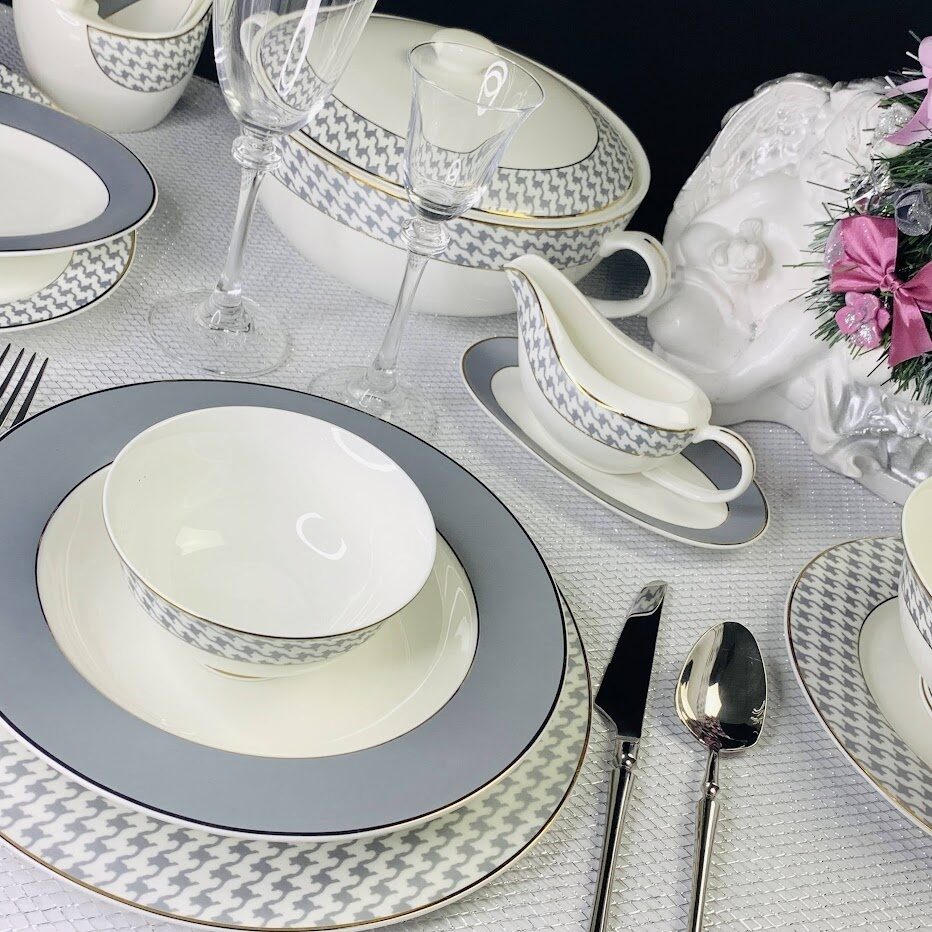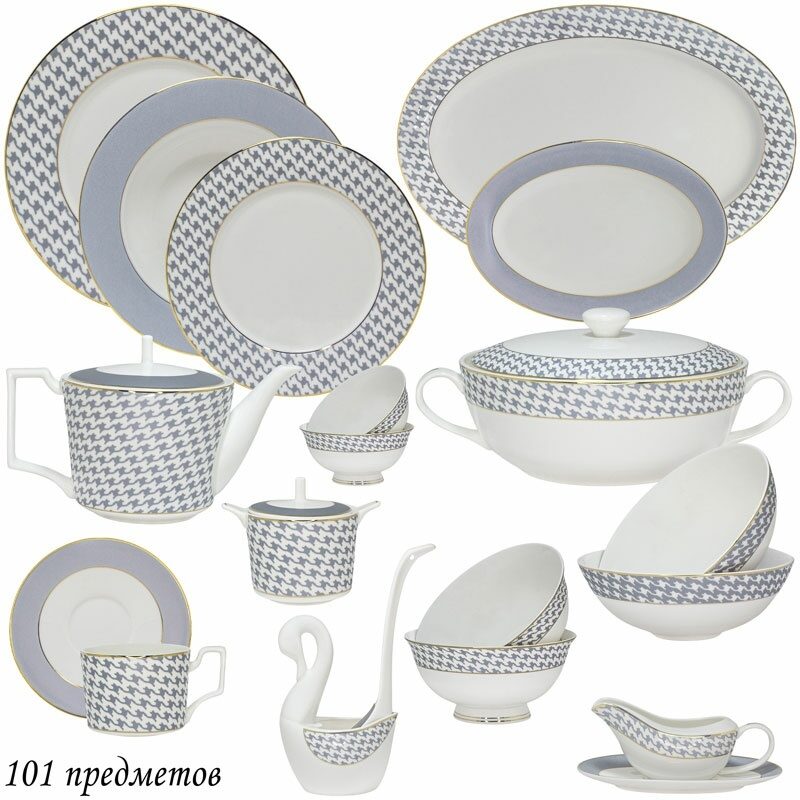Обеденный сервиз 101пр. earl grey в подарочной упаковке костяной фарфор lenardi. Обеденный сервиз 101 предмет Коллекция EARL GREY - тончайший костяной фарфор. Высокое качество нанесения декора, элегантная классическая форма с гладкими краями, модное сочитание серебрянного декора и золотой отводки по краю отличают эту коллекцию от других. Наполнение: 12 шт- тарелки d=26см 12 шт- тарелки d=21,5см 12 шт- тарелки глубокие d=23см 12 шт. салатник 11,5 см 12шт. салатник 18 см 2 шт- блюдо овальное длинна 36см 2 шт- блюдо овальное длинна 23см 2 пр- супник 2 литра-1шт + крышка-1шт 1 шт ложка 1шт подставка под ложку Лебедь 3 шт- салатники d=15,5см 2 пр- соусник-1шт + блюдце-1шт 2пр заварник +крышка 2пр сахарница + крышка 12 шт чашки 12 шт- блюдца Материал: костяной фарфор Не рекомендуется использовать в микроволновой печи и мыть в посудомоечной машине, по причине возможного повреждения золотого декоративного покрытия.  развернуть описание ▼