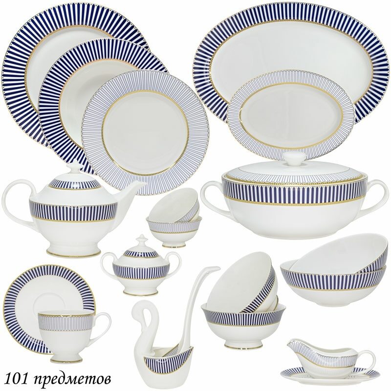 Чайно-обеденный сервиз 101пр. инфанта в подарочной упаковке костяной фарфор lenardi. Наполнение: 12шт тарелки 22 см 12шт тарелки 27 см 12шт тарелка суповая 23 см 12шт салатники 11,5 см 12шт салатники 18 см 4шт салатники 15 см 2шт овальное блюдо 23 см 2шт овальное блюдо 35,5 см 1+1шт супник 1+1шт ложка с подставкой Лебедь 1+1шт соусник с блюдцем 12 шт чашки 250 мл 12шт блюдца 1+1 сахарница с крышкой 1+1 заварник с крышкой  развернуть описание ▼