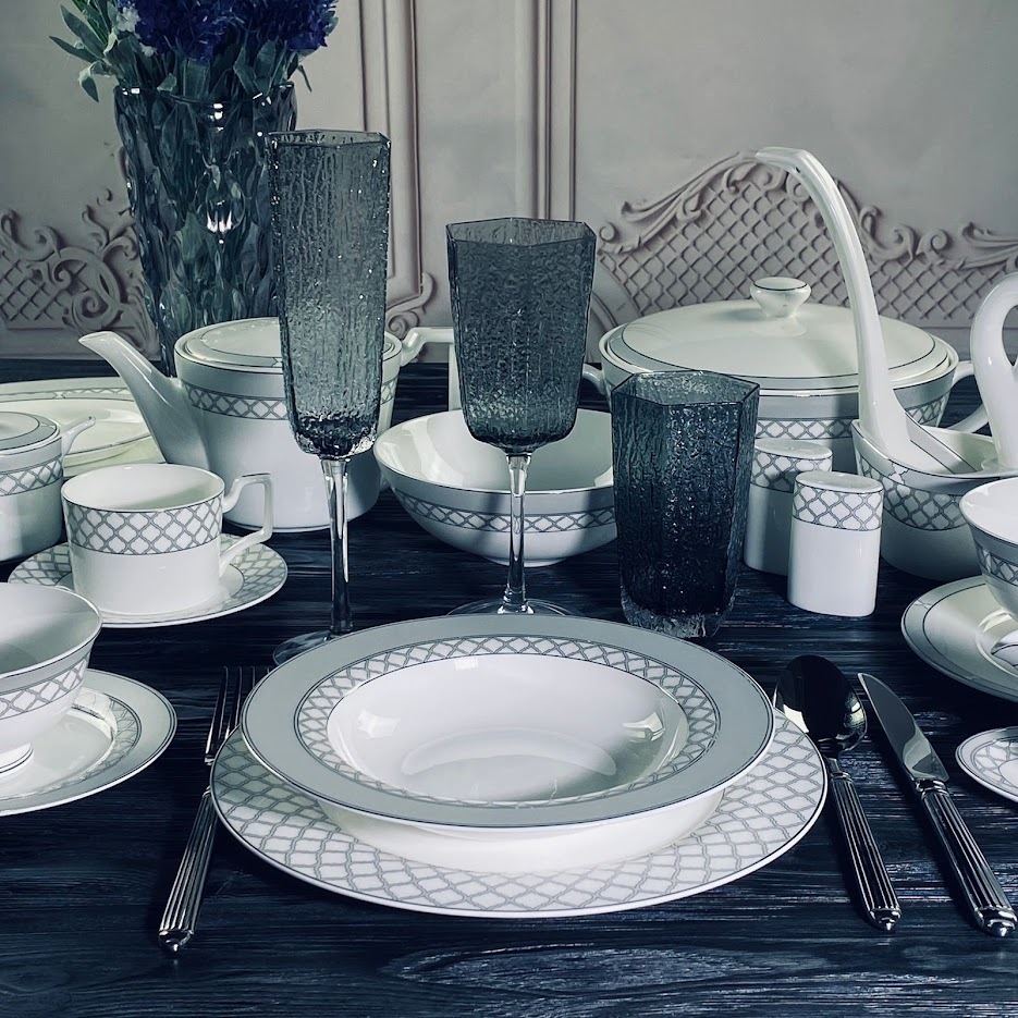 Обеденный сервиз 105пр. версаль серебро в под.уп. костяной фарфор. Наполнение: 12шт тарелки 22 см 12шт тарелки 27 см 12шт тарелка суповая 23 см 12шт салатники 11,5 см 12шт салатники 18 см 4шт салатники 15 см 2шт овальное блюдо 23 см 2шт овальное блюдо 35,5 см 1+1шт супник 1+1шт ложка с подставкой Лебедь 1+1шт соусник с блюдцем 12 шт чашки 250 мл 12шт блюдца 1+1 сахарница с крышкой 1+1 заварник с крышко 4 пр набор соль+перец Изысканная коллекция ВЕРСАЛЬ изготовлена из полупрозрачного костяного фарфора. Изысканная палитра, сочетающая в себе нежные оттенки матового серого цвета и серебряного декора, очаровывает своей глубиной и игрой света. Изящный серебряный края, словно лунный свет, обрамляет тарелки. Утонченный рисунок из выполнен с искусной точностью. Коллекция состоит из предметов сервировка, обеденных, чайных и кофейных сервизов. Материал: фарфор Не рекомендуется использовать в микроволновой печи и мыть в посудомоечной машине, по причине возможного повреждения золотого декоративного покрытия.